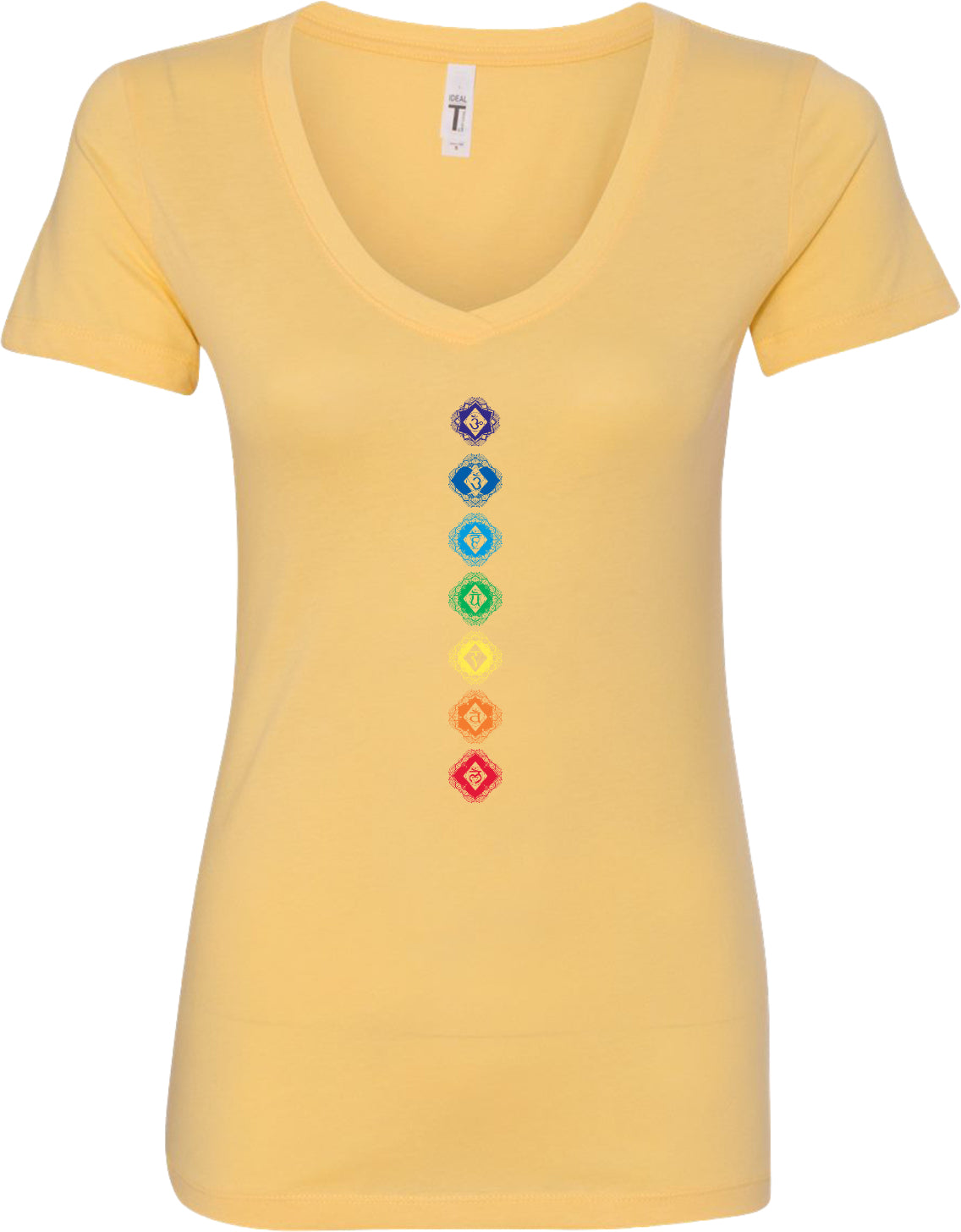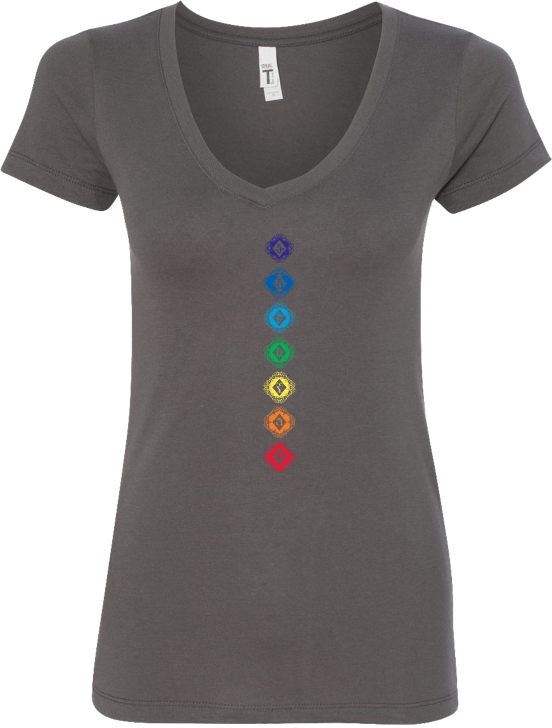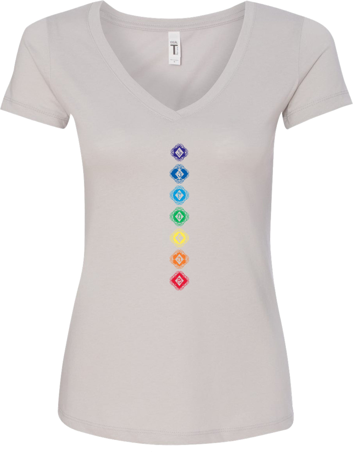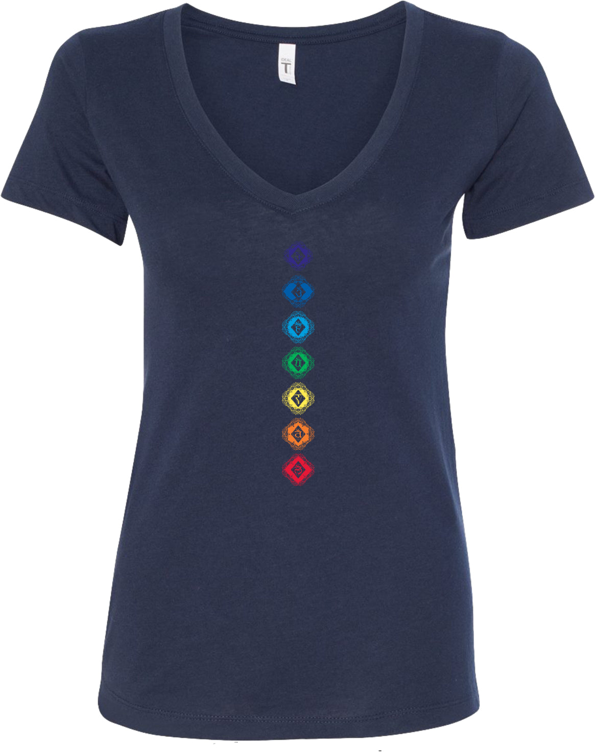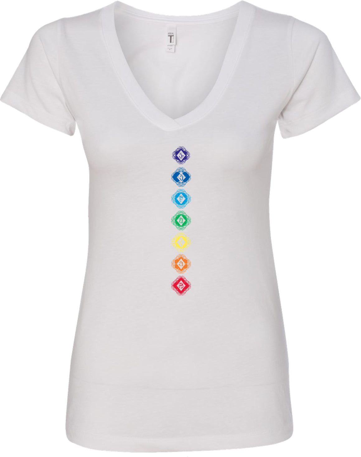 - A ladies blended v-neck t-shirt featuring a cool design of the 7 Chakras in their original colors
