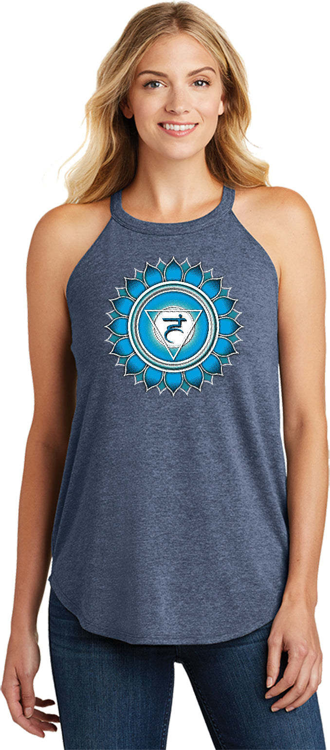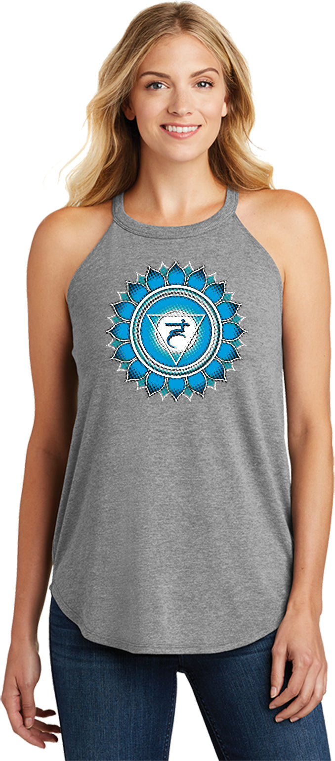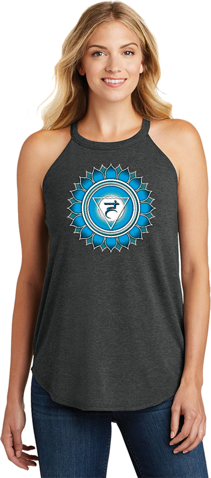 - A ladies tri blend rocker tank top featuring the fifth primary chakra, the throat chakra, Vishuddha
