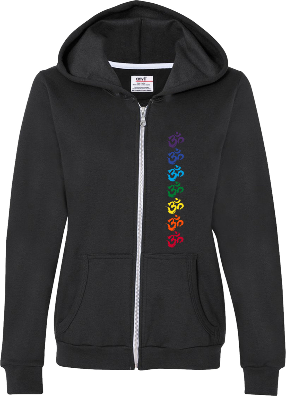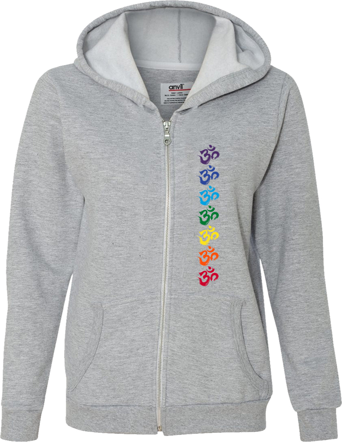 - A ladies full-zip hoodie featuring the 7 sacred aum chakras