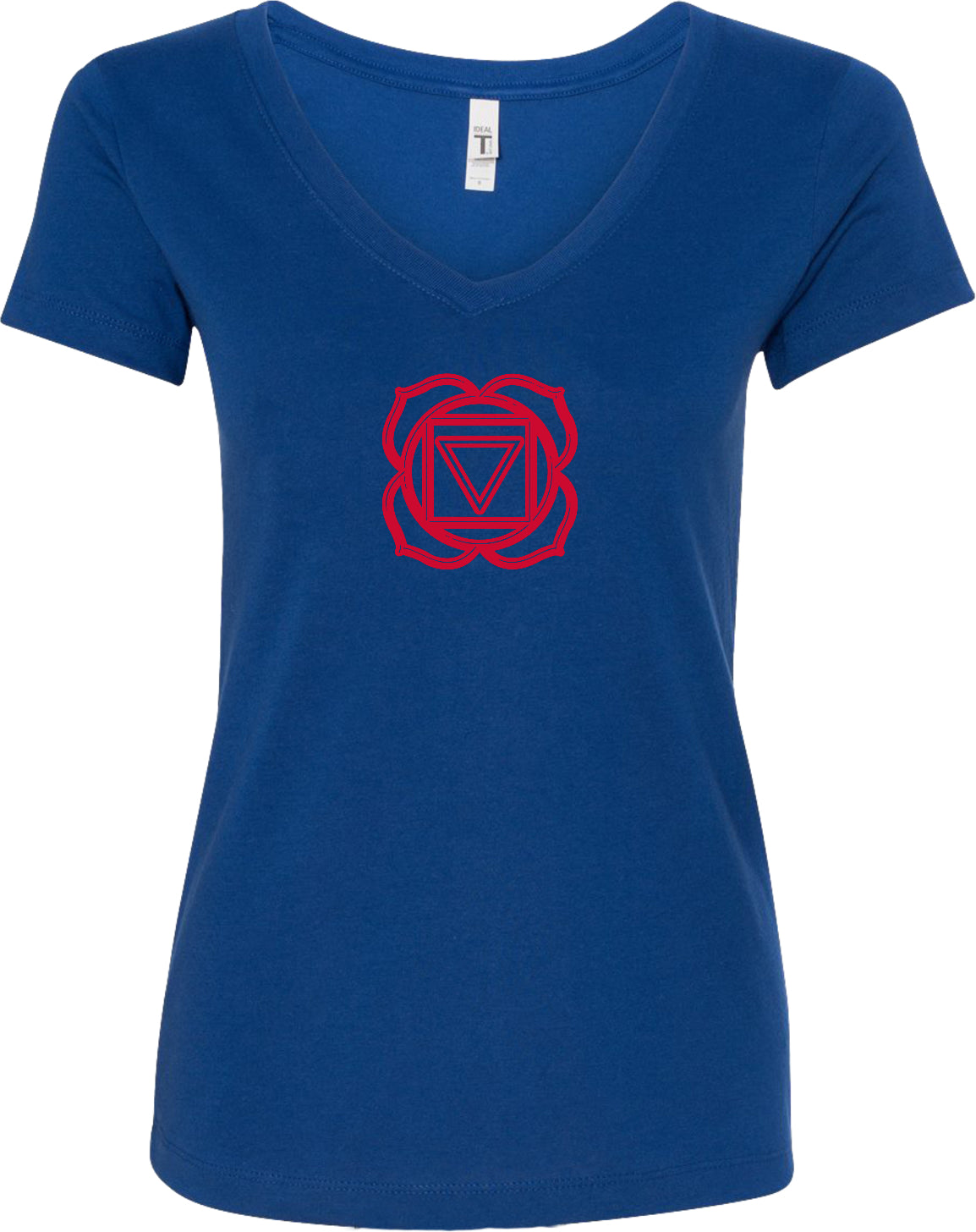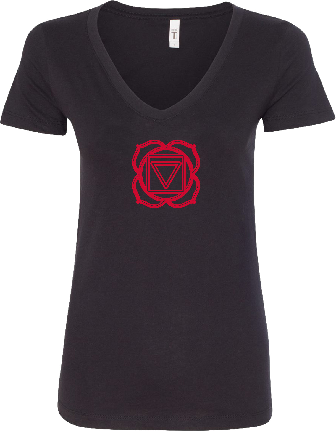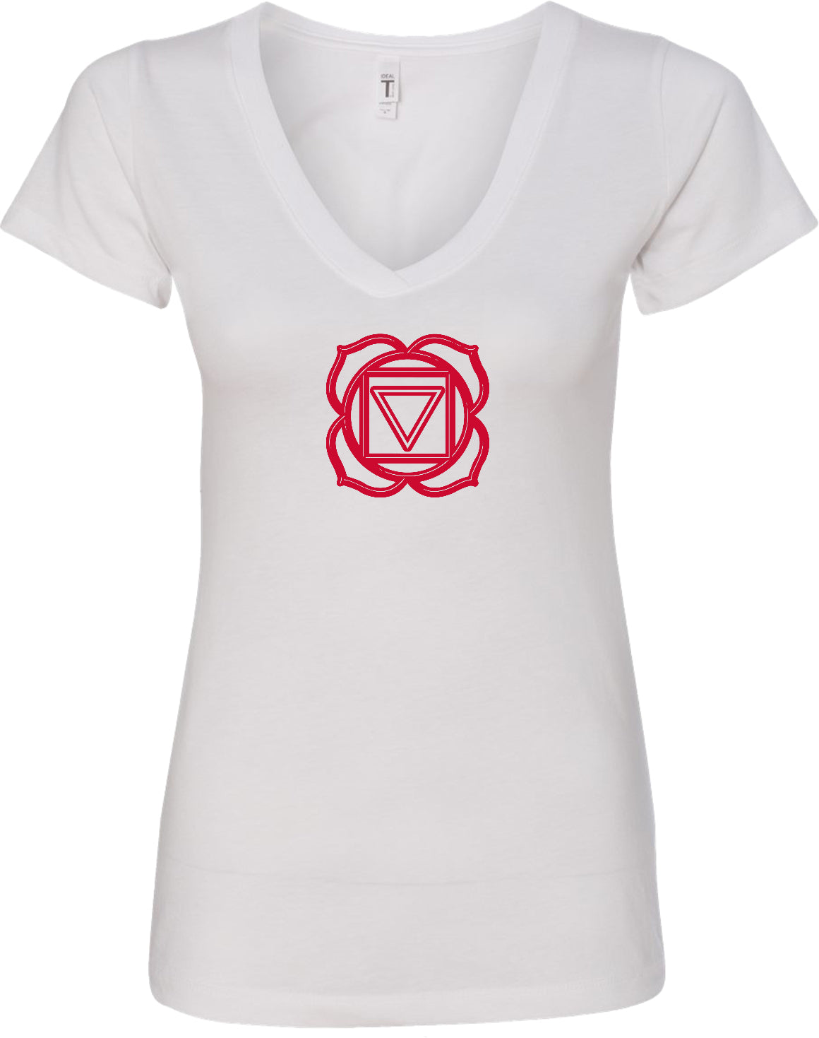 - A ladies ideal v-neck t-shirt featuring muladhara also know as the root chakra