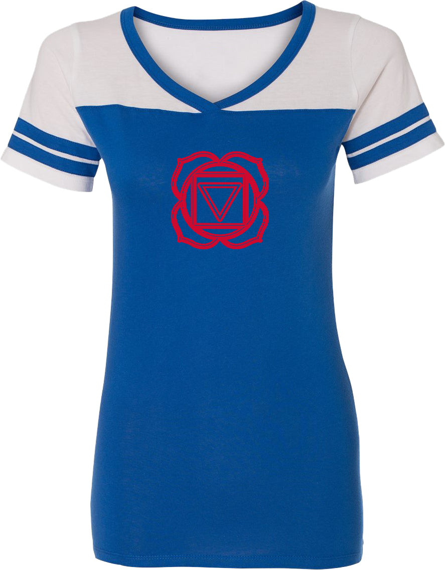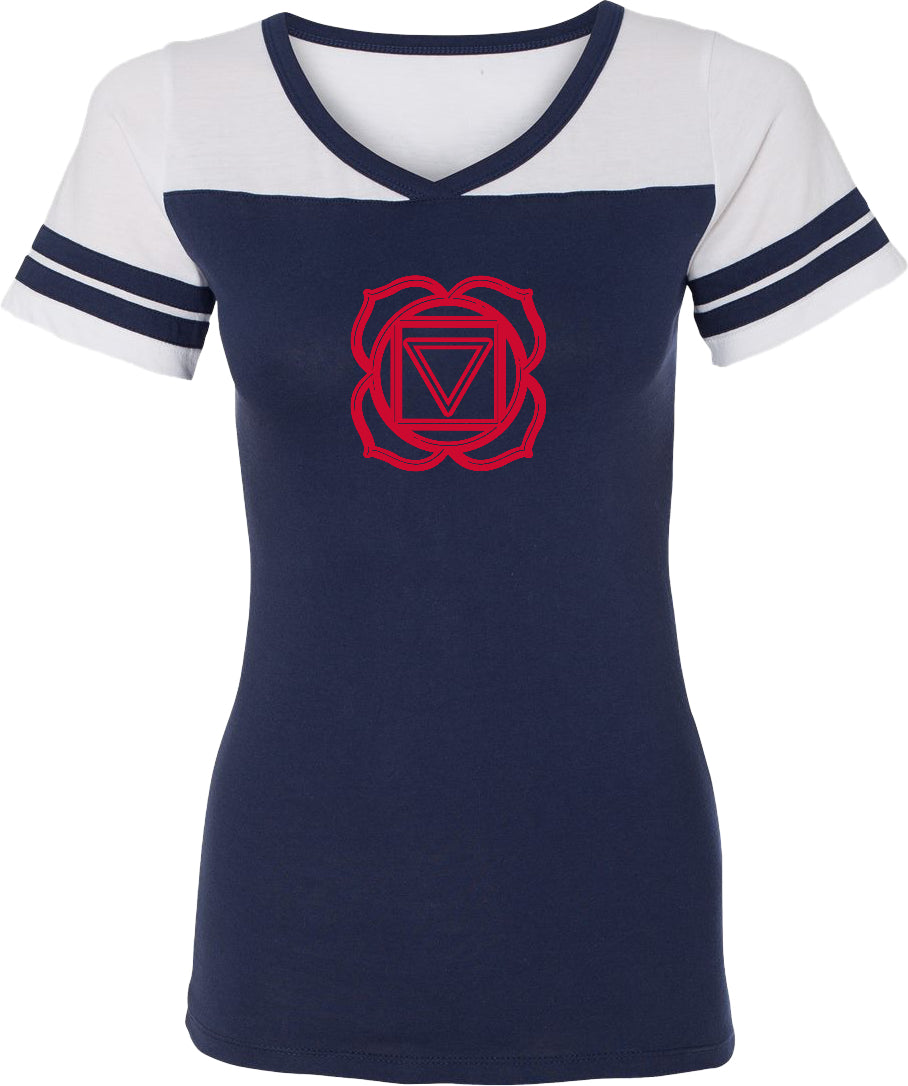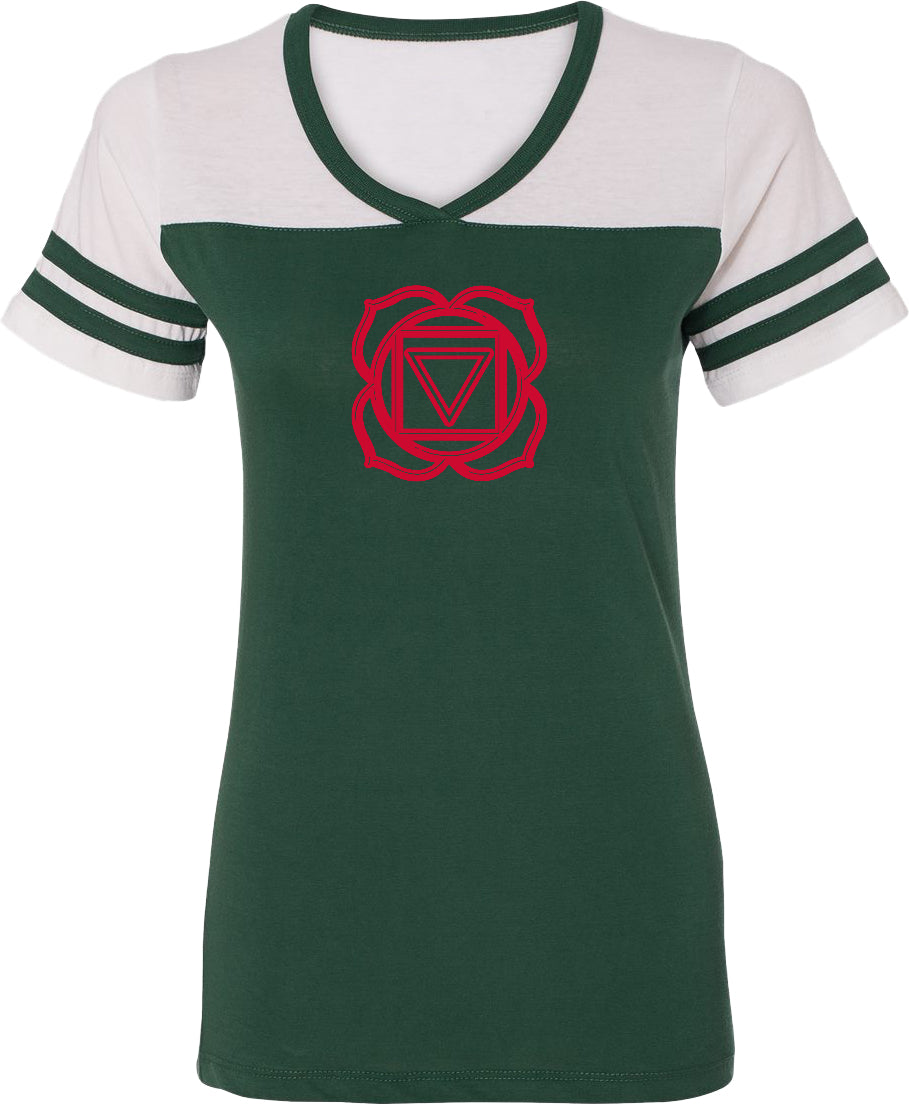 - A ladies powder puff t-shirt featuring muladhara also know as the root chakra
