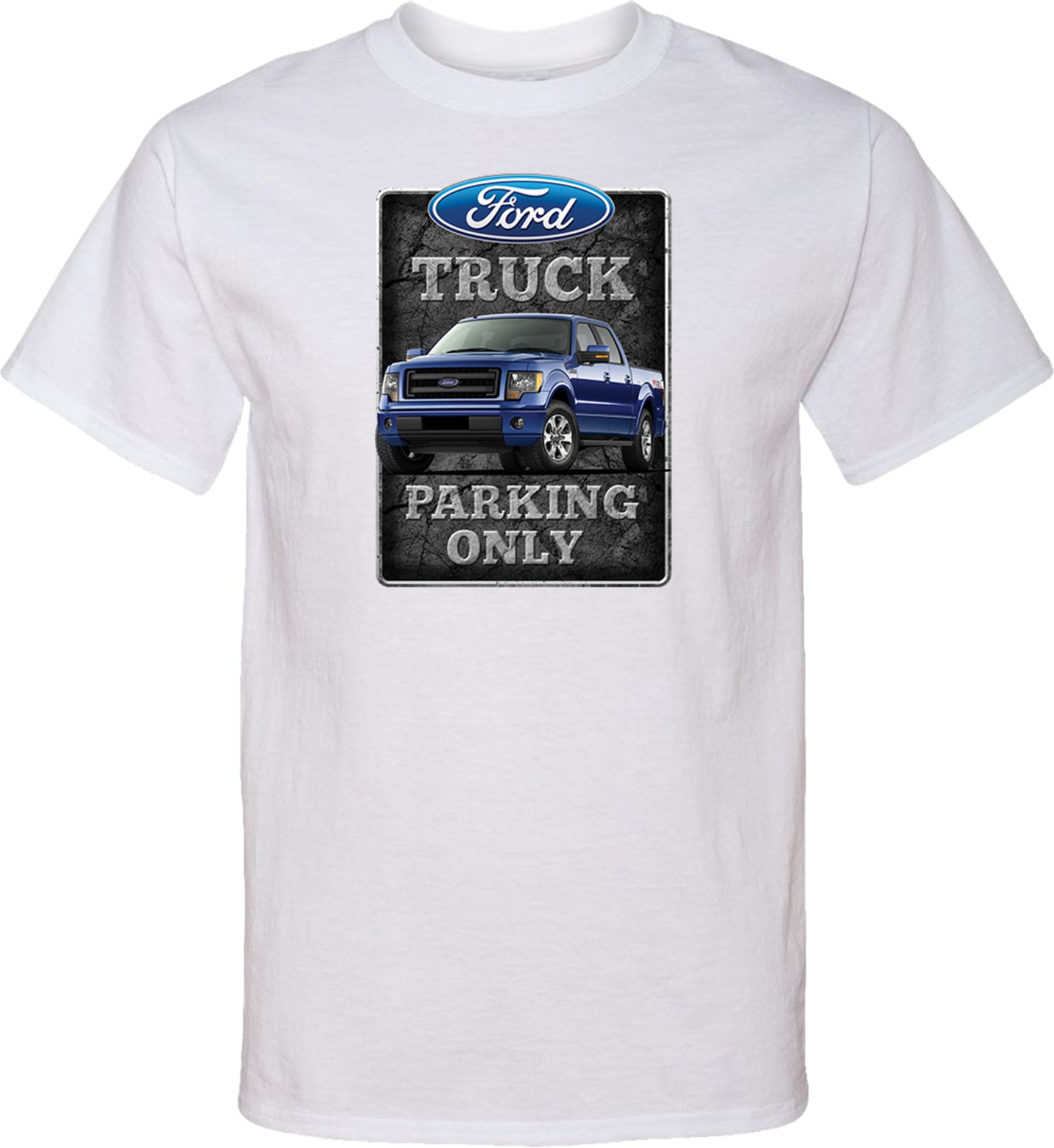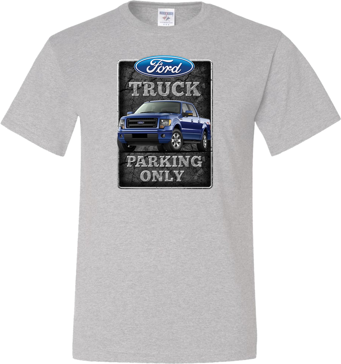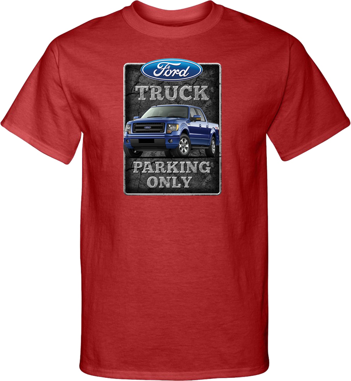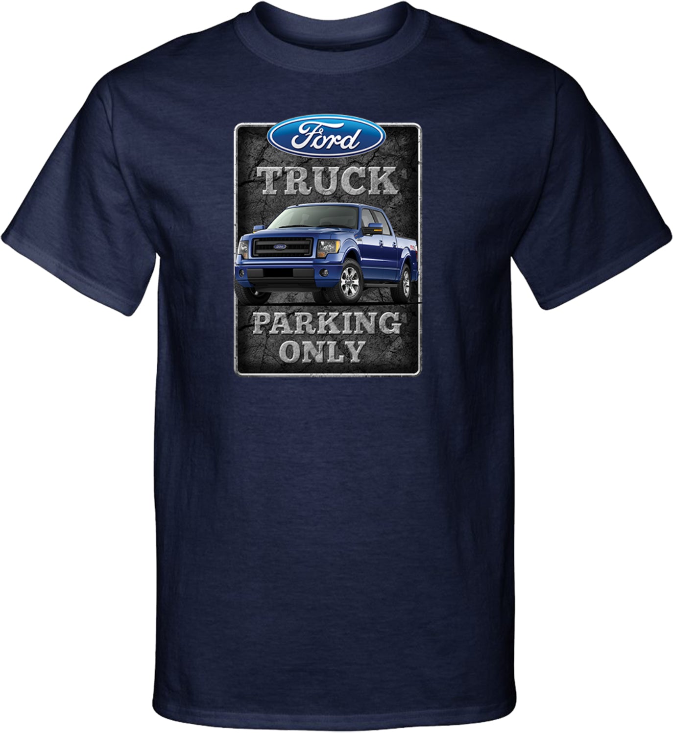- A mens tall t-shirt featuring a blue Ford F-150 garage sign: Ford Truck Parking Only