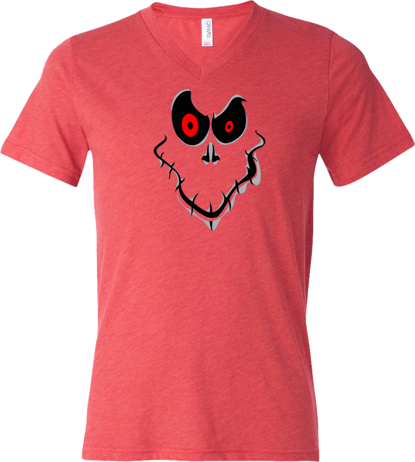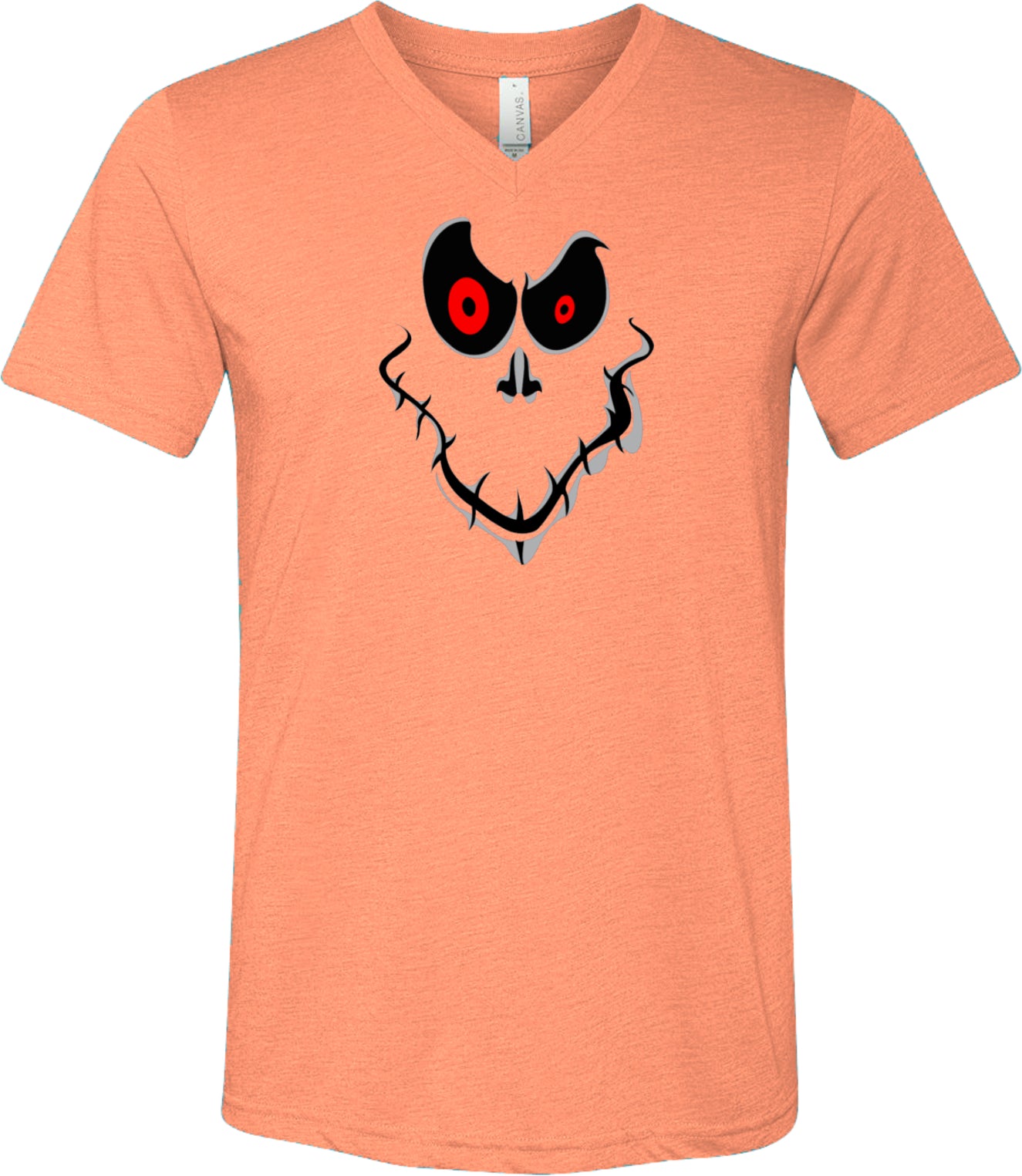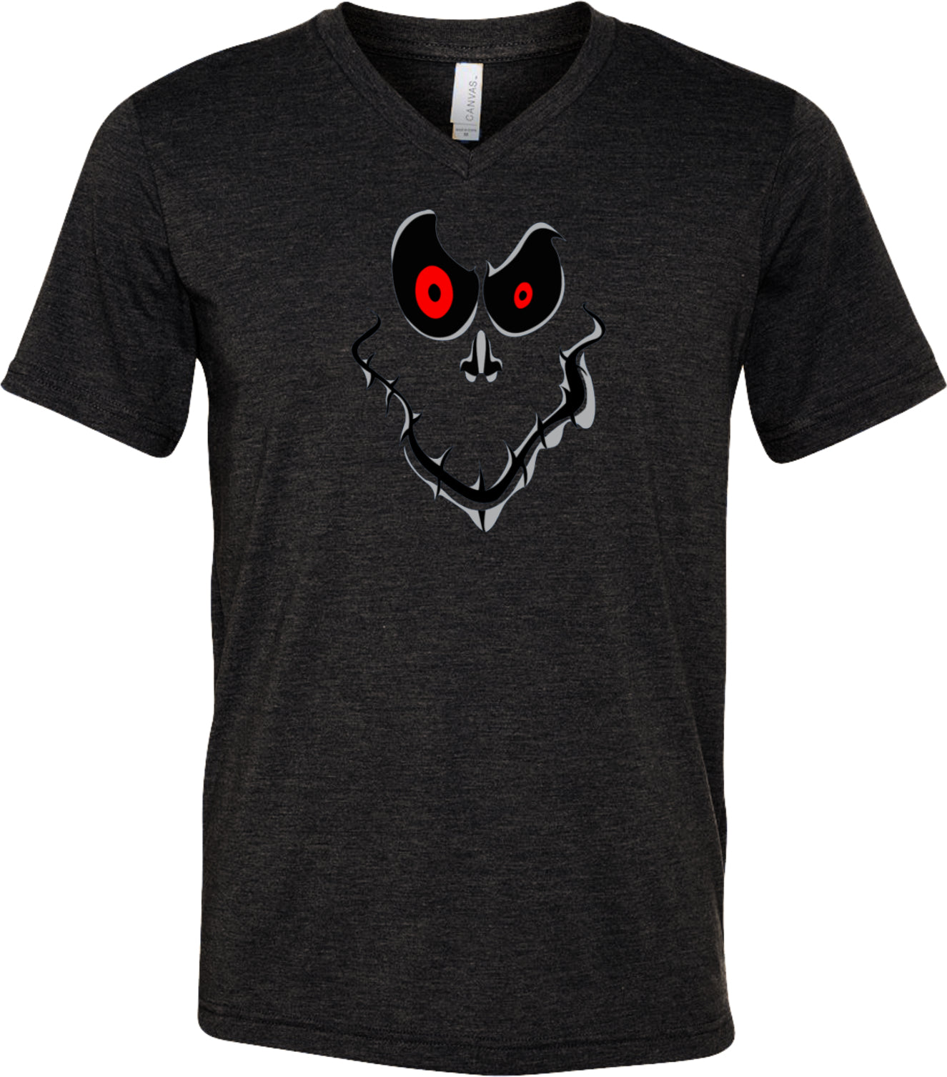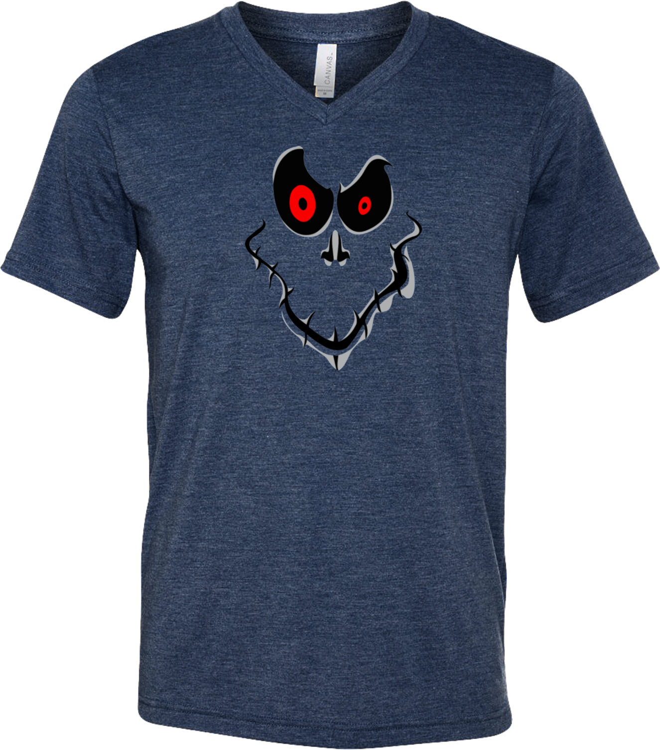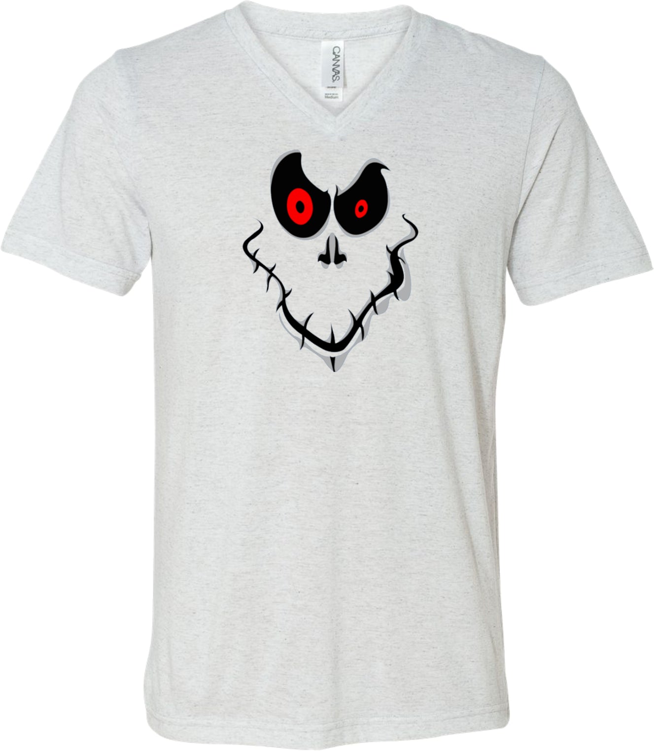 - A halloween tri blend v-neck shirt featuring a ghost face