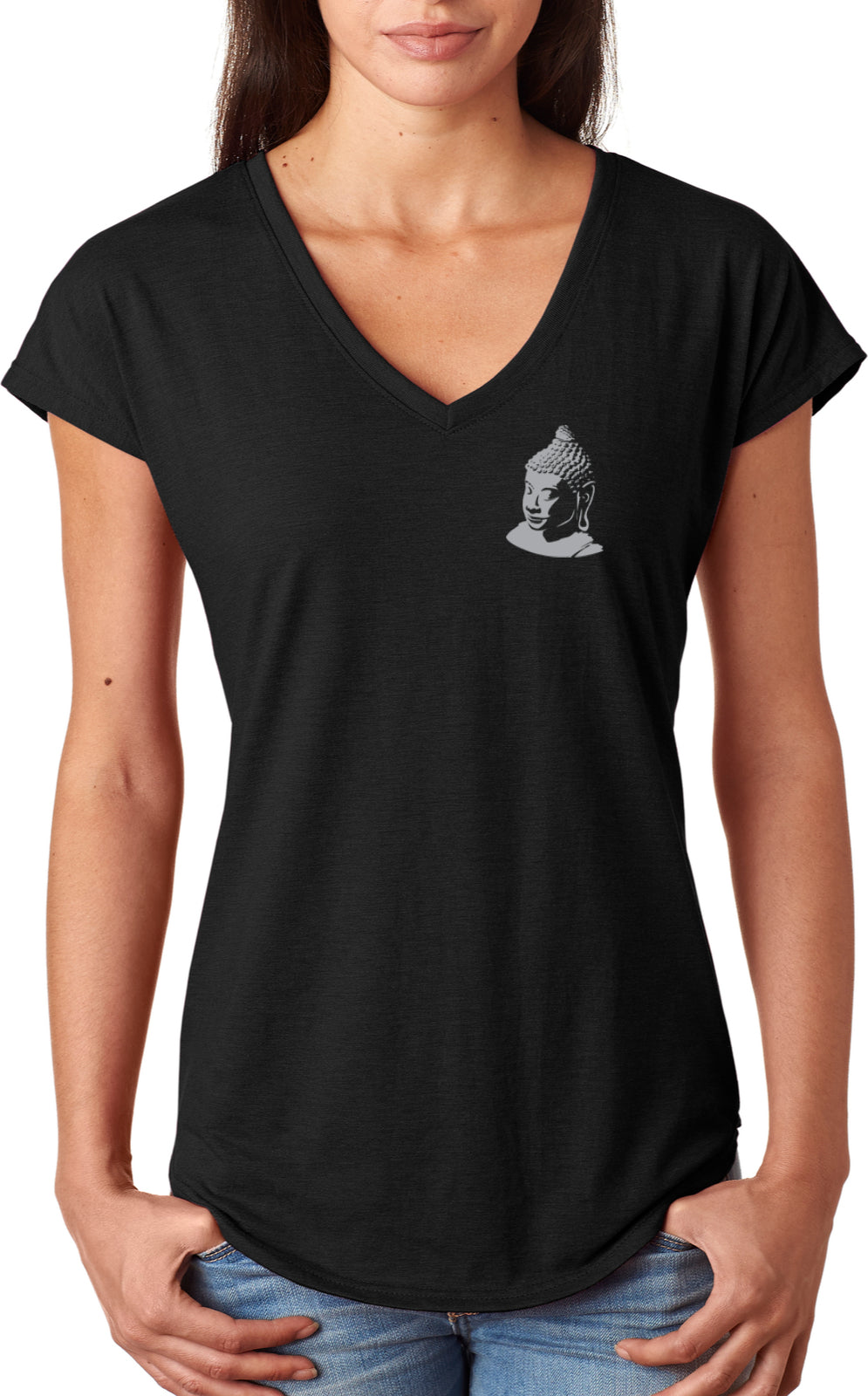 • A ladies tri blend v-neck t-shirt featuring the buddha pocket print