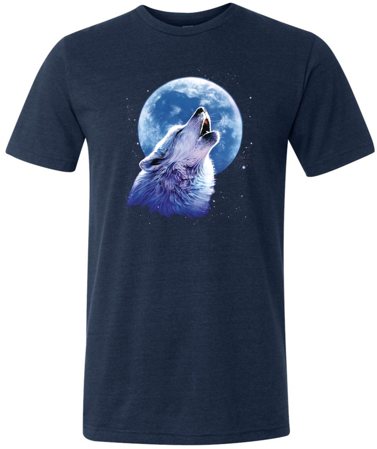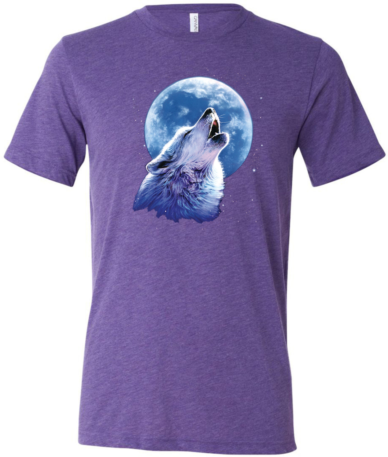 - A mens tri blend t-shirt featuring a wolf howling at the moon