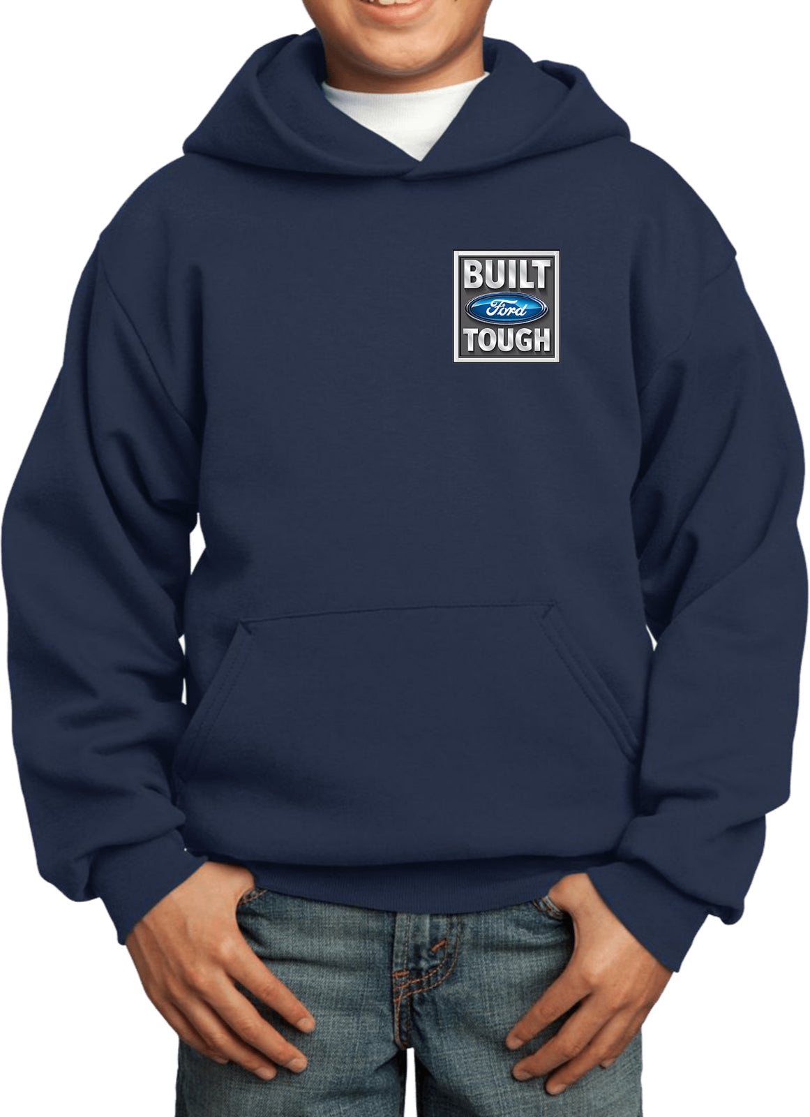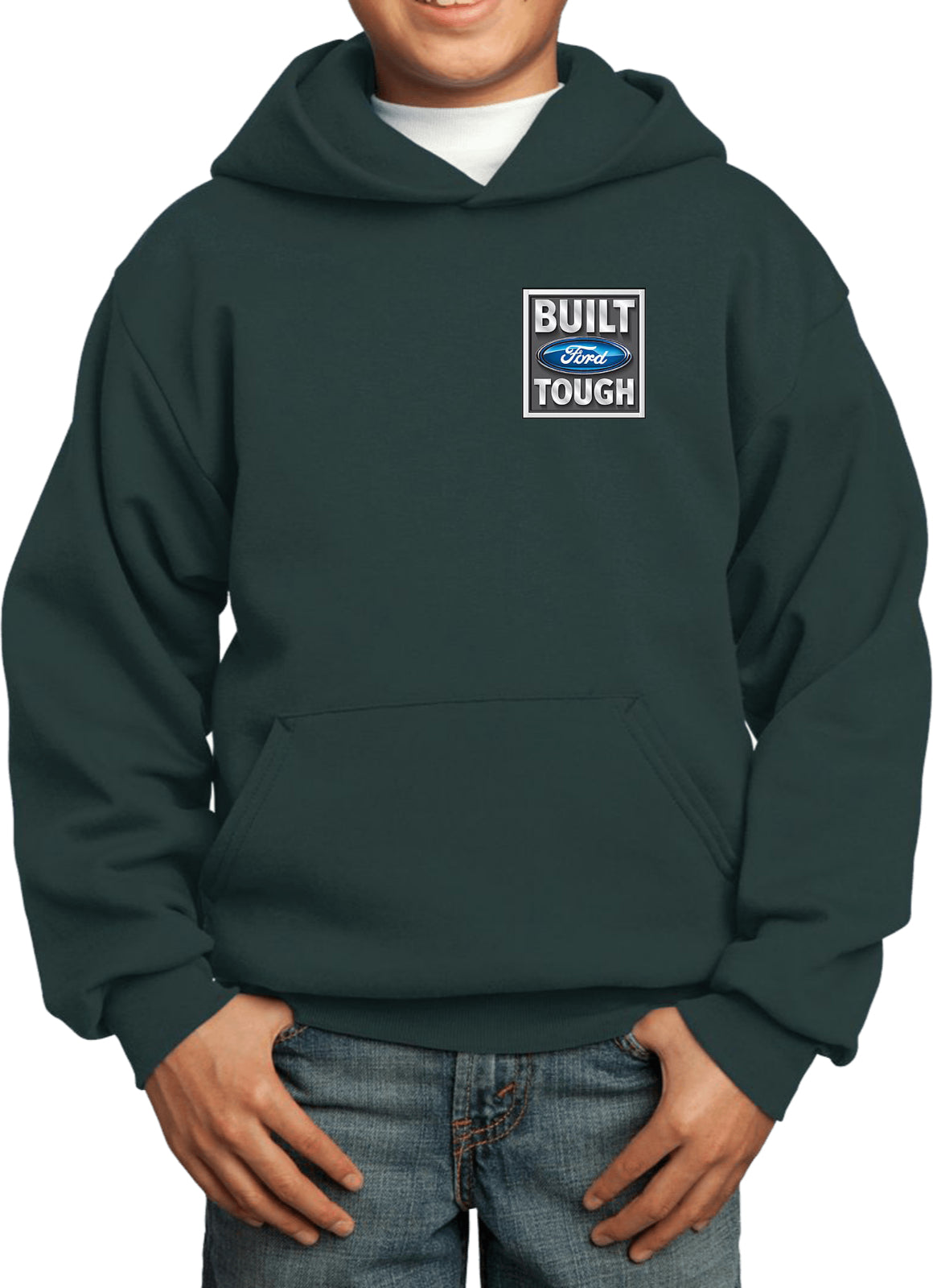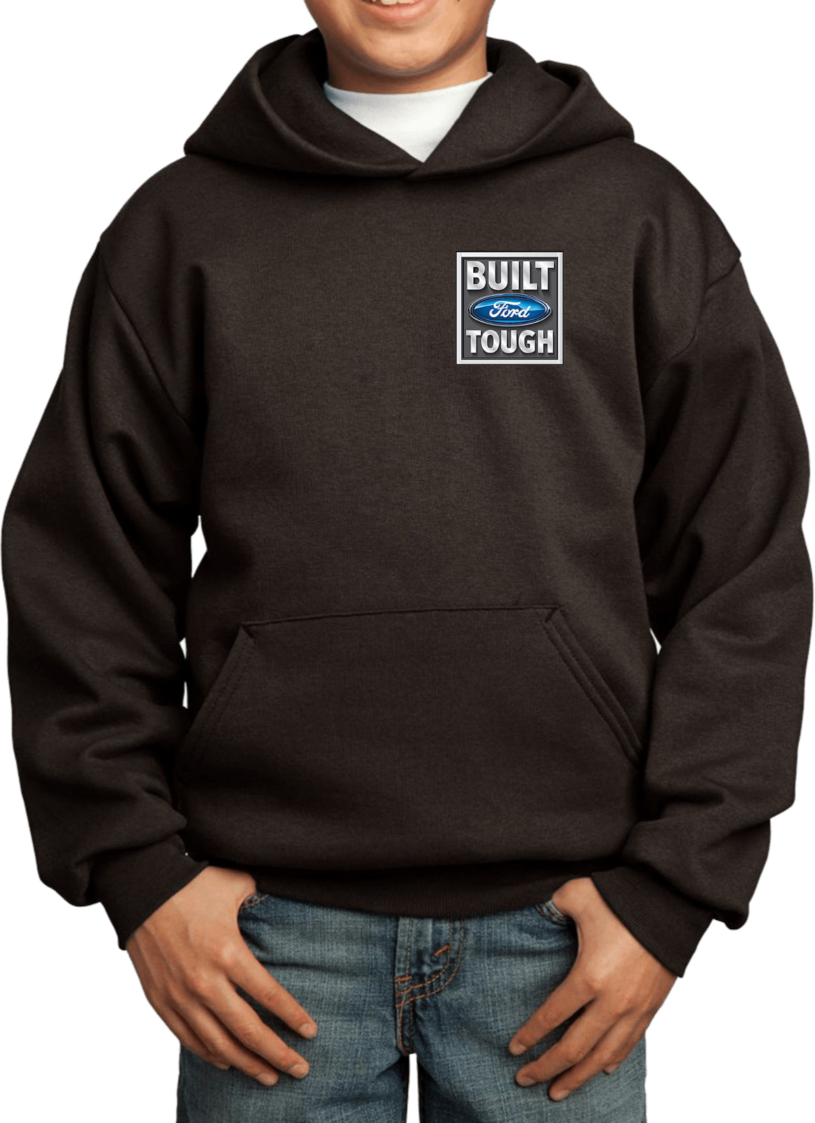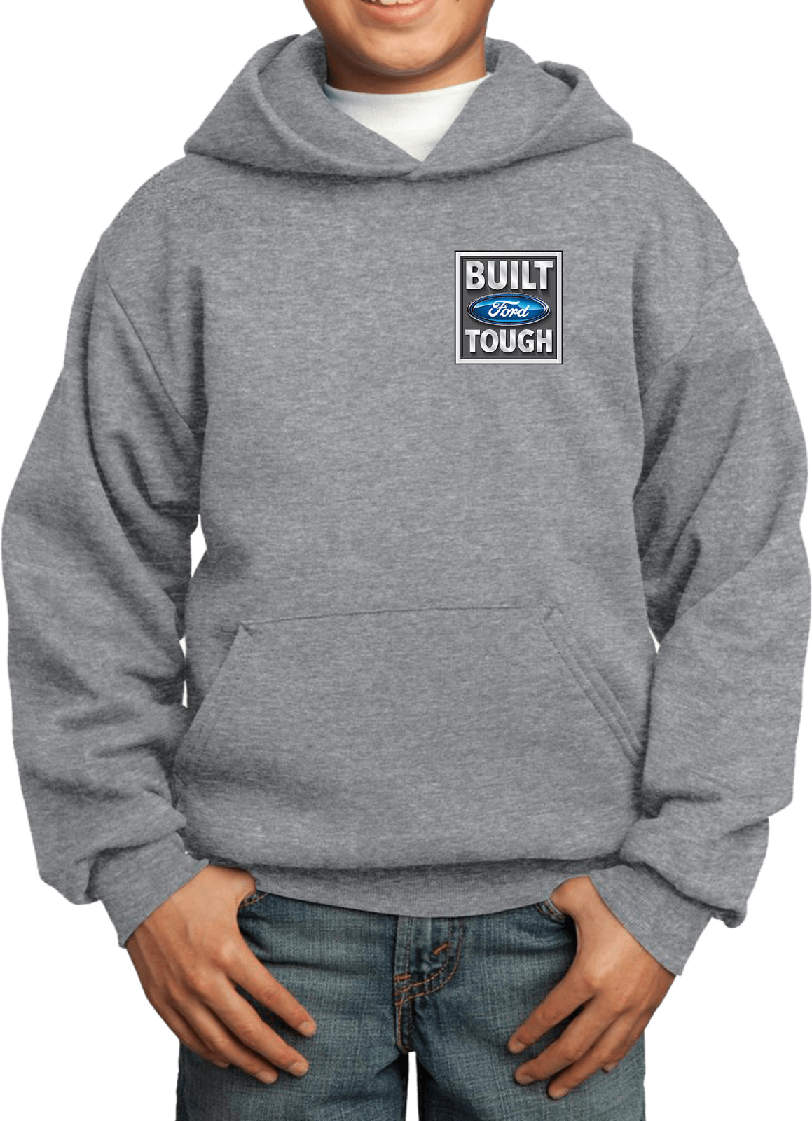 - A youth hoodie featuring the Built Ford Tough logo as a pocket print