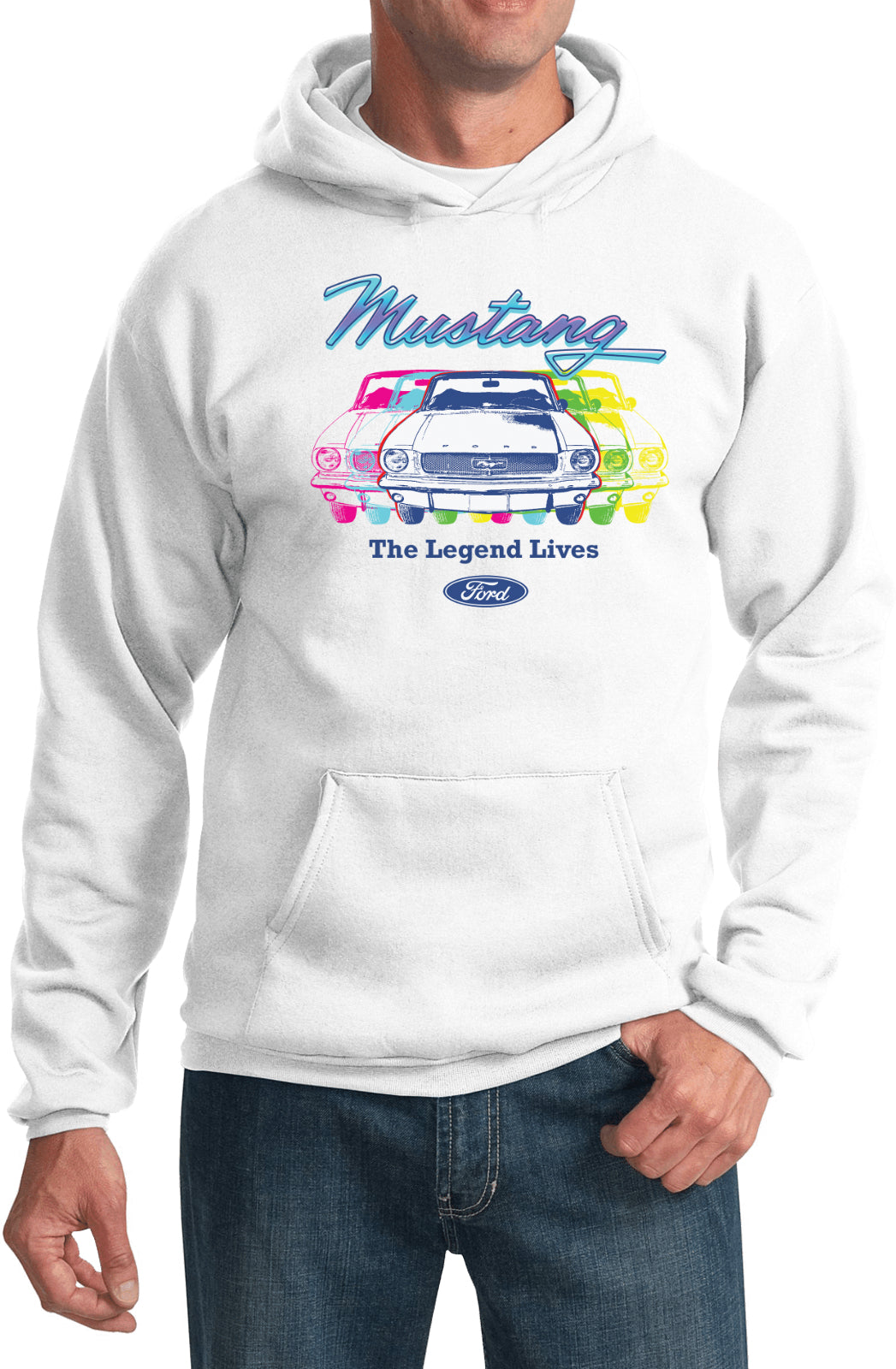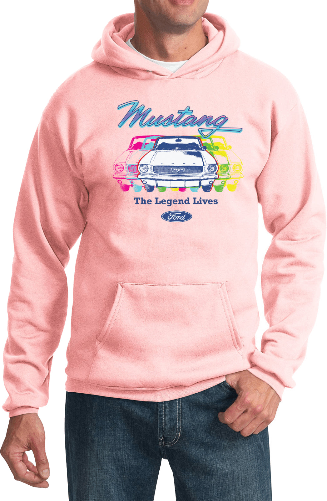 - A pullover hoodie featuring a collage of neon colored Ford Mustang Classic Cars