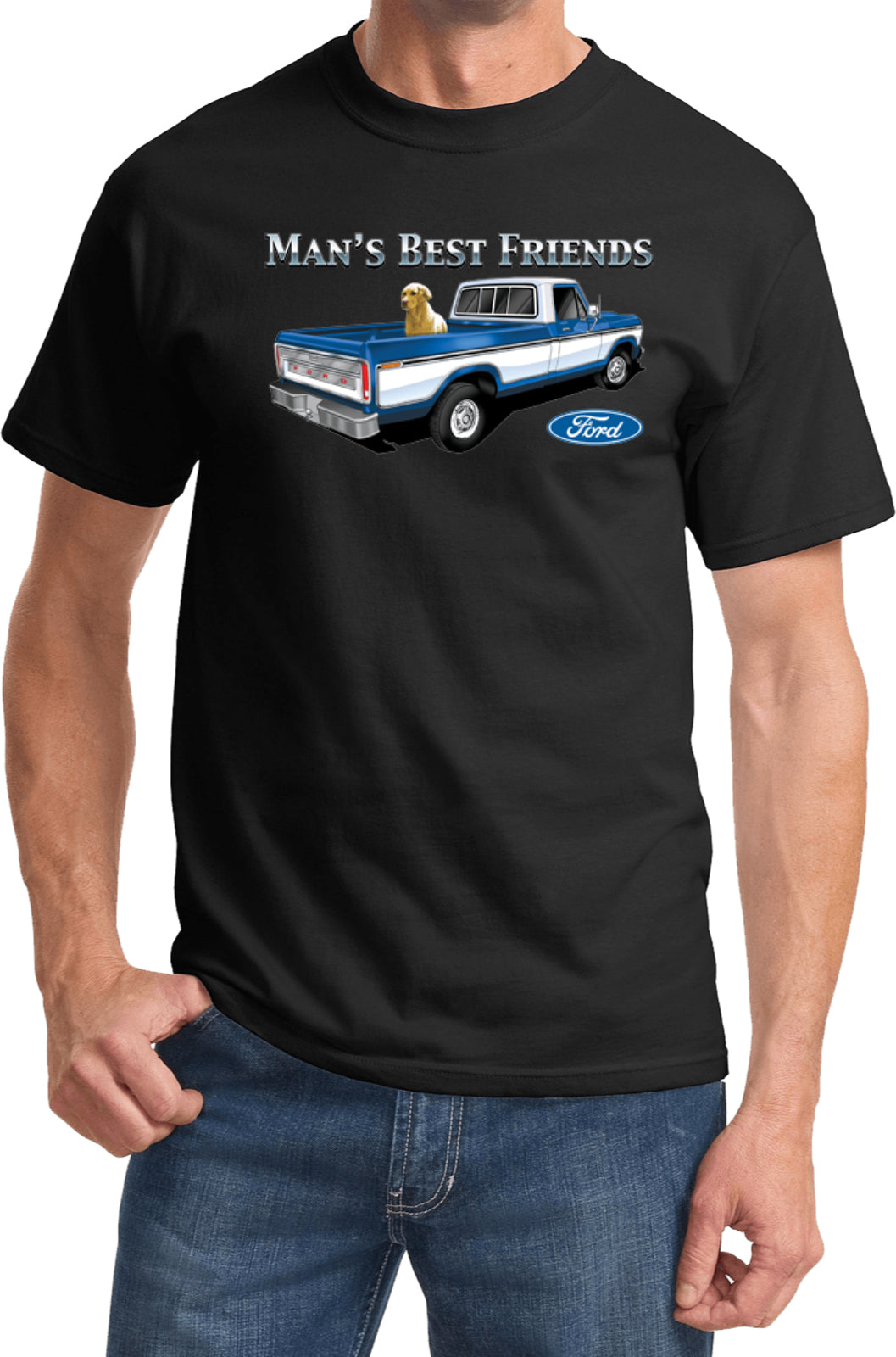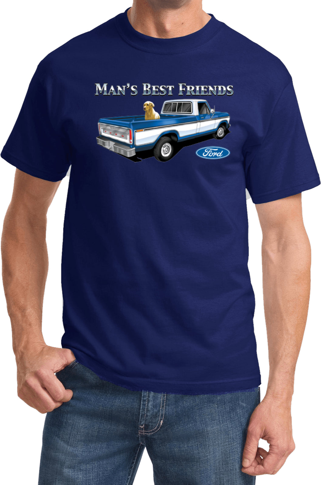 • A mens t-shirt featuring a classic Ford F-150 truck with a Golden Retriever in the bed