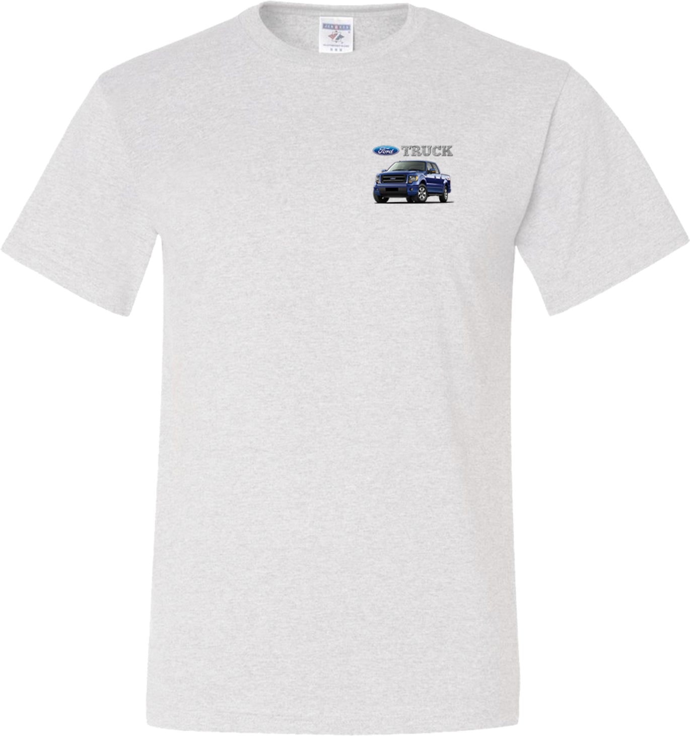 - A mens tall t-shirt featuring a blue Ford F-150 as a pocket print
