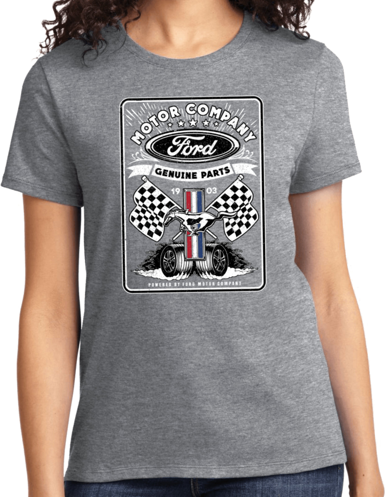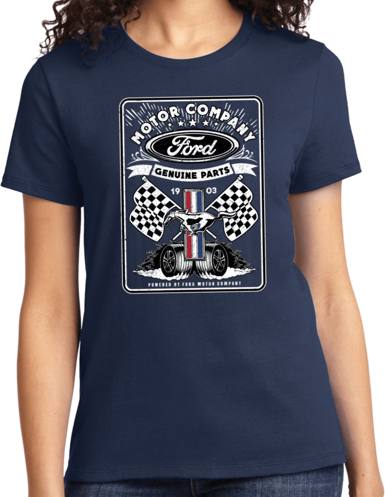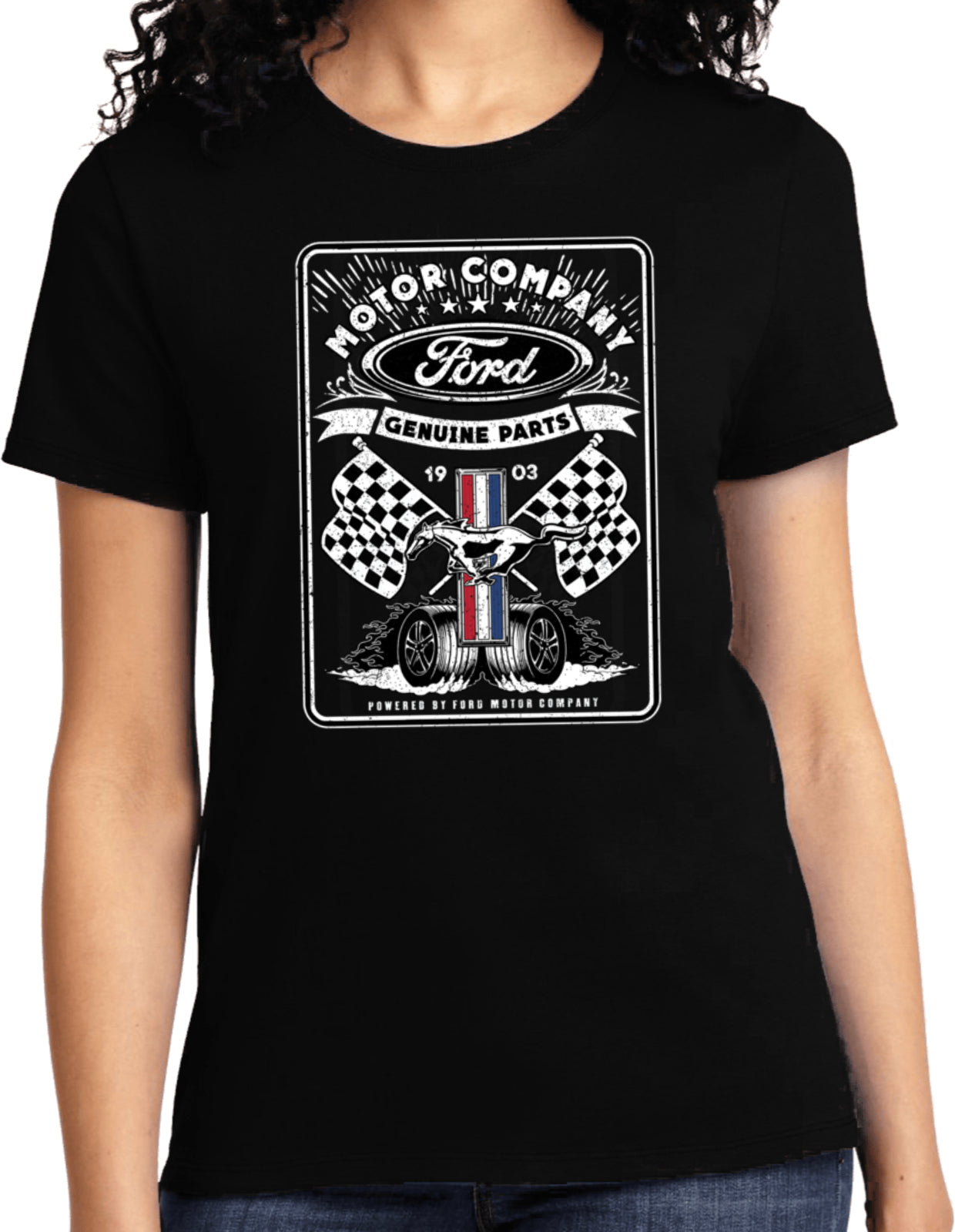• A ladies t-shirt featuring a Ford Motor Company Genuine Parts design with the Mustang Tri Bar logo surrounded by racing flags