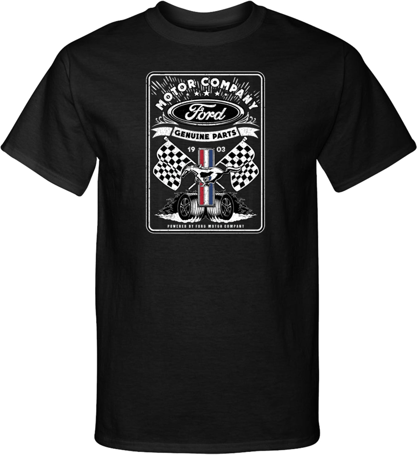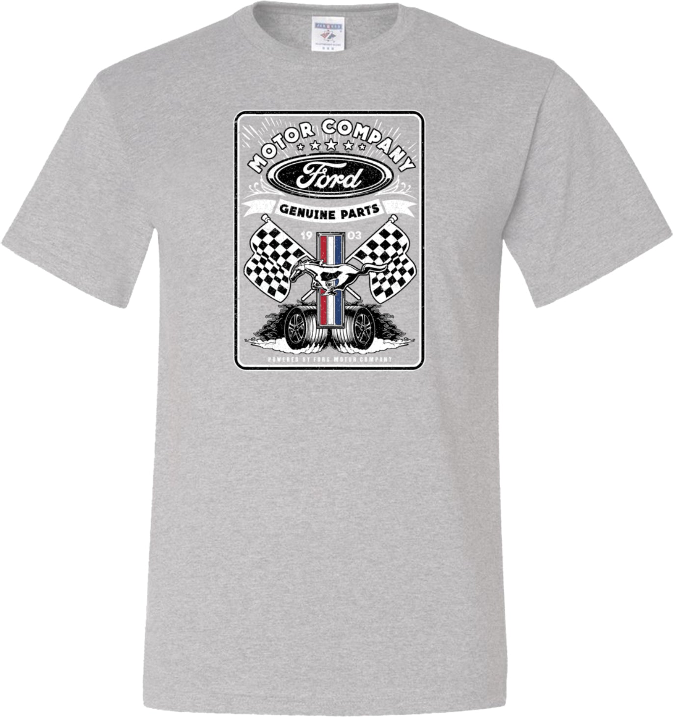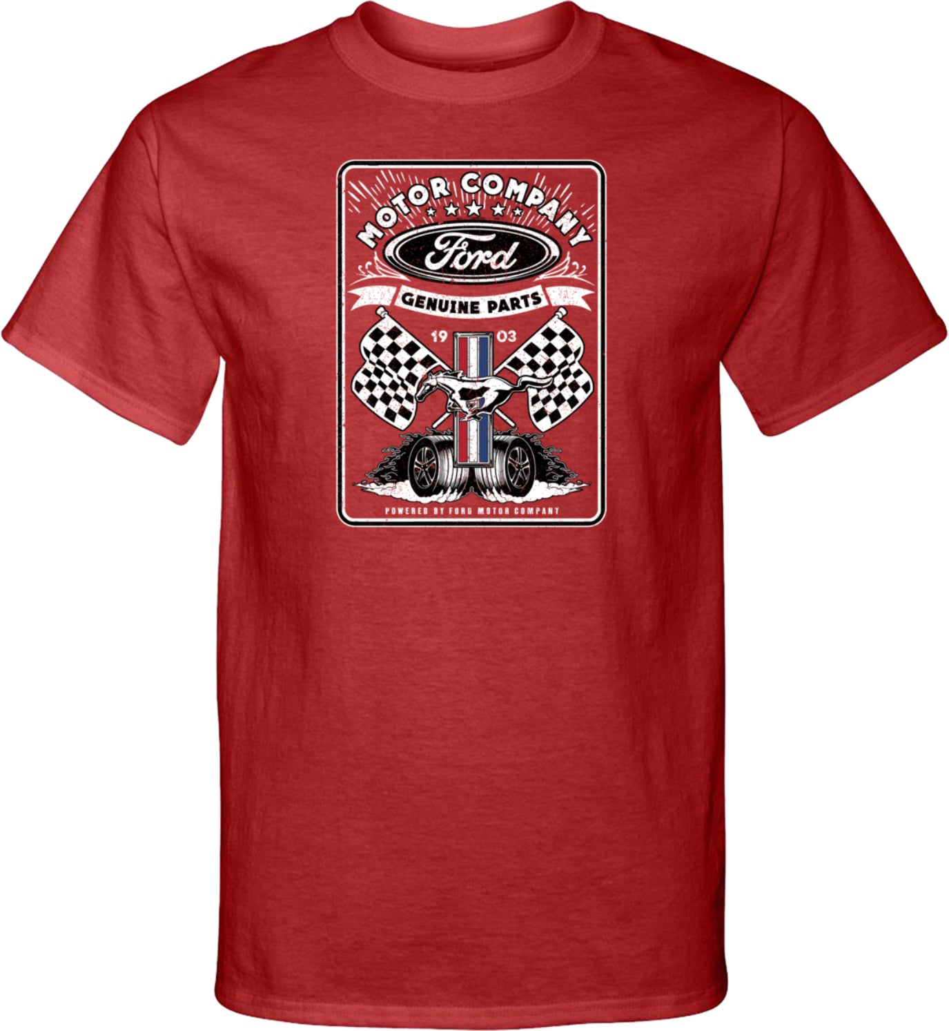 - A tall t-shirt featuring a Ford Motor Company Genuine Parts design with the Mustang Tri Bar logo surrounded by racing flags