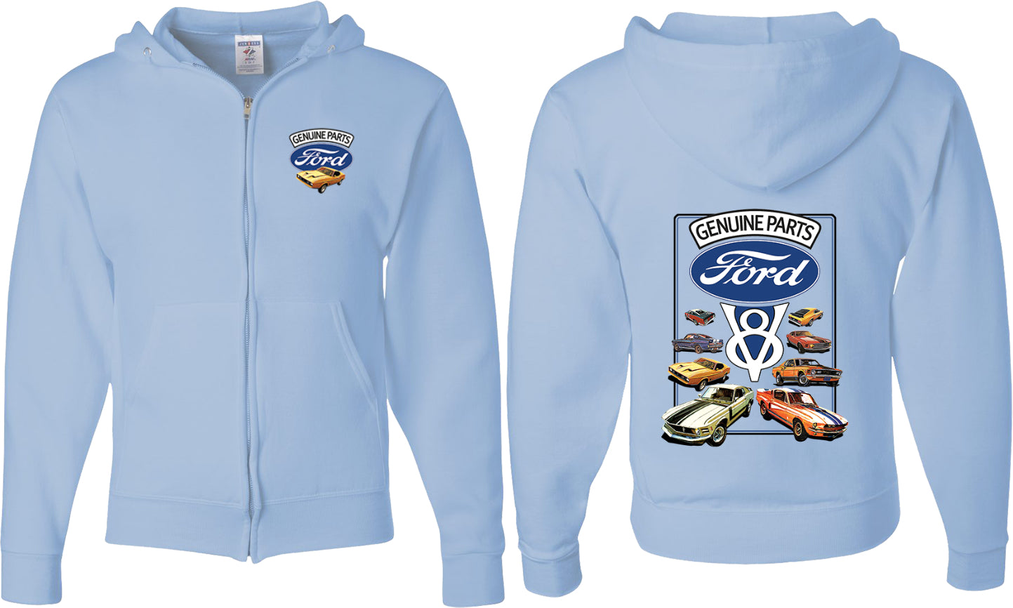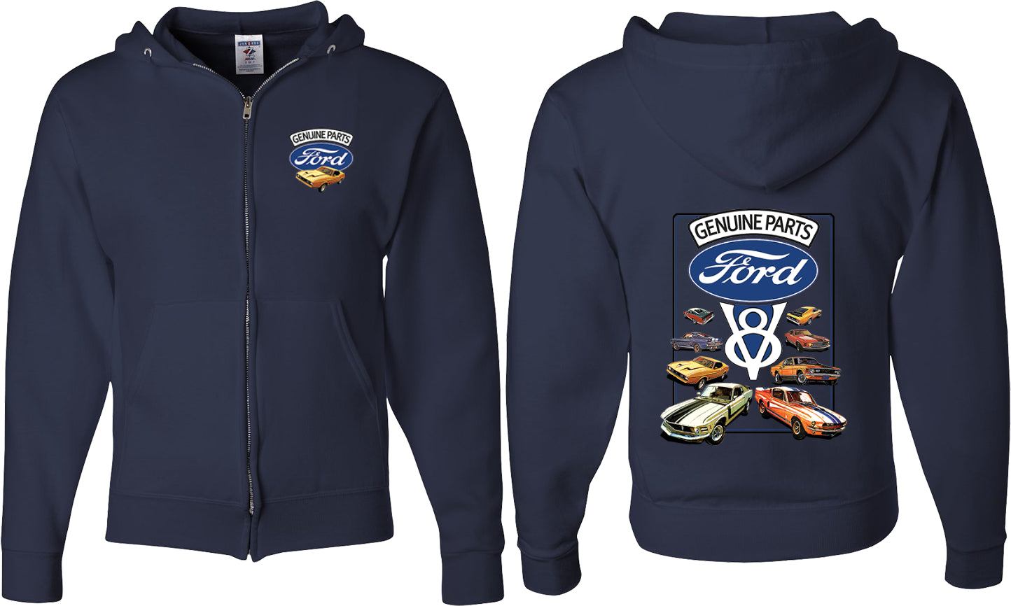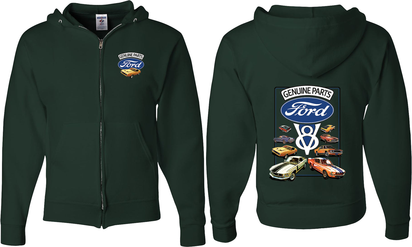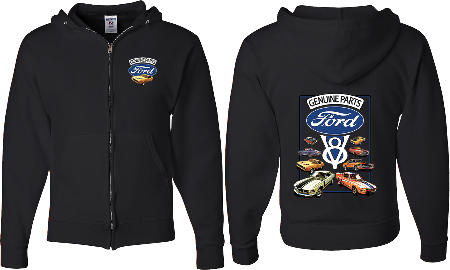 - A mens full zip hoodie featuring classic Ford Mustangs: Genuine Parts V8
