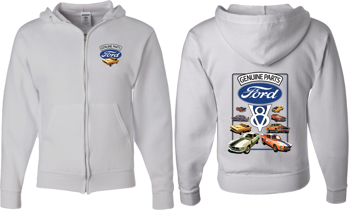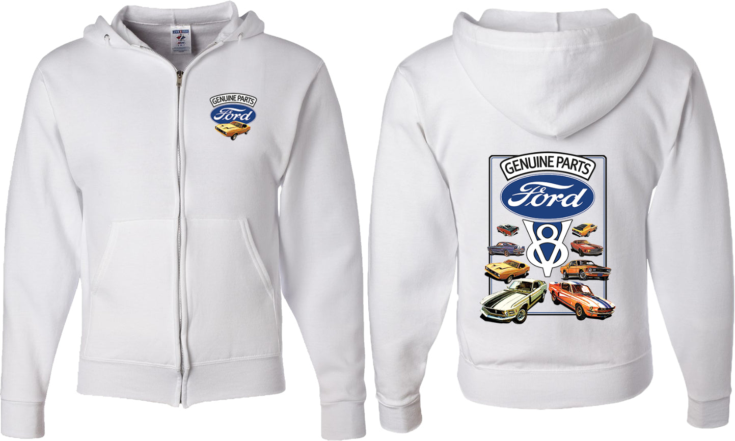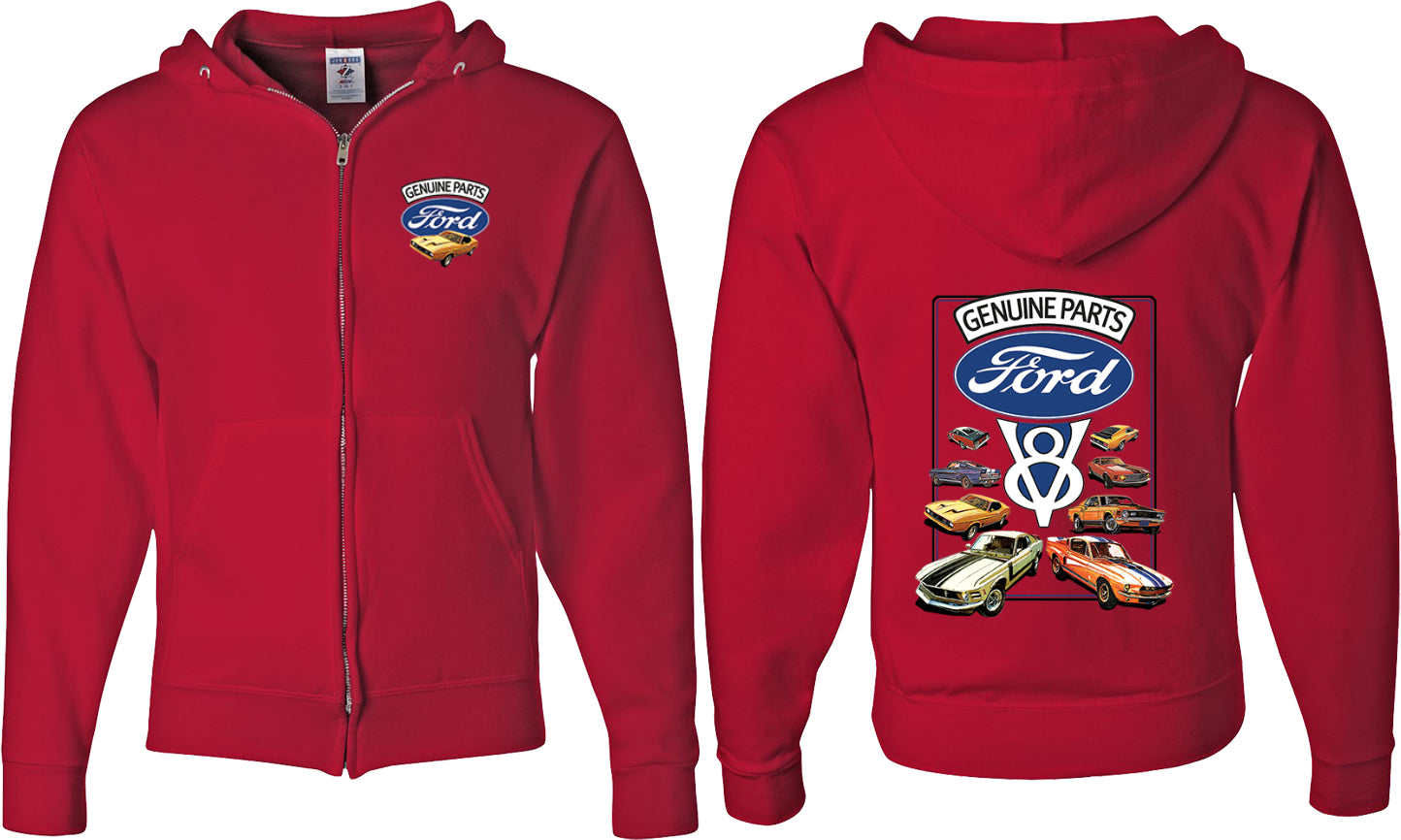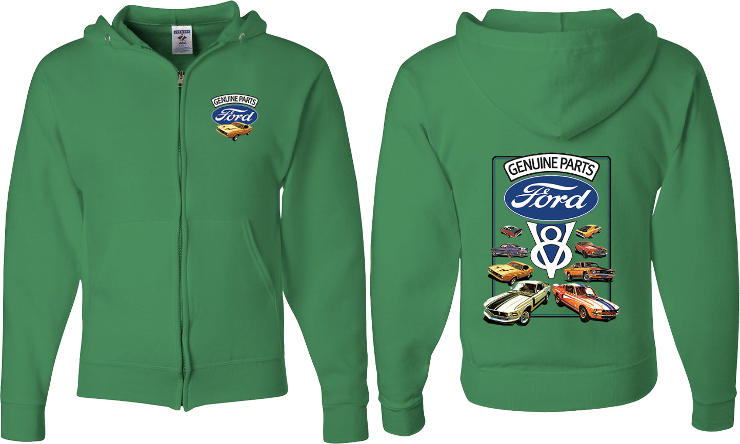- A mens full zip hoodie featuring classic Ford Mustangs: Genuine Parts V8