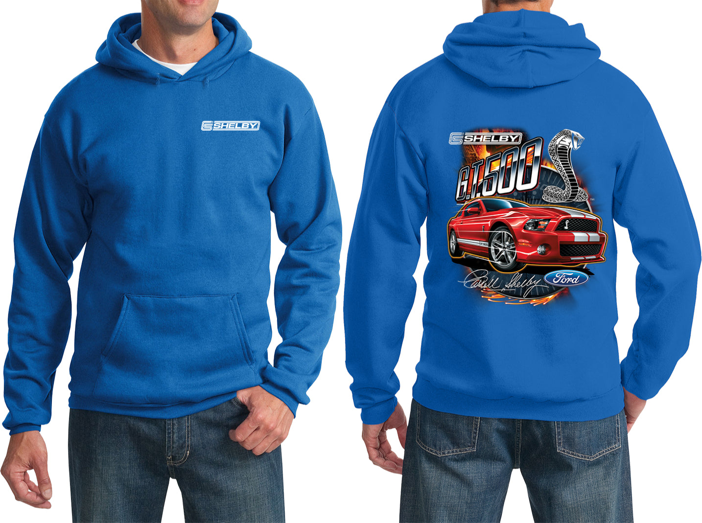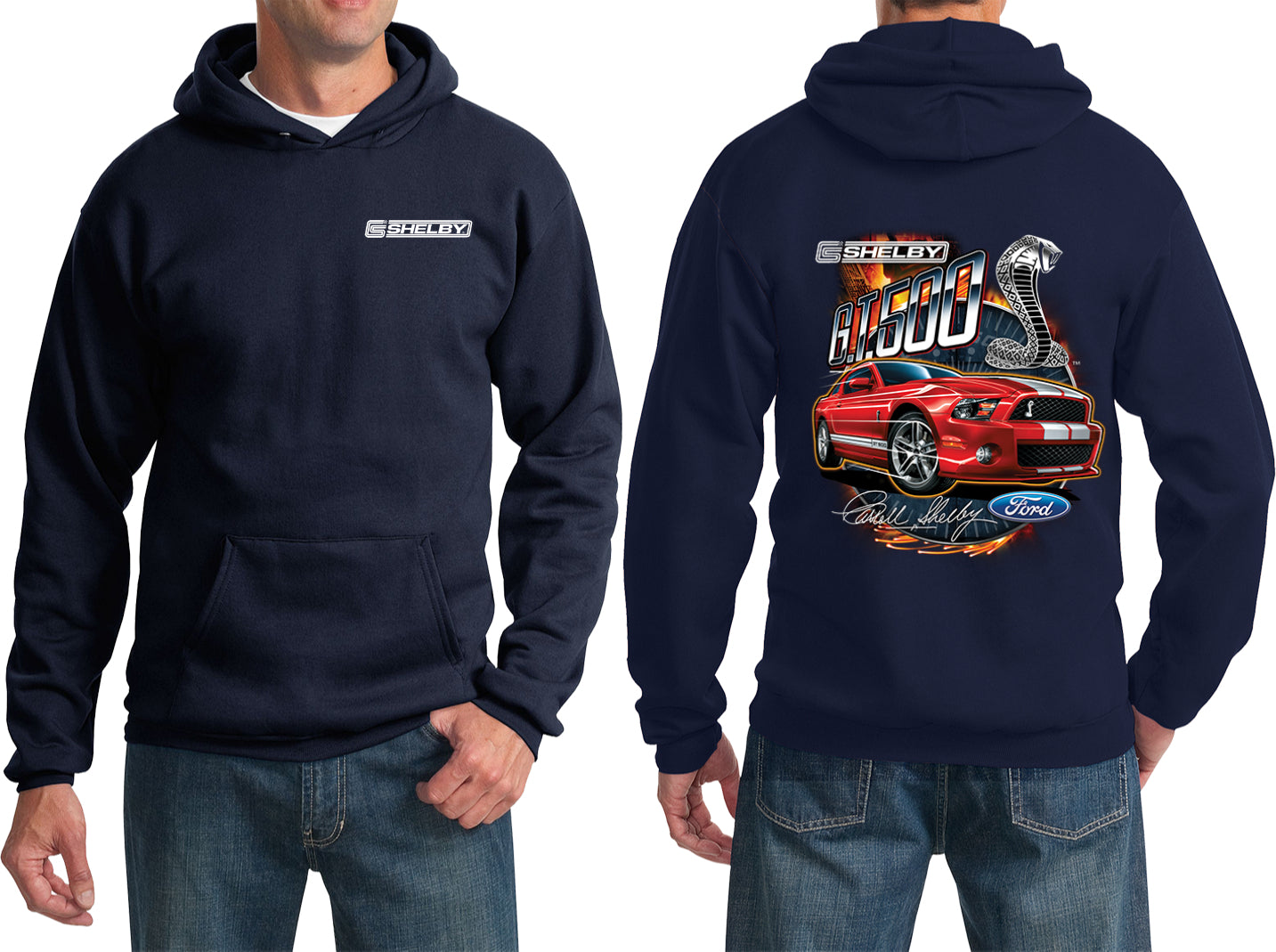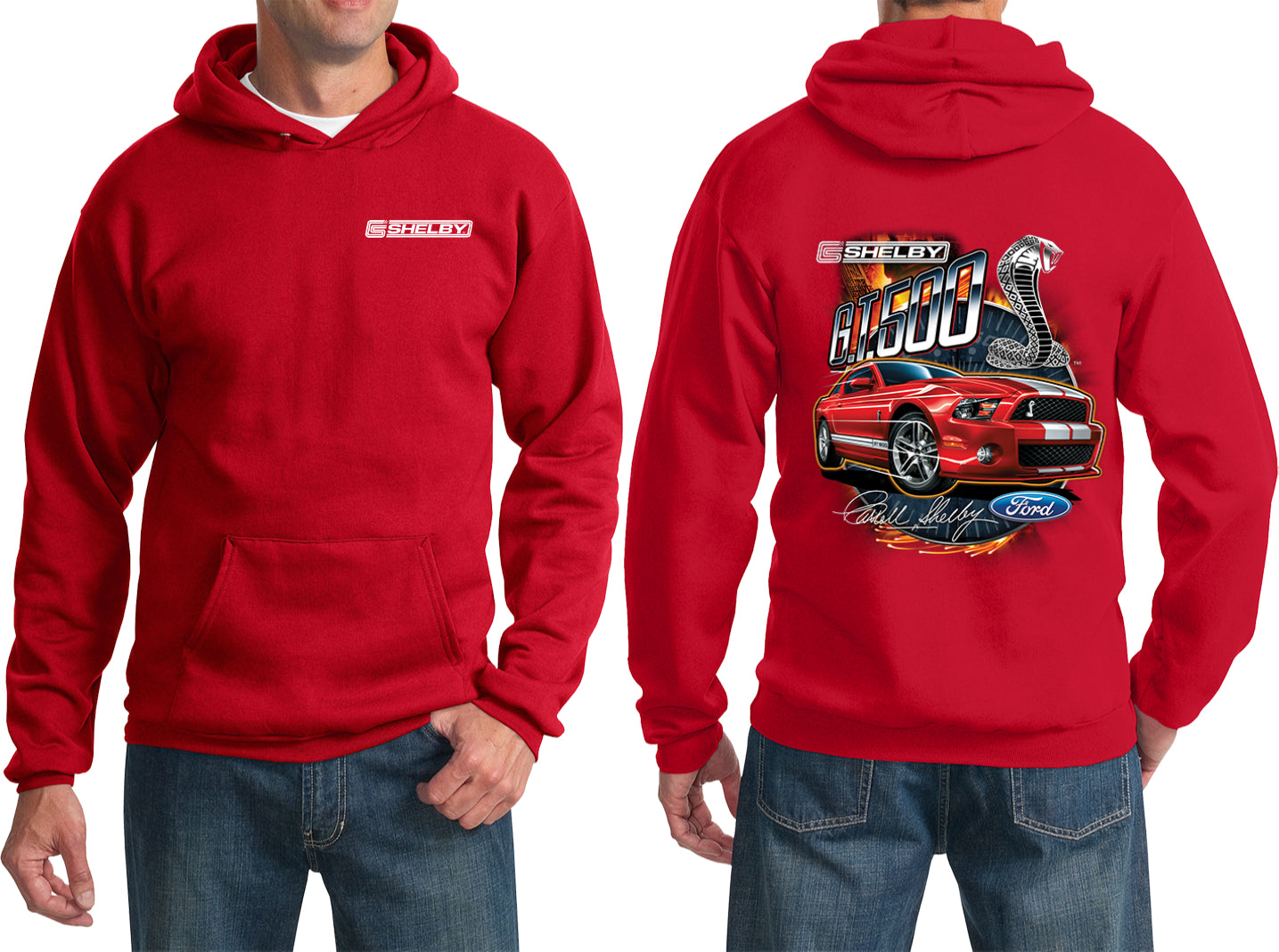- A Ford pullover hoodie featuring the Shelby emblem on the front and a red Mustang Shelby GT500 on the back