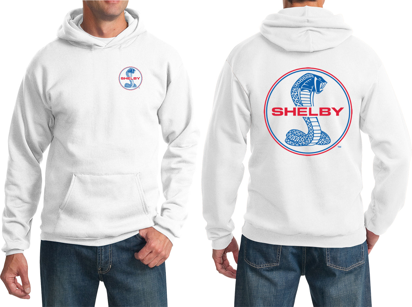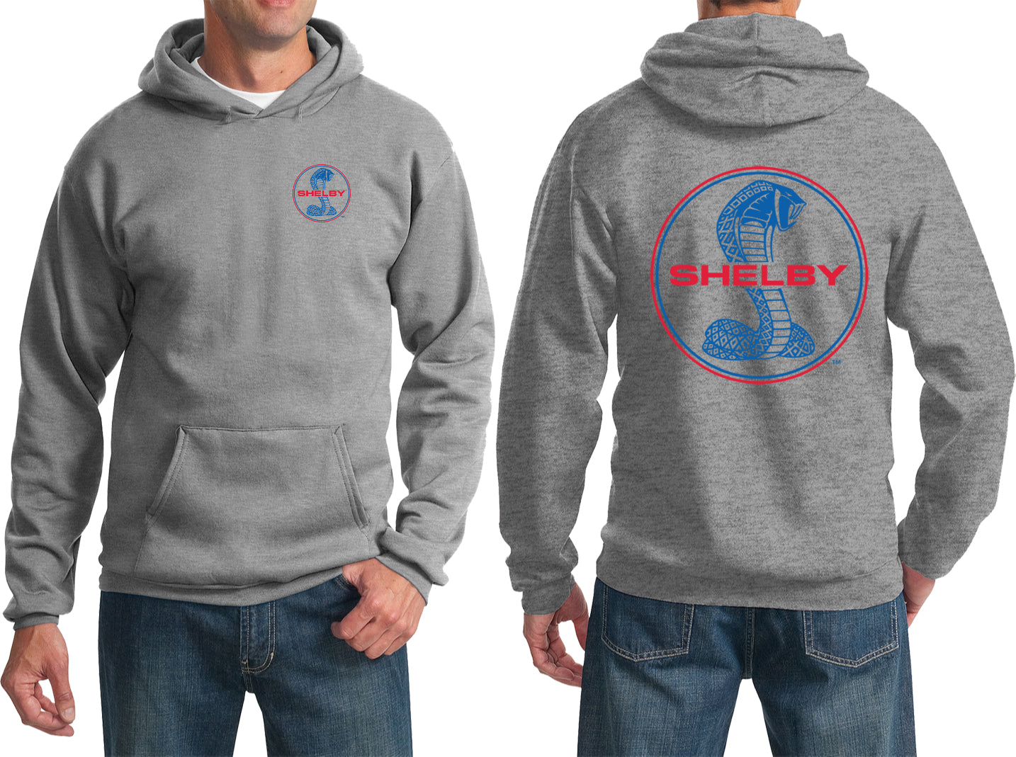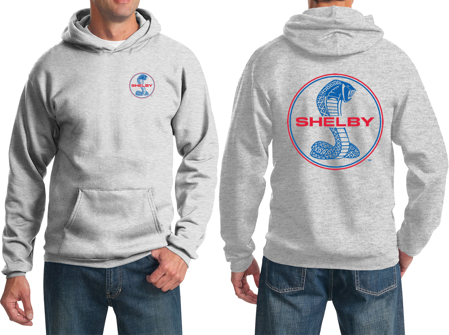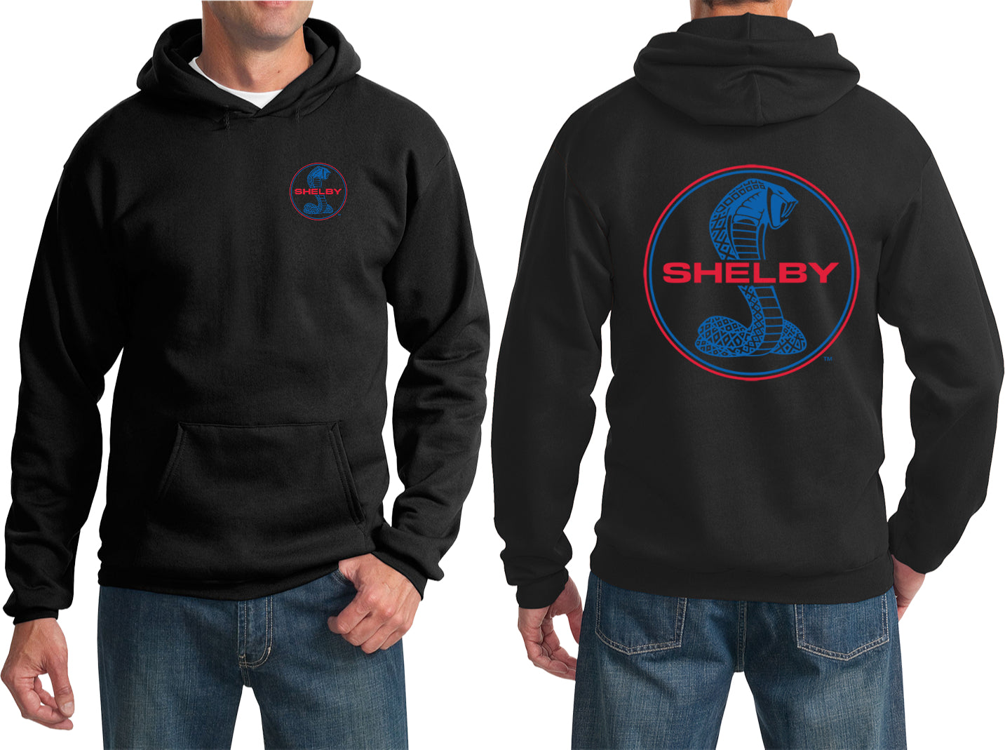 • A pullover hoodie featuring a blue and red Ford Mustang Shelby logo