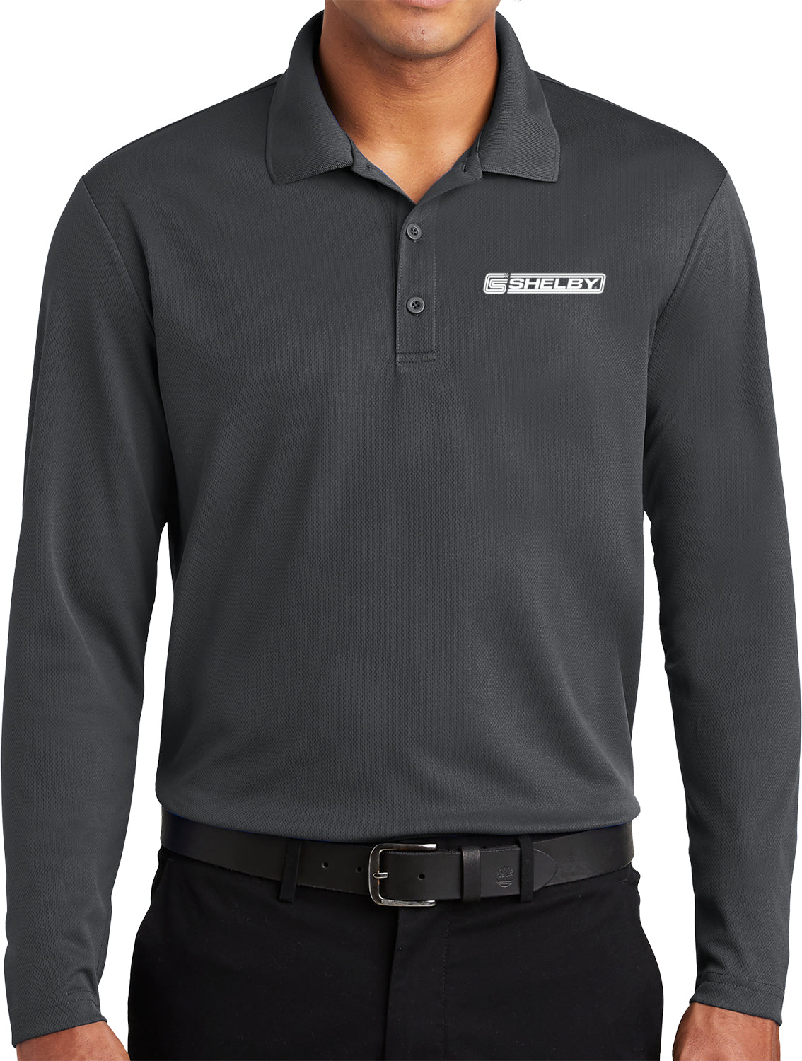 • A mens long sleeve polo shirt featuring the Shelby logo as a pocket print