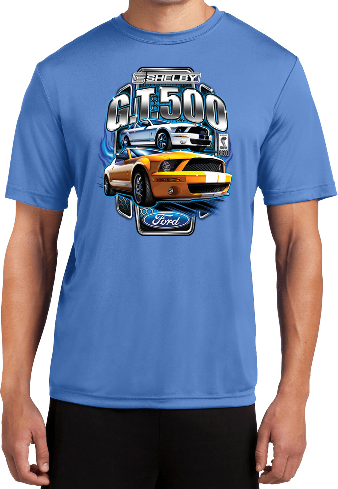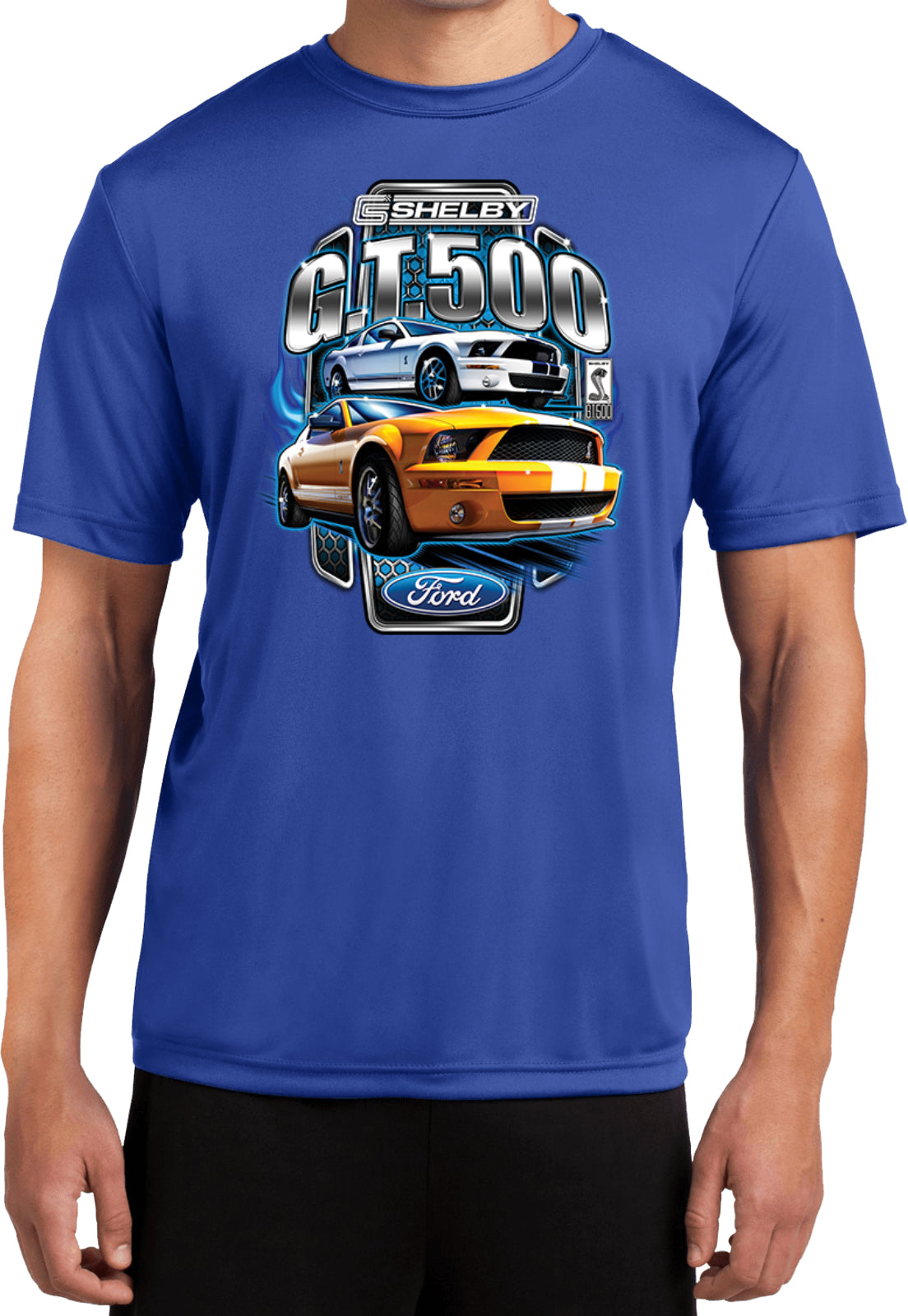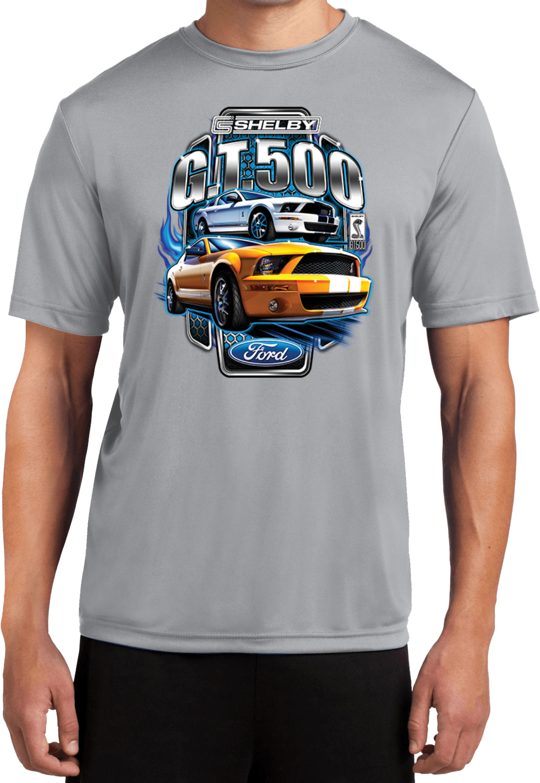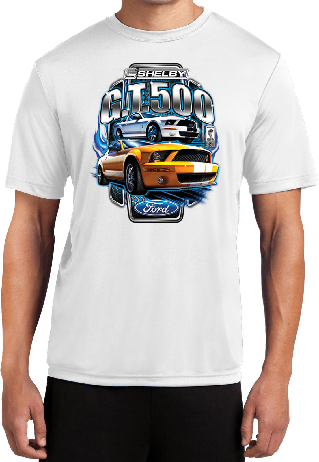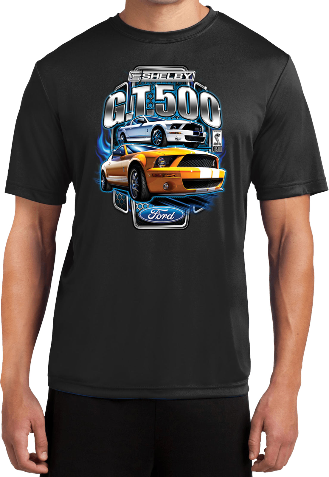 - A mens Ford dry wicking t-shirt featuring a yellow and white Mustang Shelby GT500