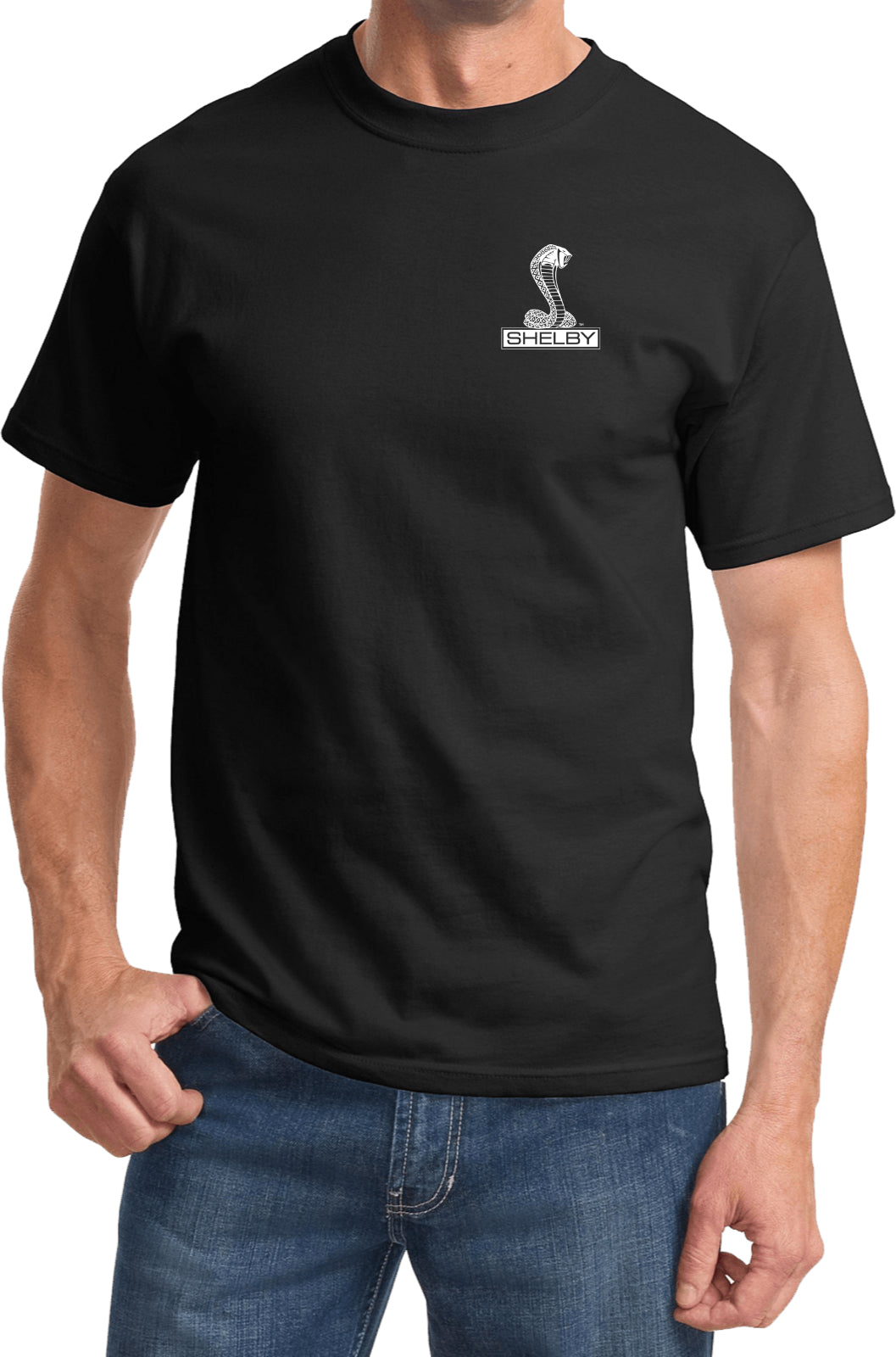 - A mens t-shirt featuring the Shelby Cobra emblem as a pocket print