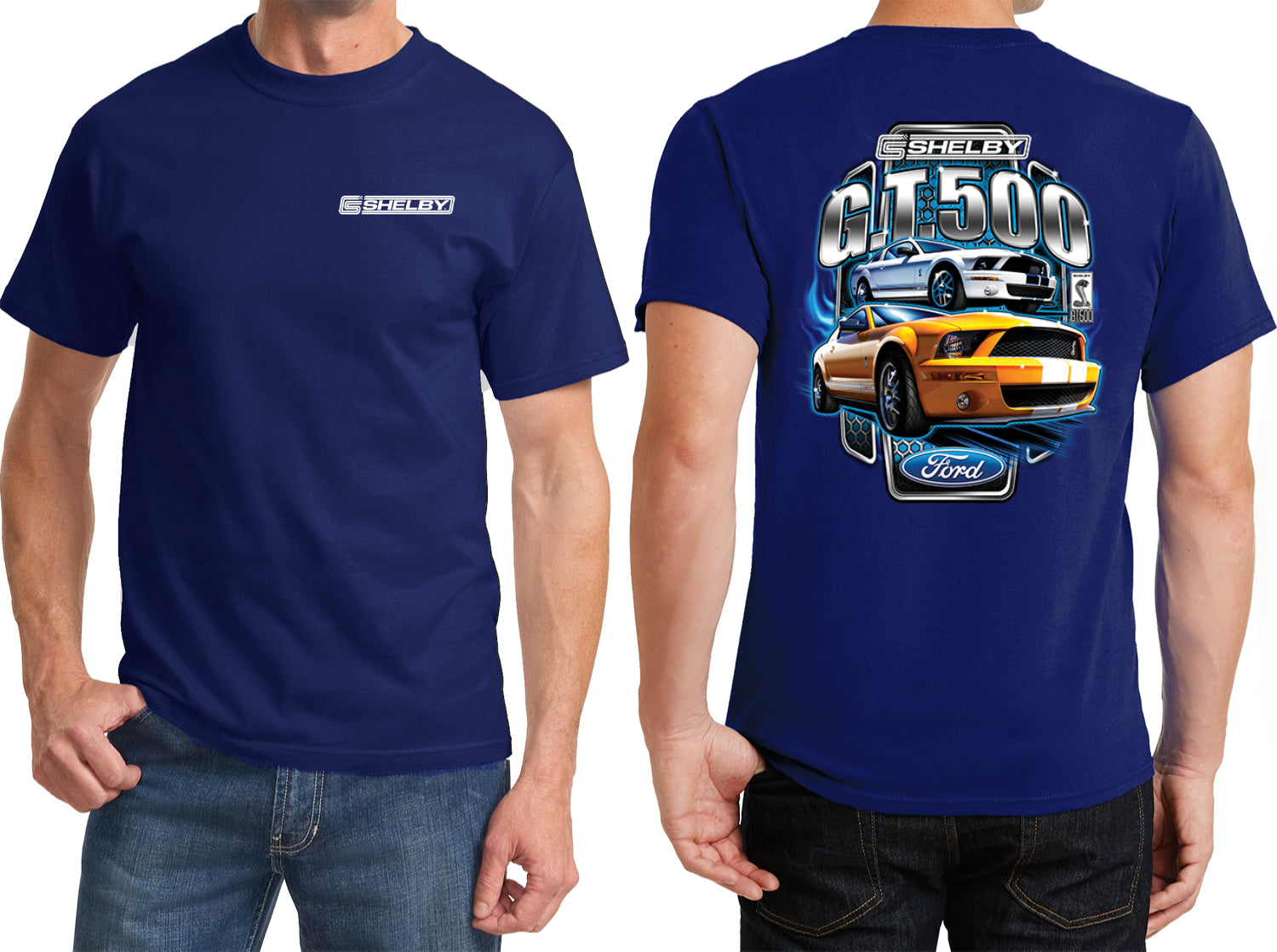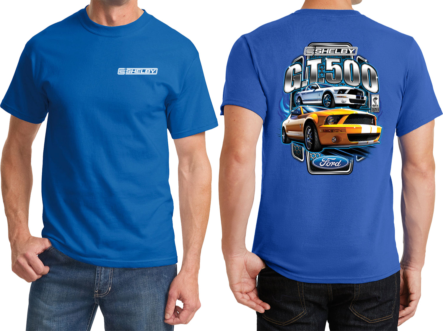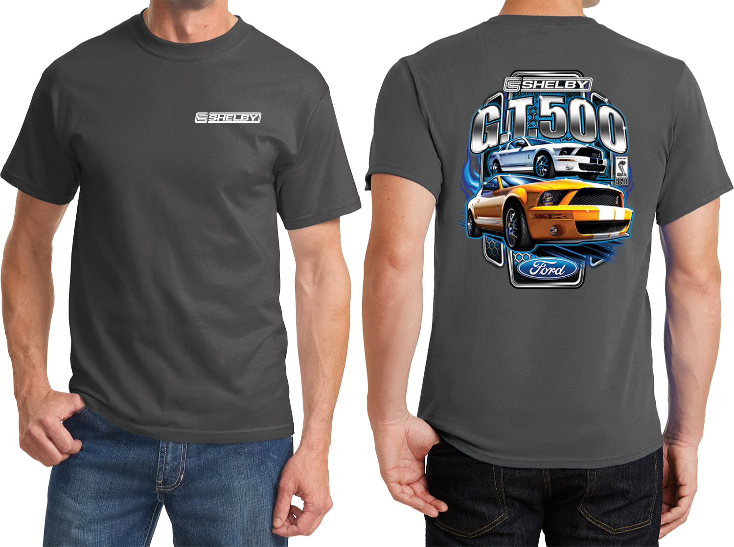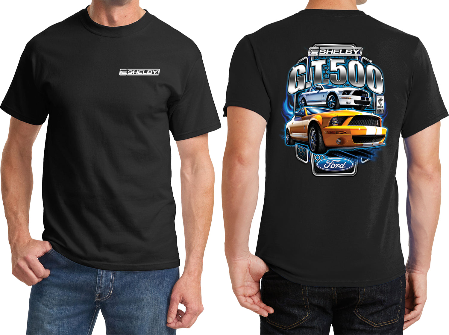 - A Ford t-shirt featuring the Shelby logo on the front and a yellow and white Mustang Shelby GT500 on the back
