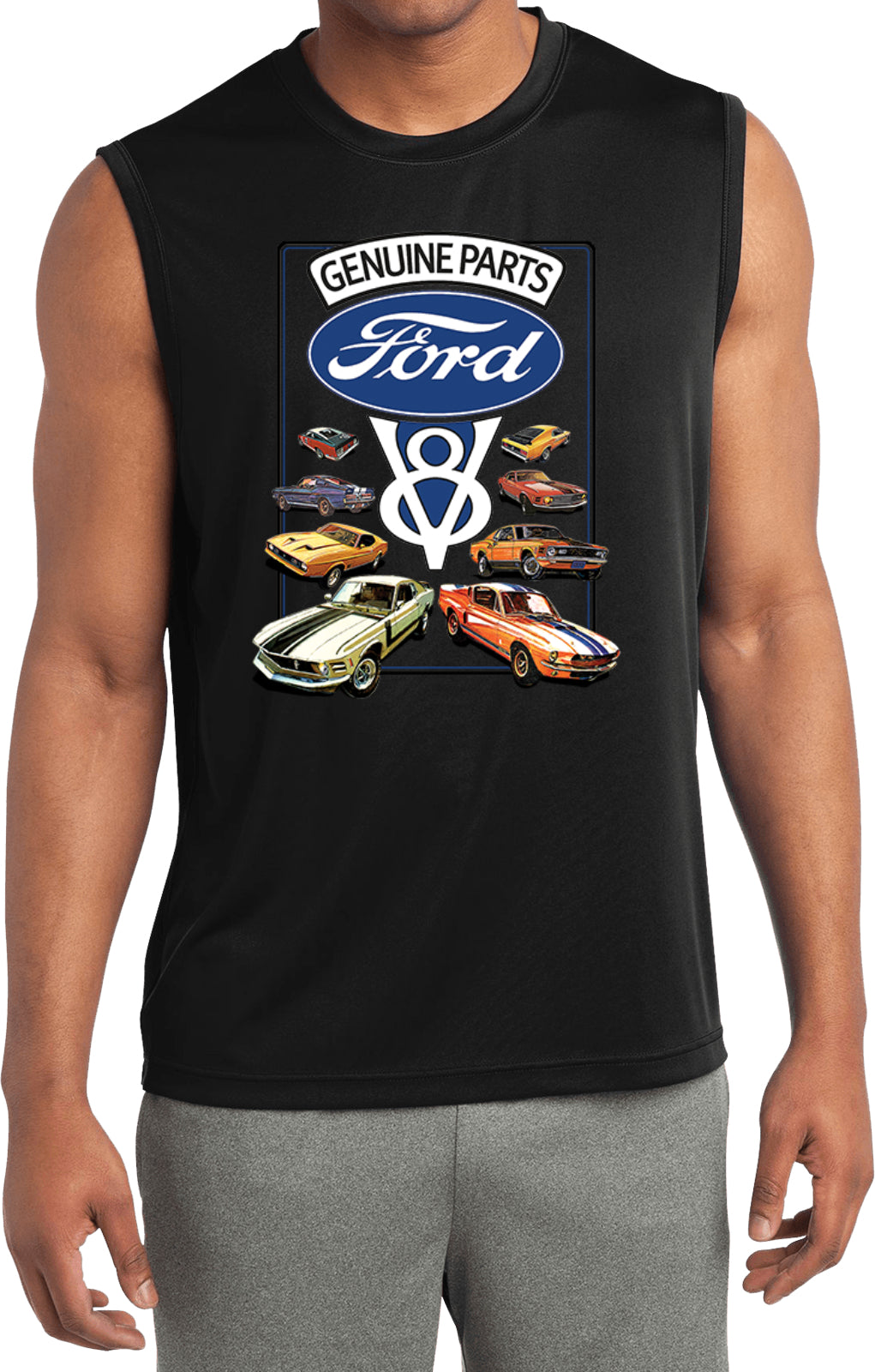 • A mens dry wicking muscle shirt featuring a collection of classic Ford Mustangs: Genuine Parts V8
