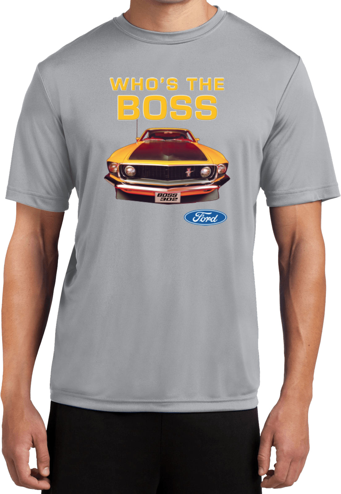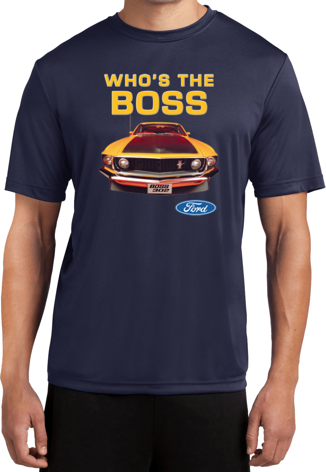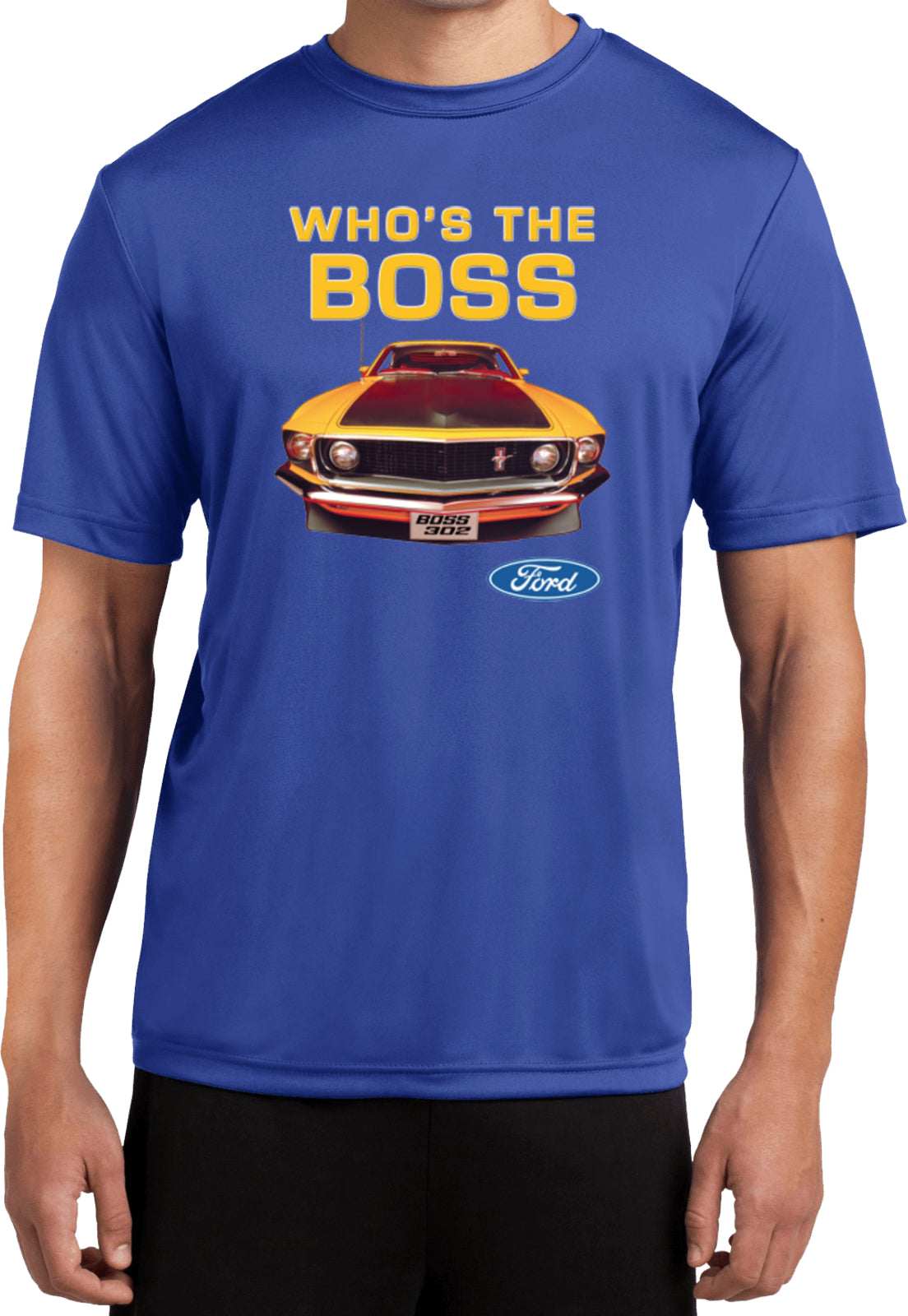 - A mens dry wicking t-shirt featuring a yellow Ford Mustang Boss 302: Who's The Boss