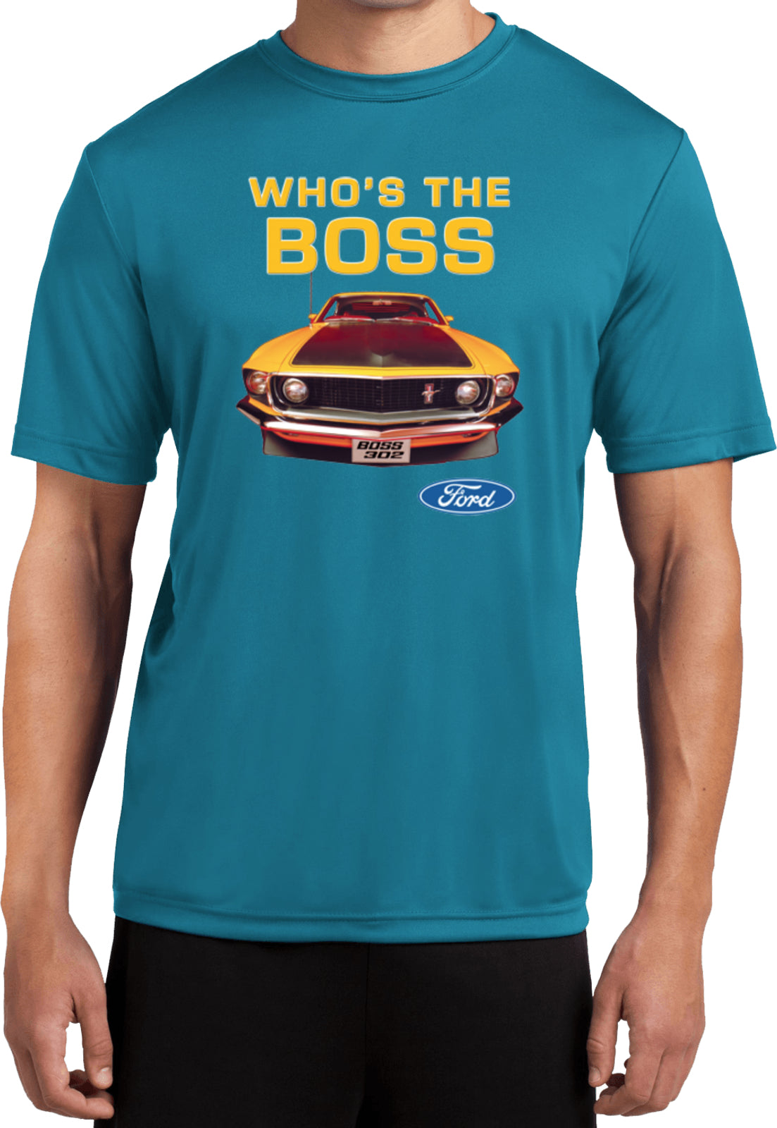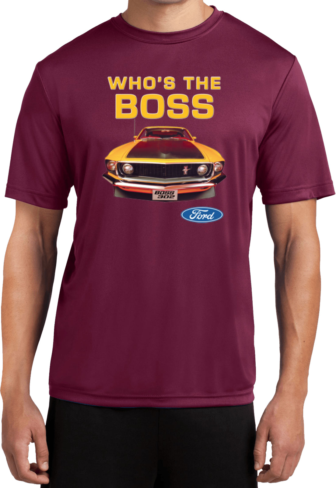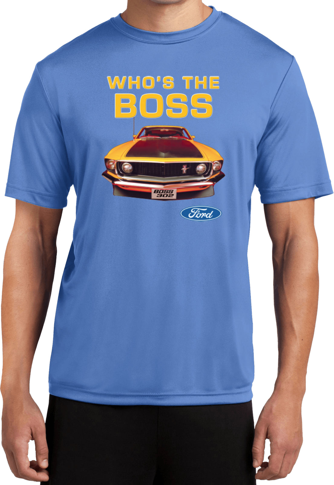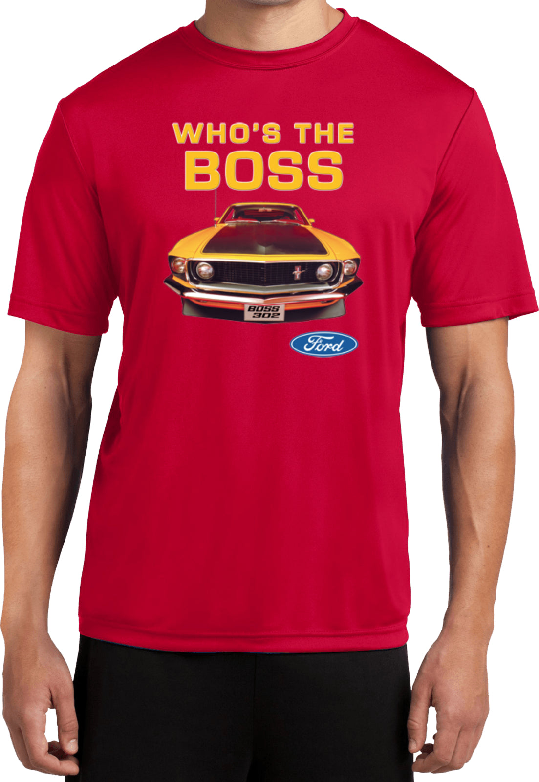 - A mens dry wicking t-shirt featuring a yellow Ford Mustang Boss 302: Who's The Boss