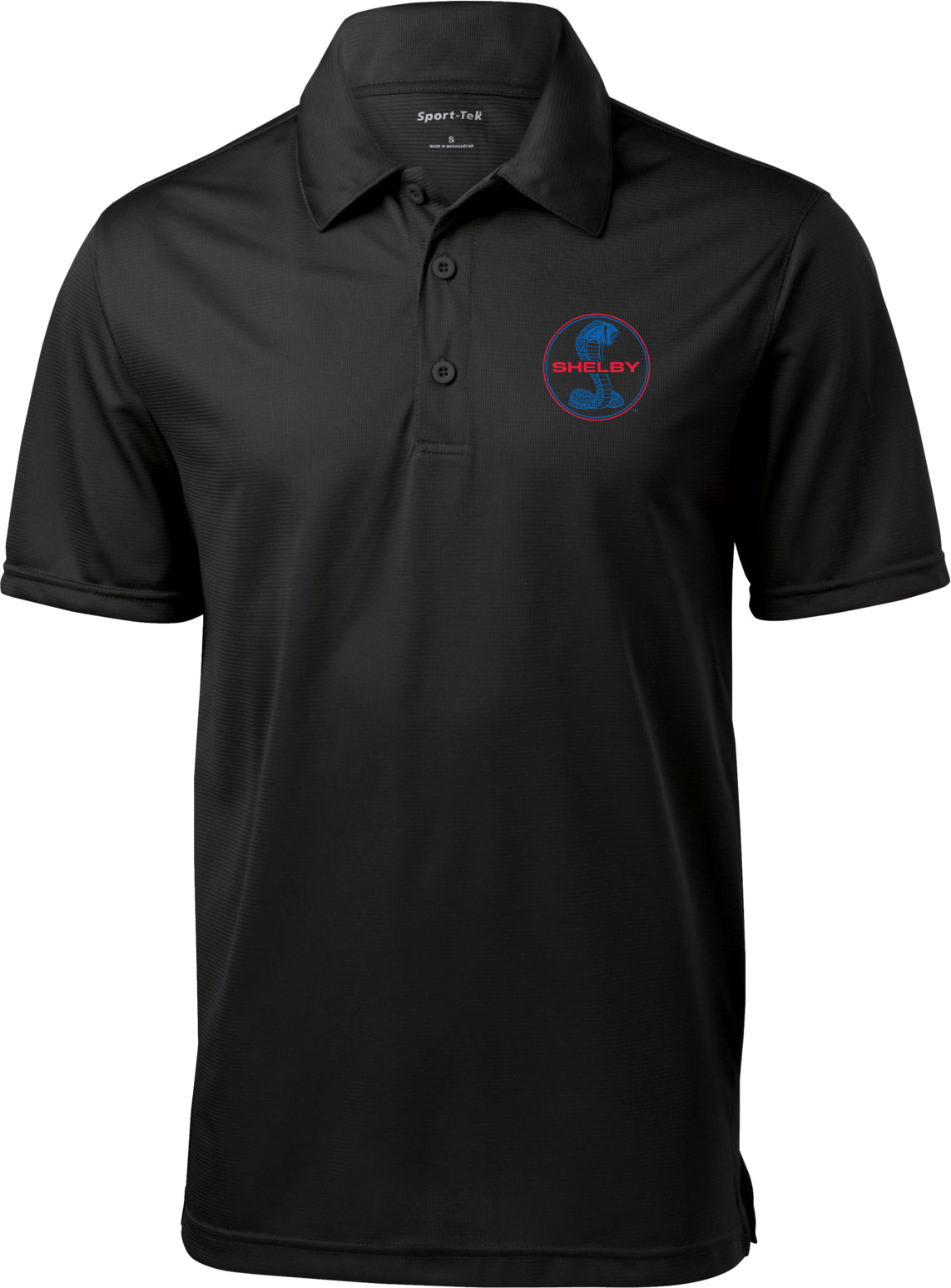 - A mens polo shirt featuring a blue and red Ford Mustang Shelby logo as a pocket print