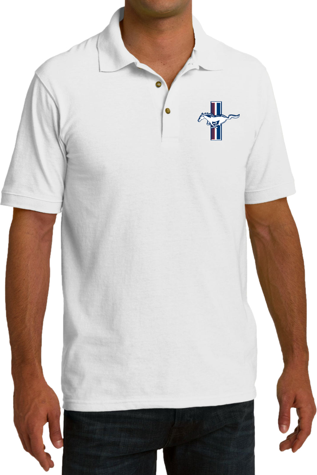 - A mens polo featuring a Ford Mustang Tri Bar logo as a pocket print