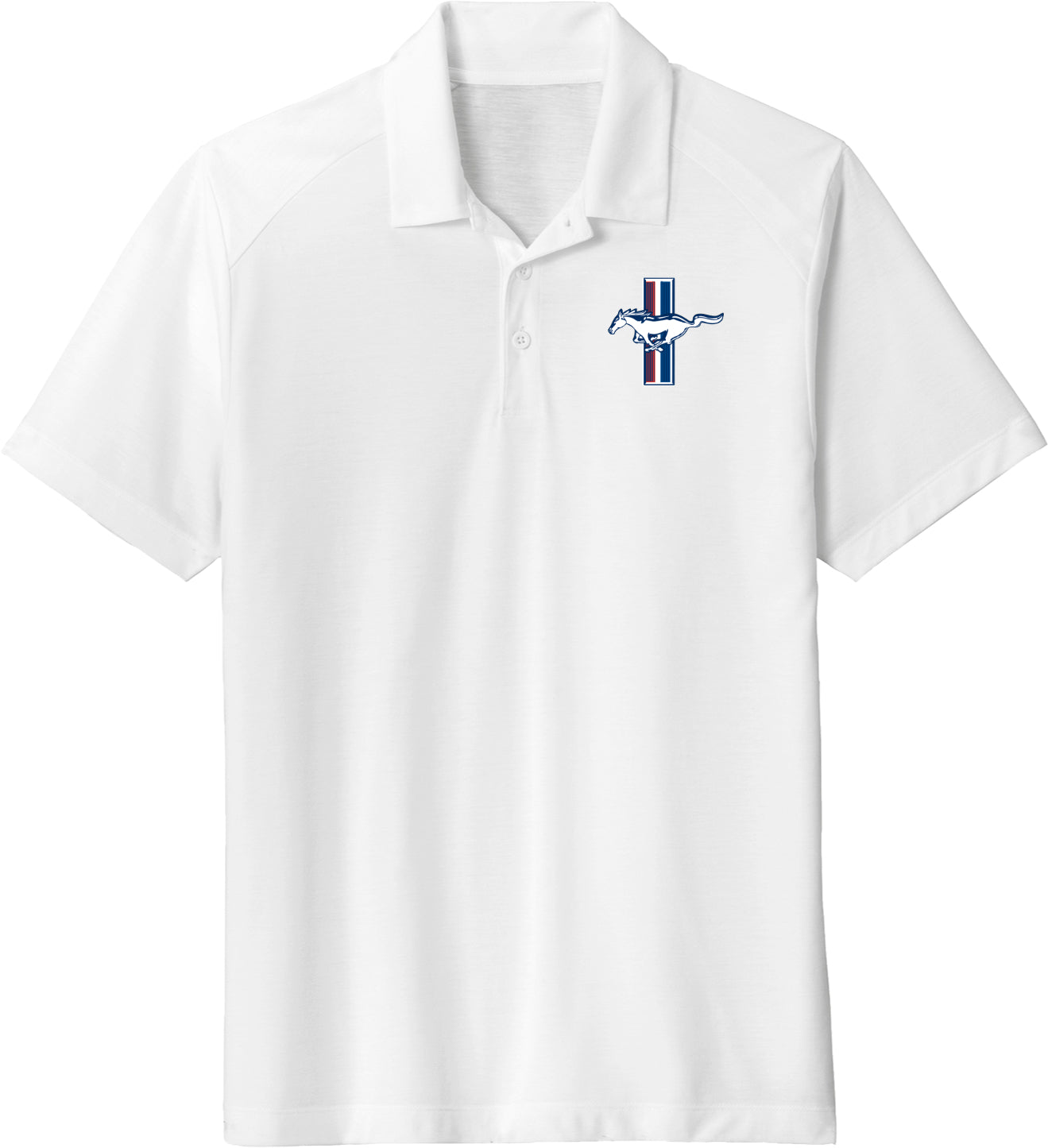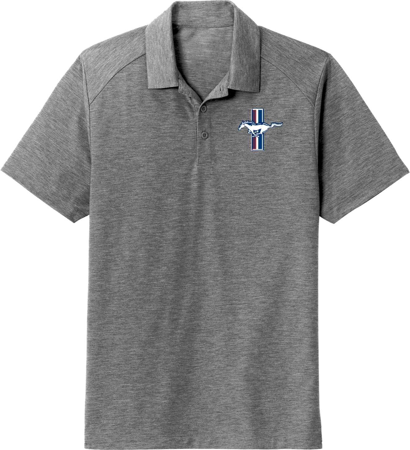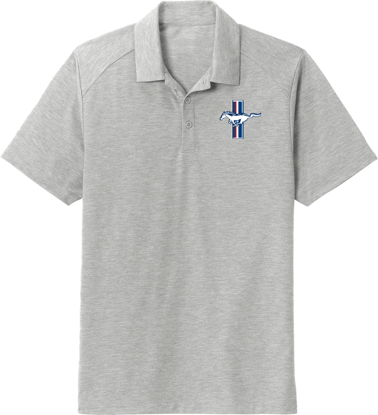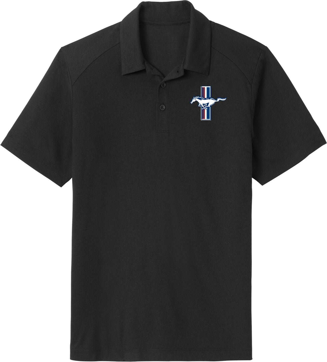 • A mens tri blend polo shirt featuring the Ford Mustang Tri Bar Emblem