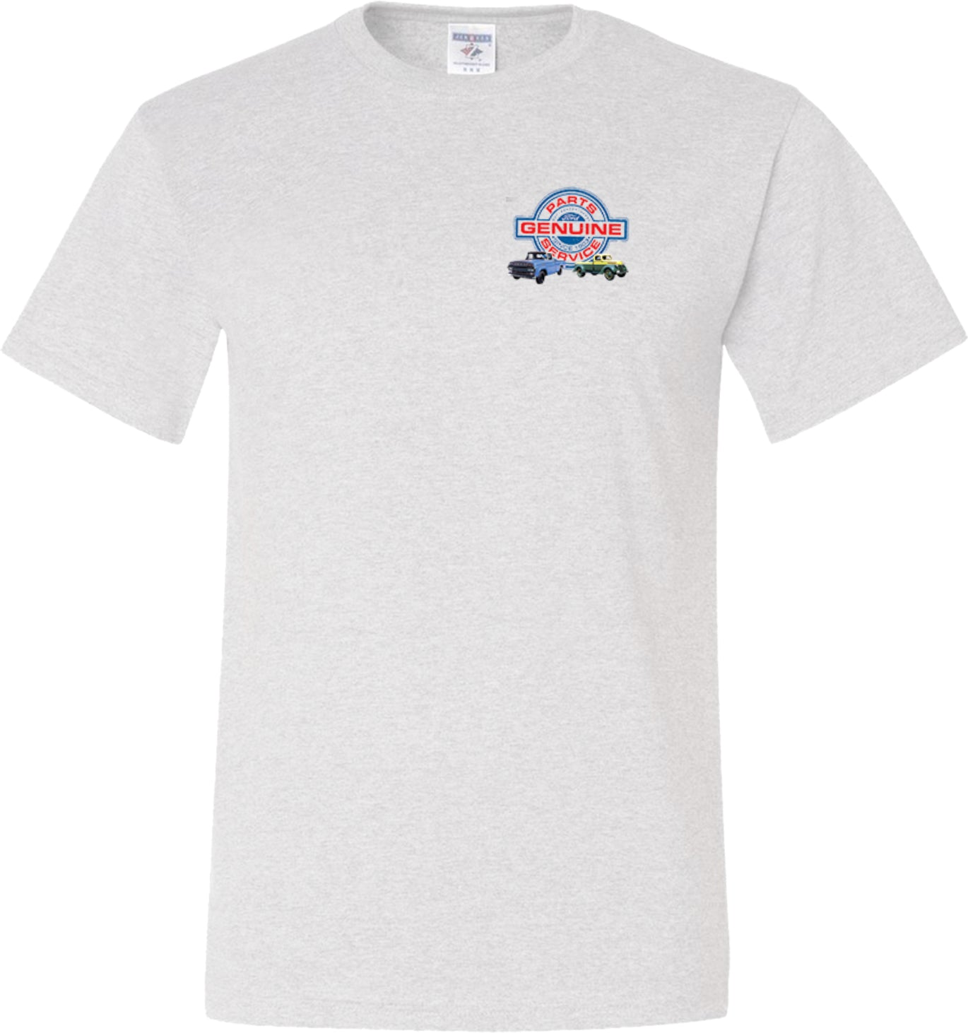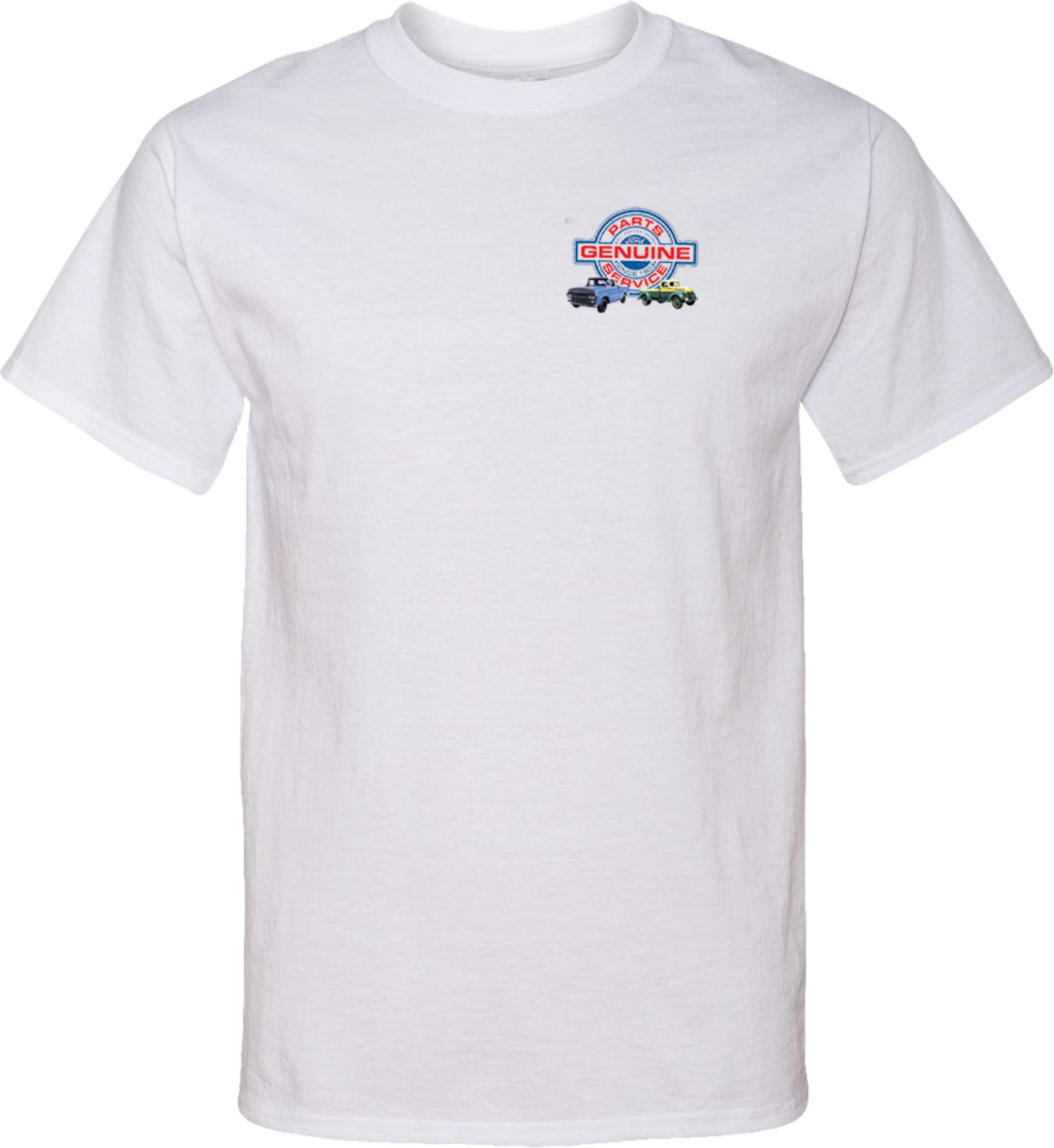 - A mens tall t-shirt featuring two classic Ford pickups: Genuine Parts Service