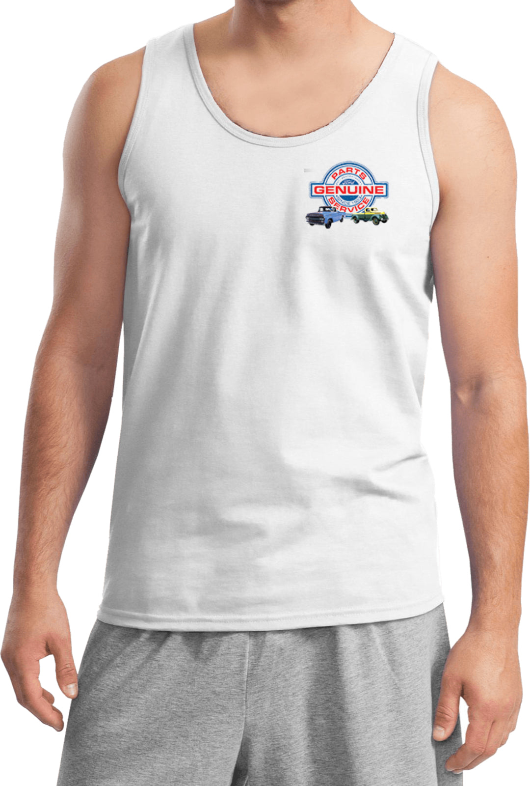 - A mens tank top featuring two classic Ford pickups: Genuine Parts Service