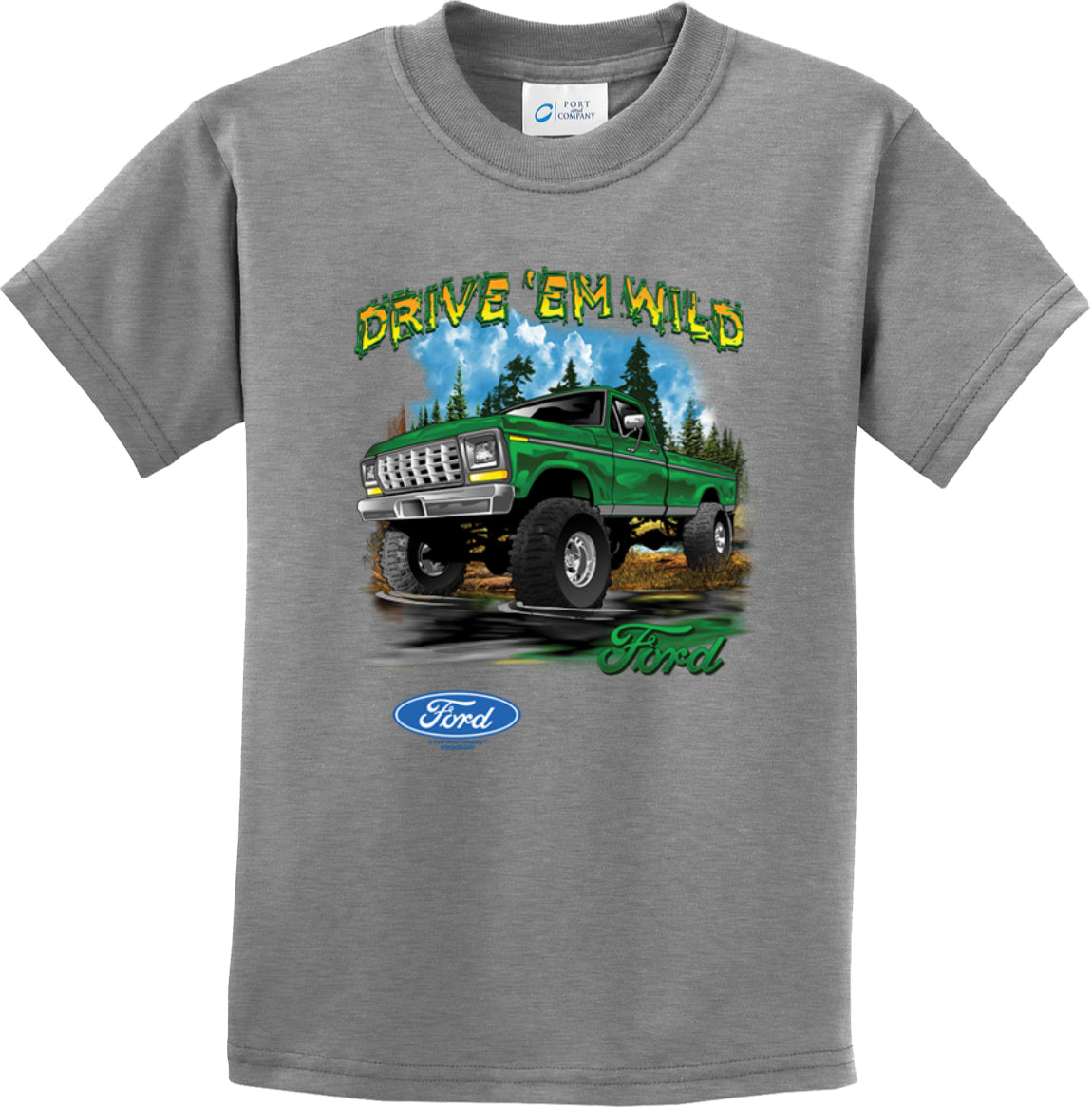 - A youth t-shirt featuring a classic Ford F-150 truck with the catchphrase Drive 'Em Wild