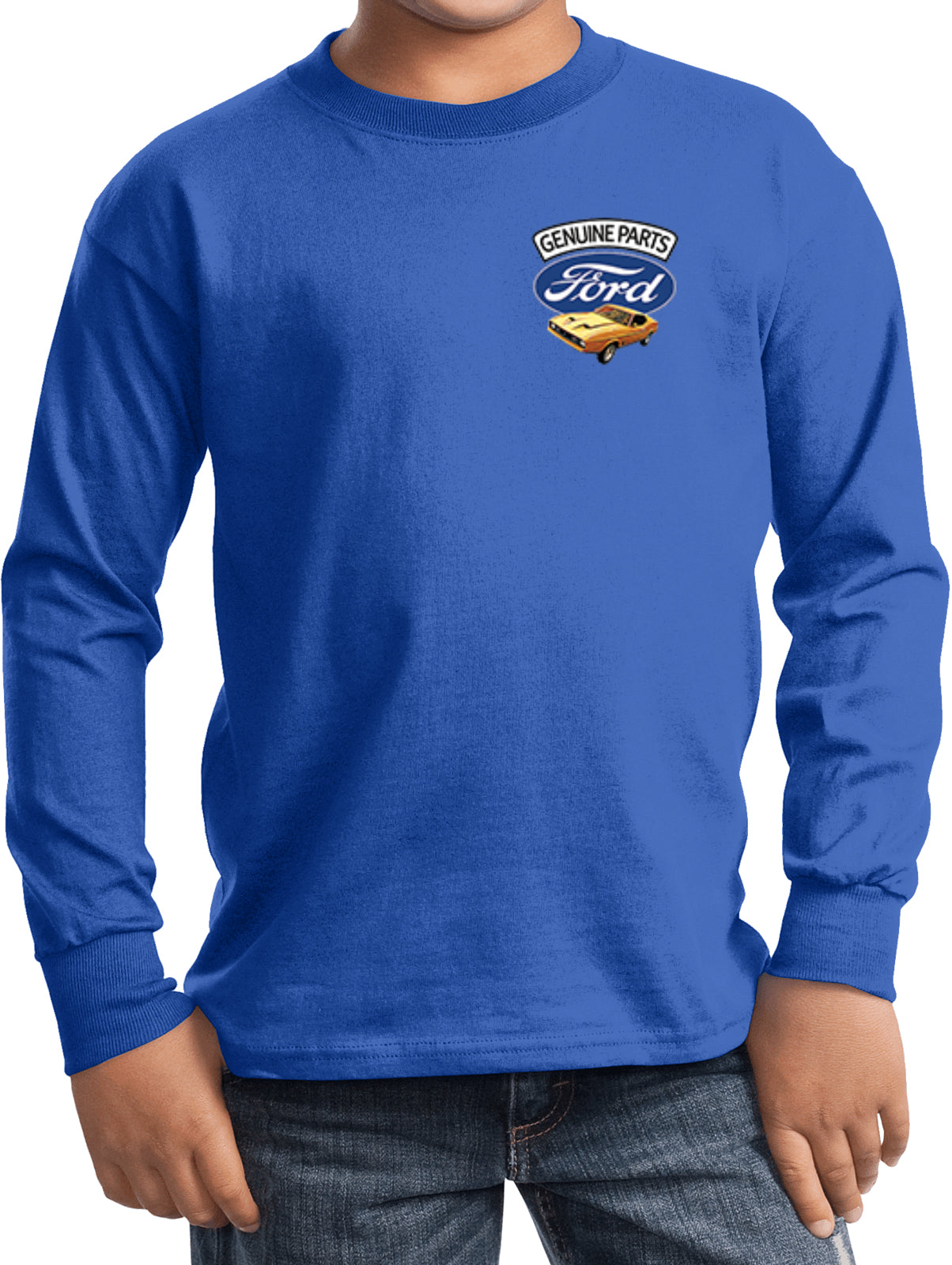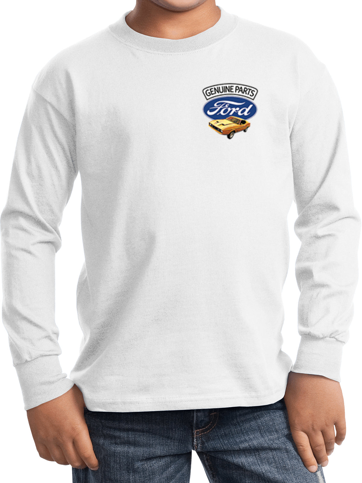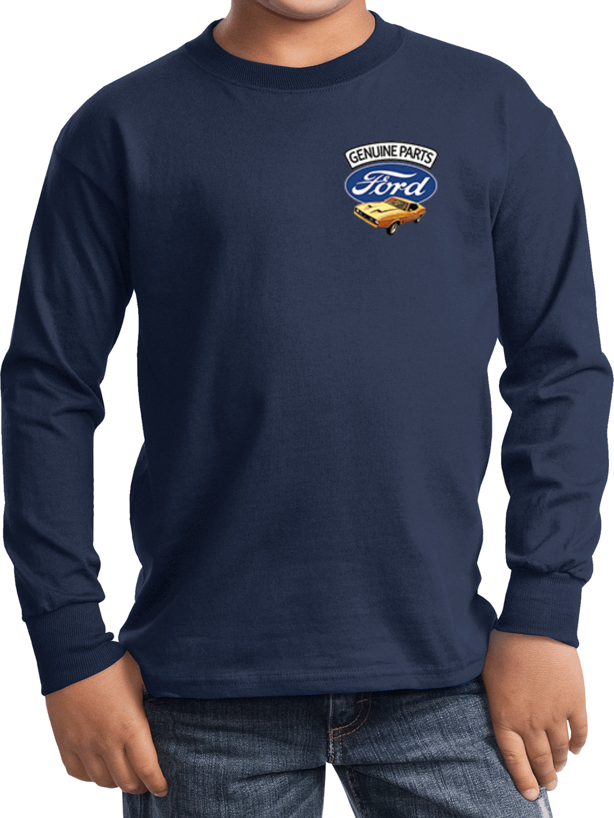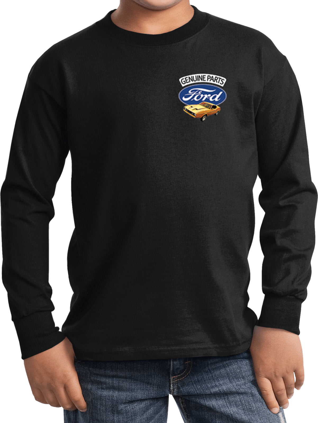 - A youth long sleeve featuring a classic Ford Mustang Genuine Parts design