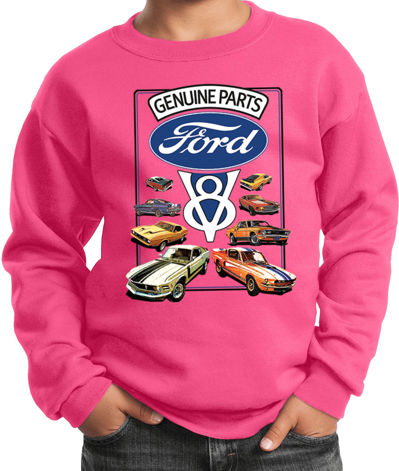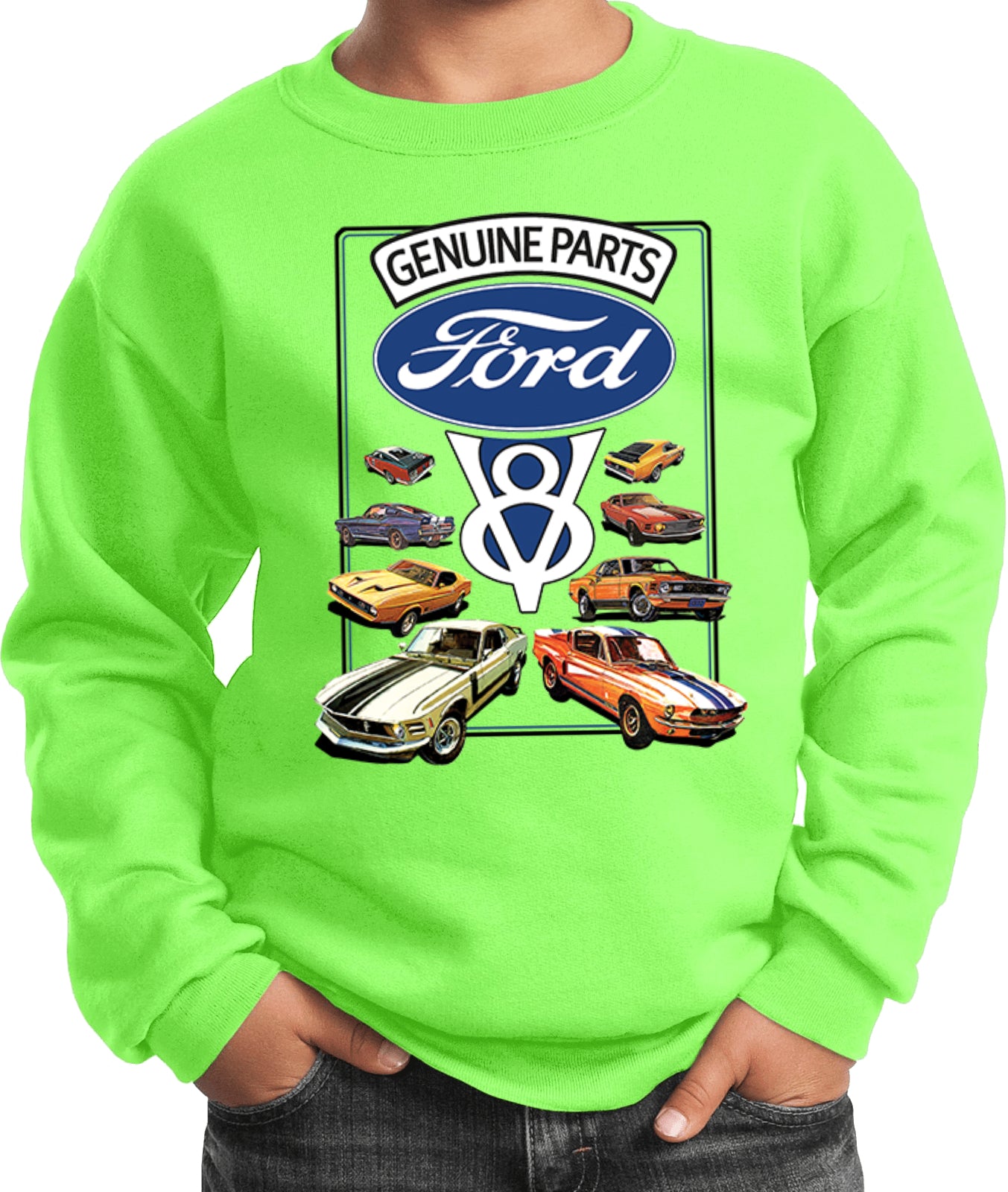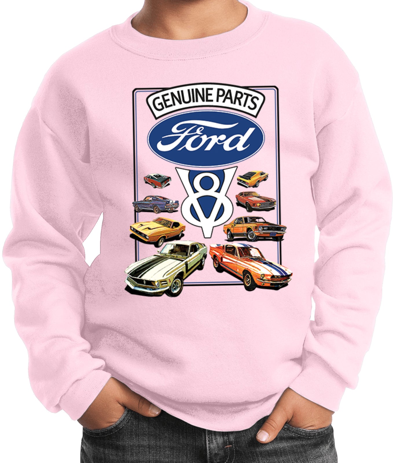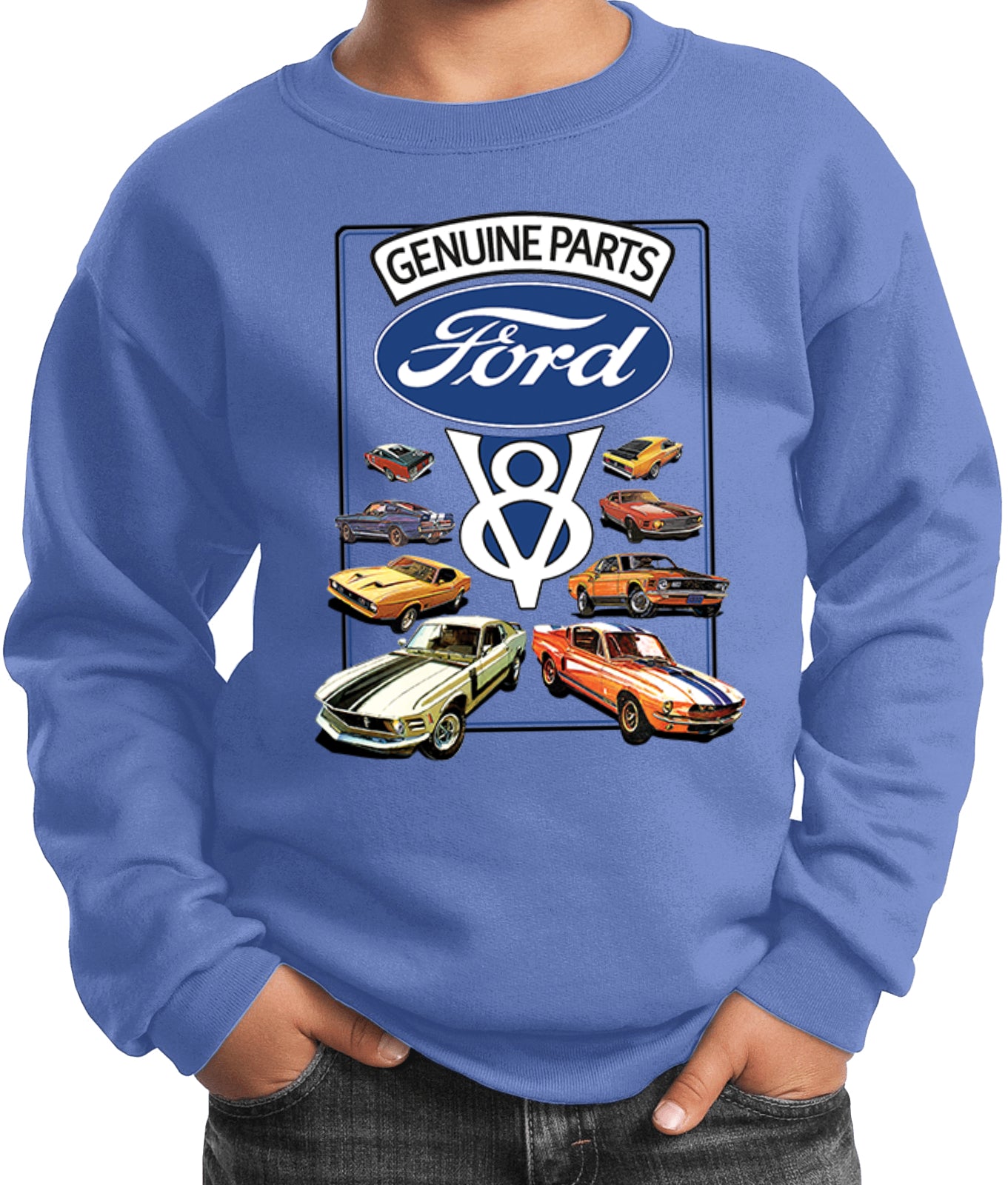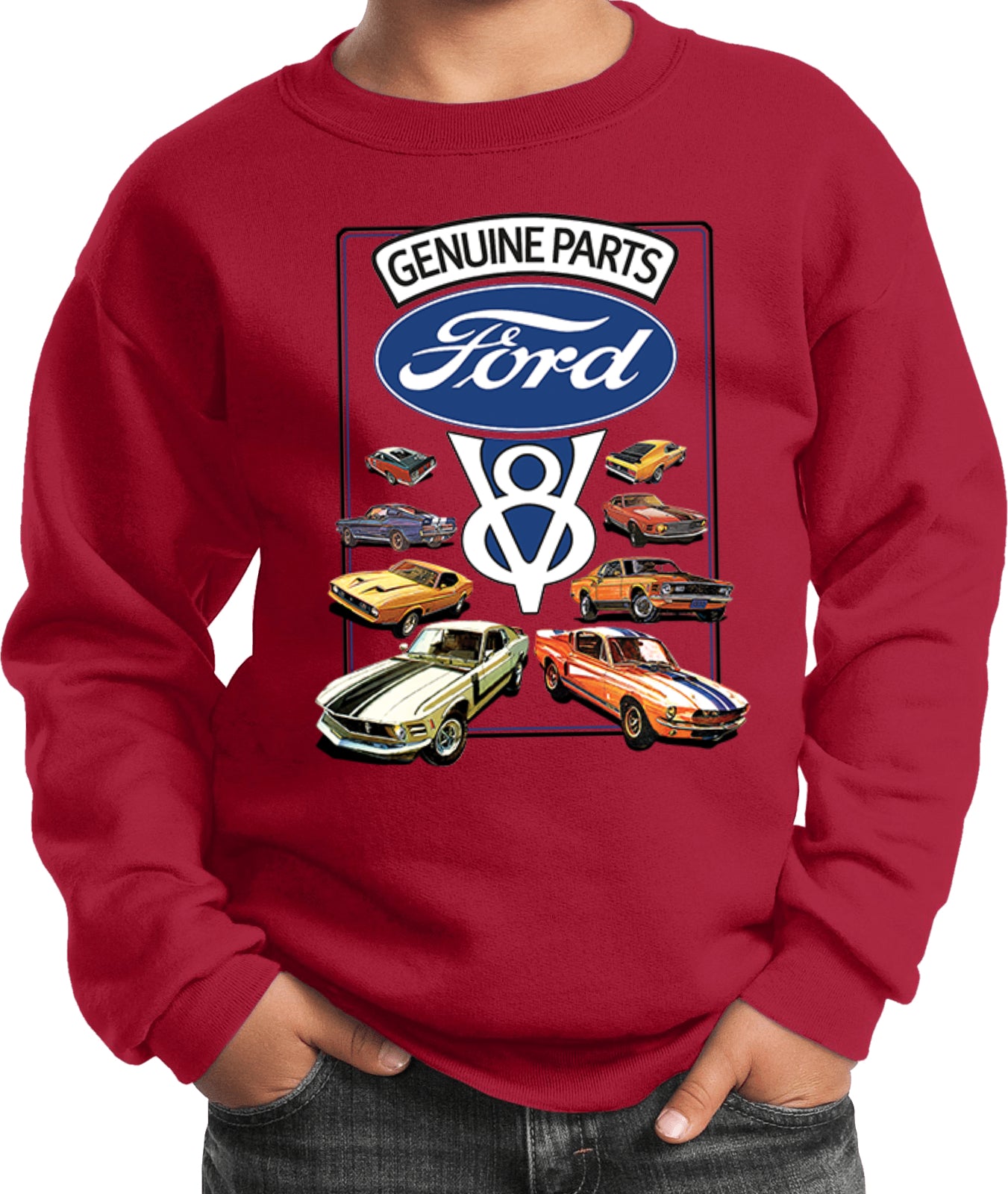 - A youth sweatshirt featuring a collection of classic Ford Mustangs: Genuine Parts V8