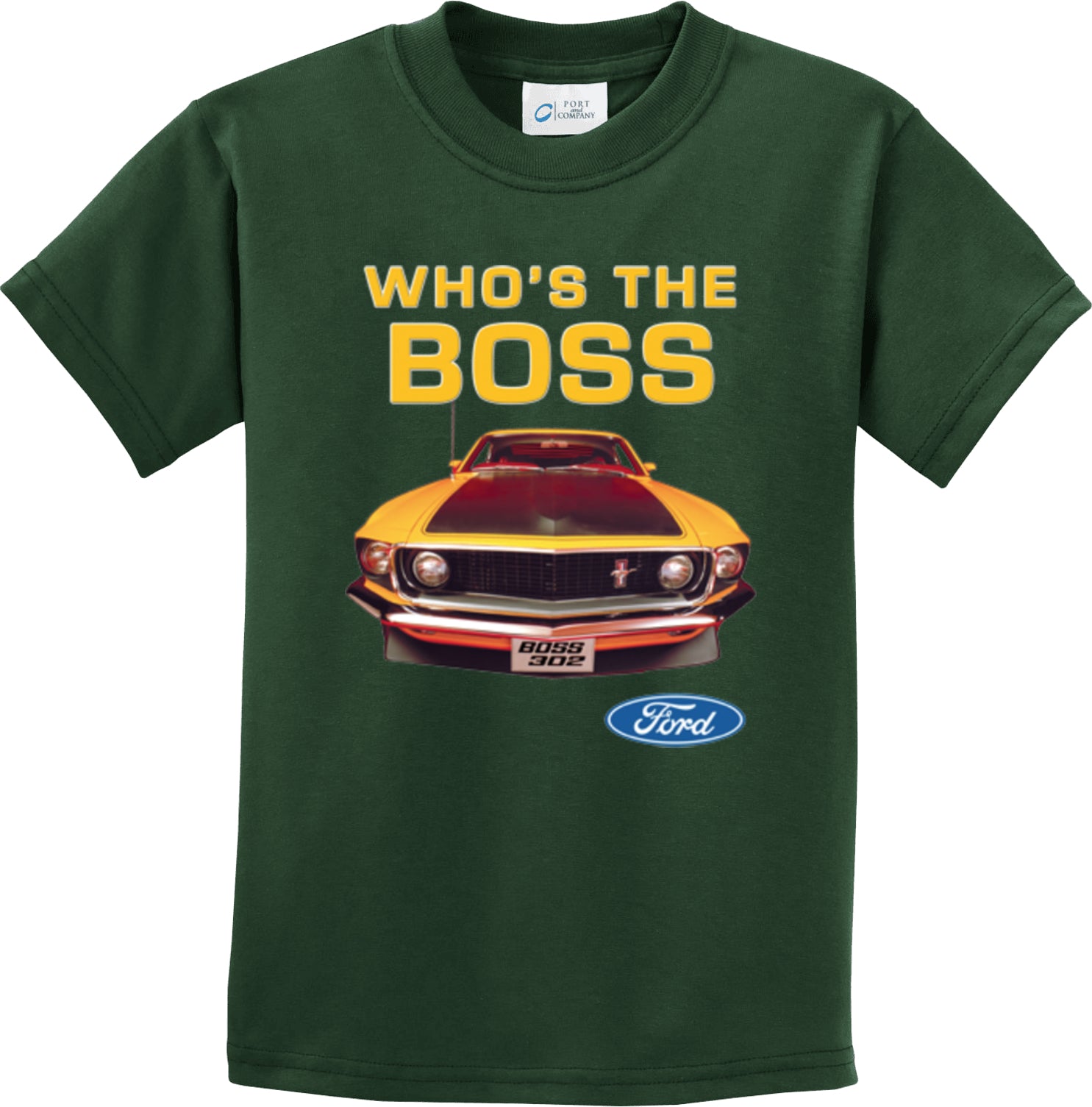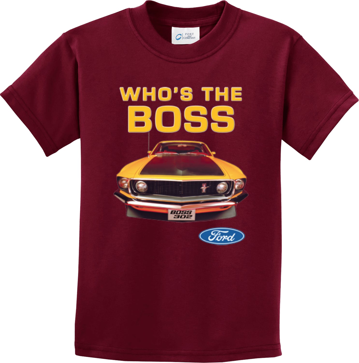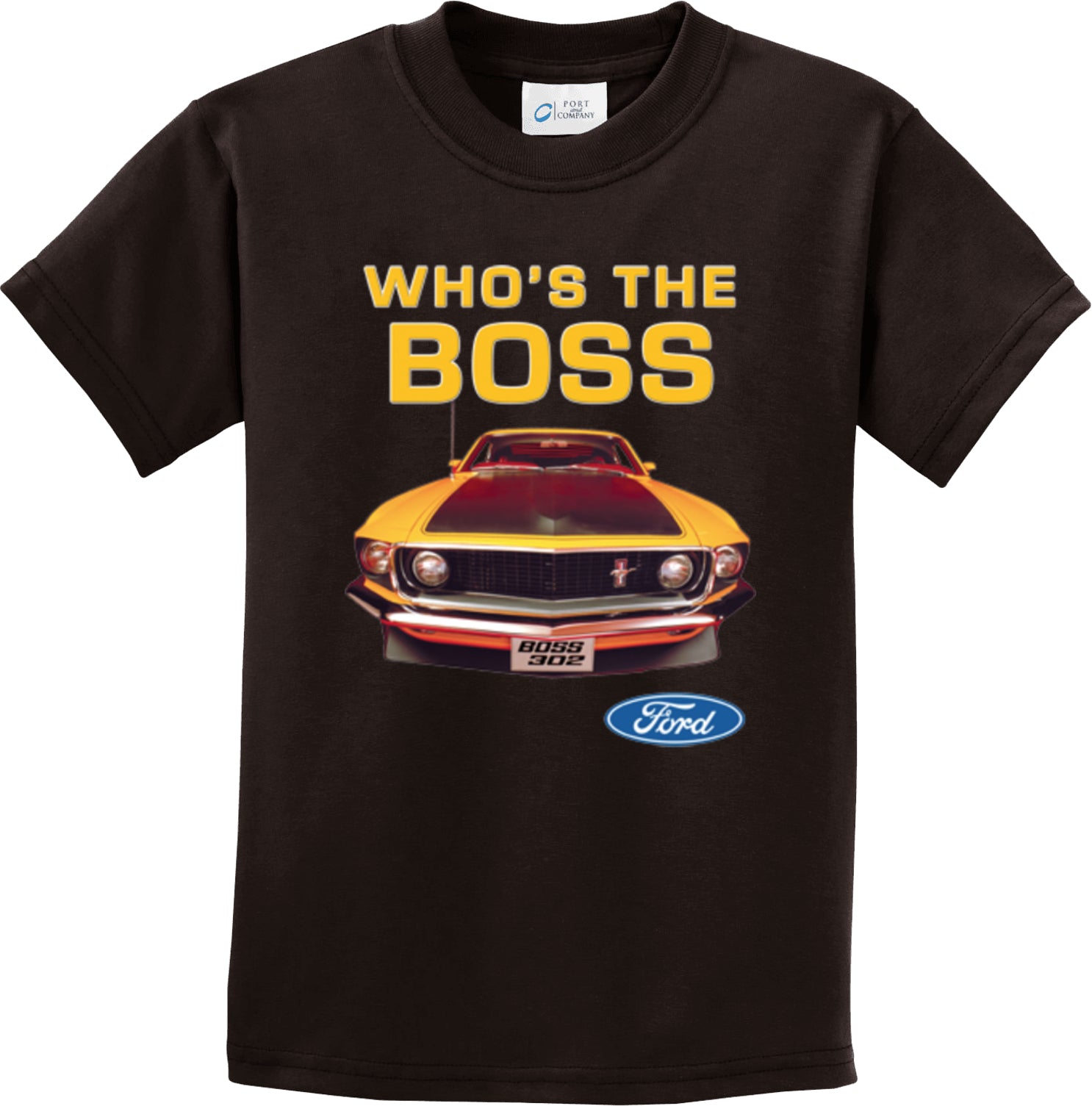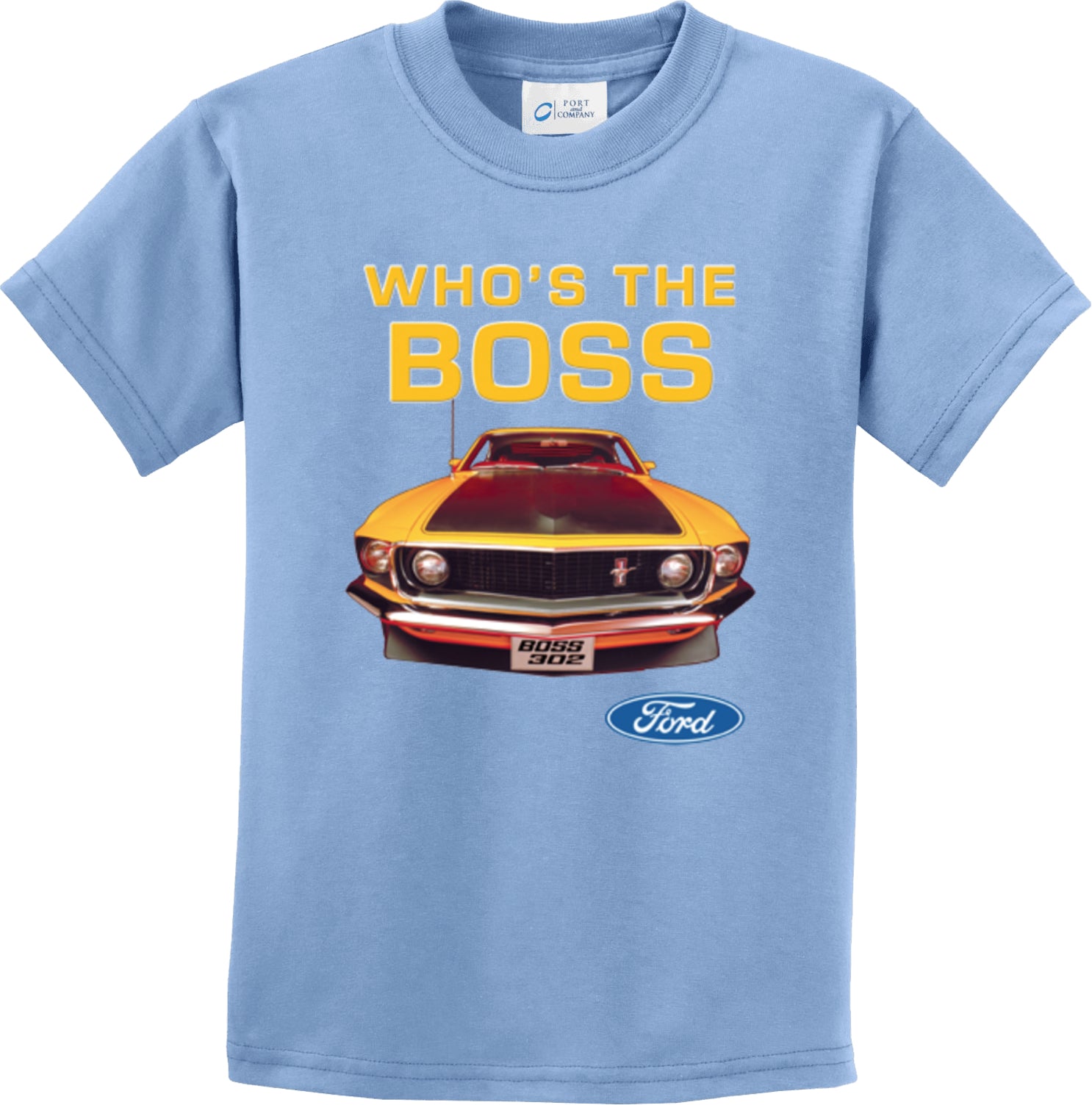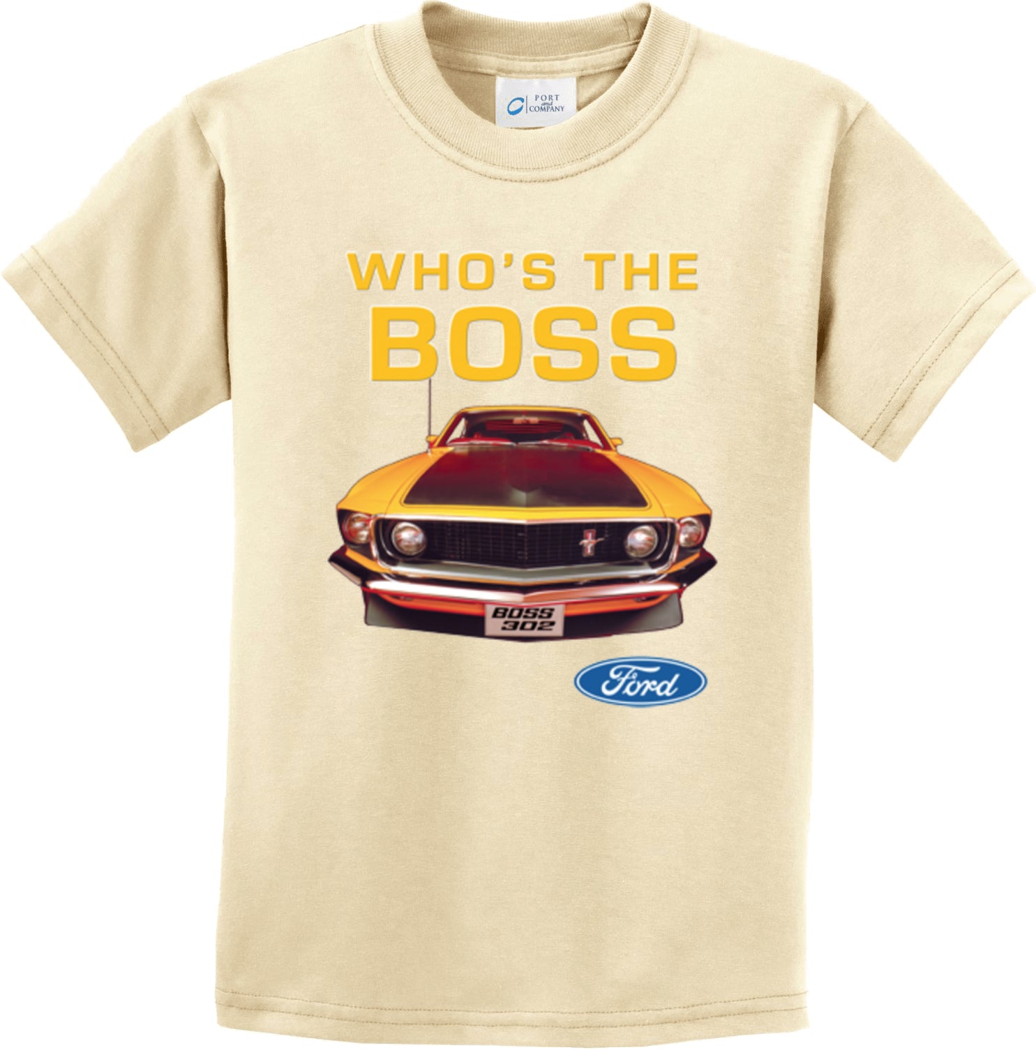• A youth t-shirt featuring a yellow Ford Mustang Boss 302: Who's The Boss