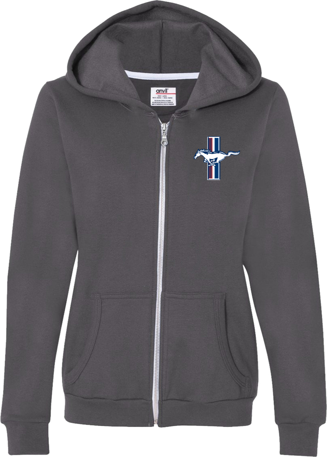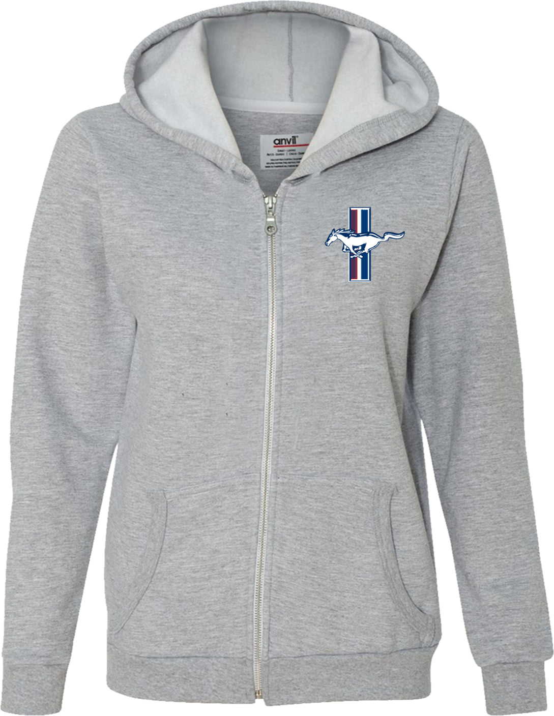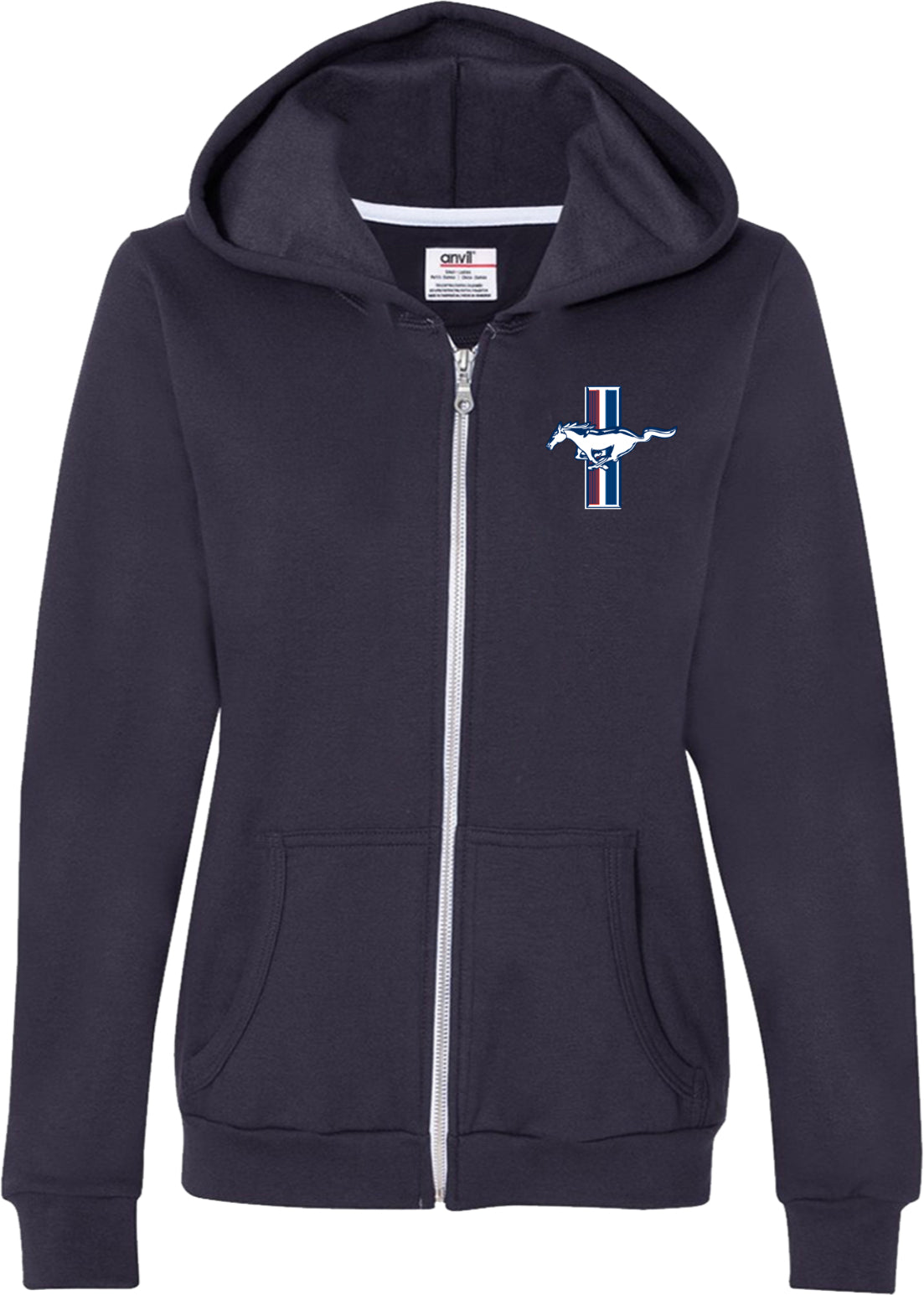 - A ladies full zip hoodie featuring a Ford Mustang Tri Bar logo as a pocket print