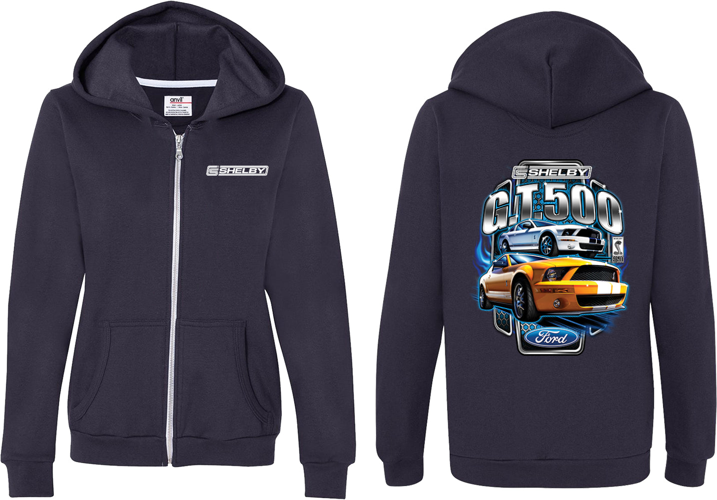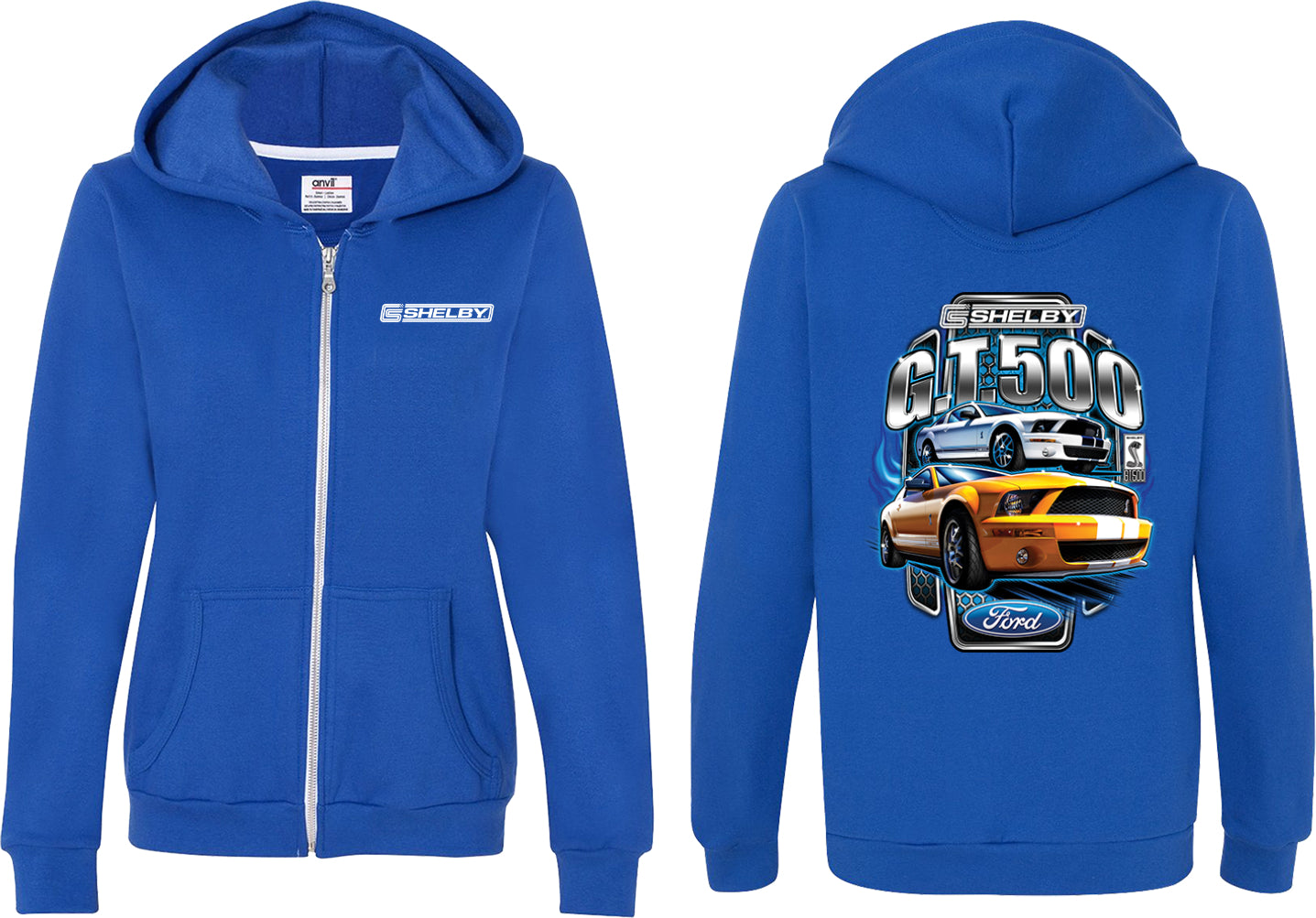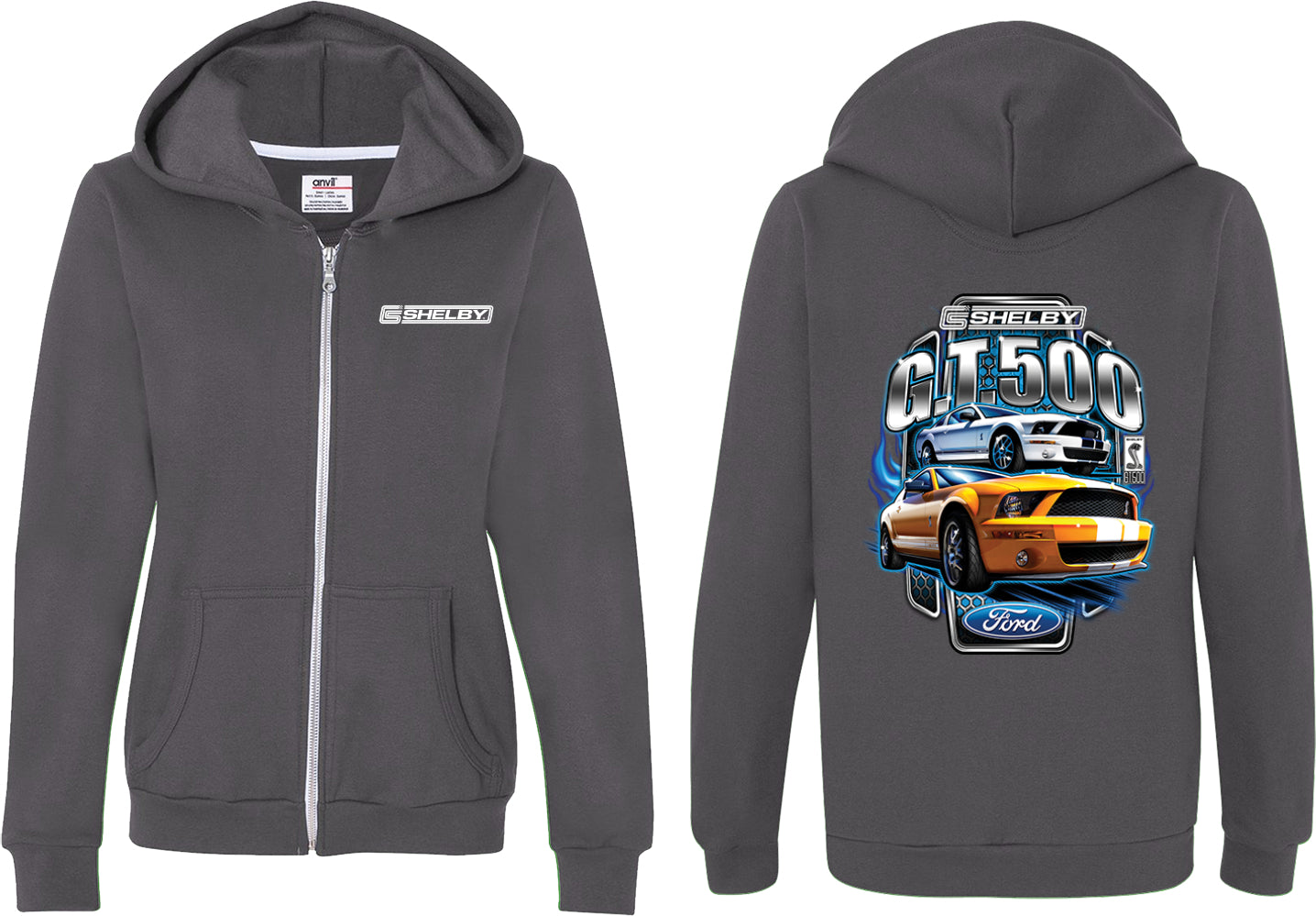 - A ladies Ford full zip hoodie featuring the Shelby logo on the front and a yellow and white Mustang Shelby GT500 on the back