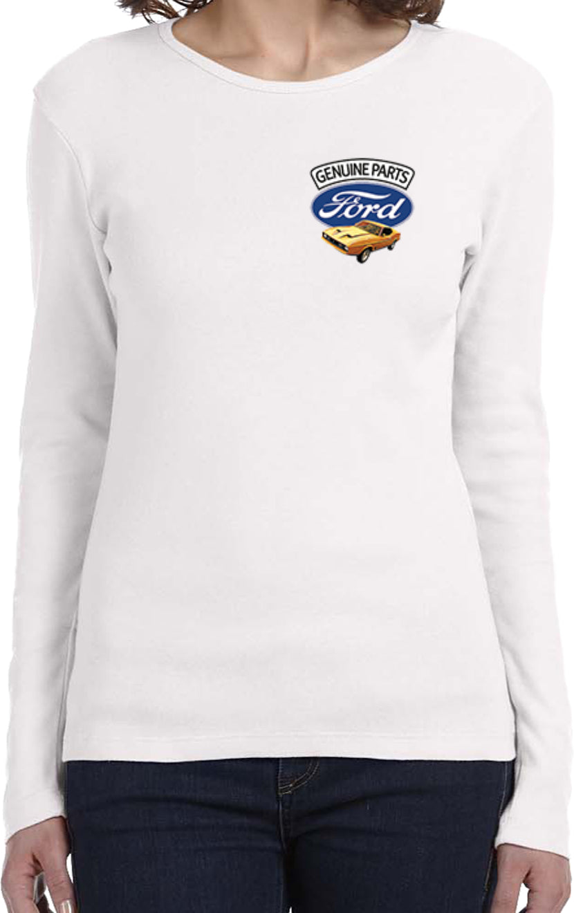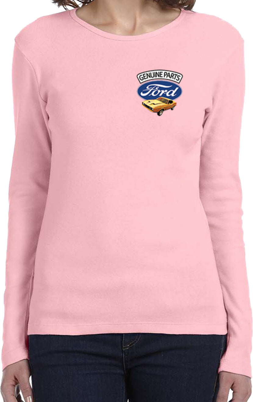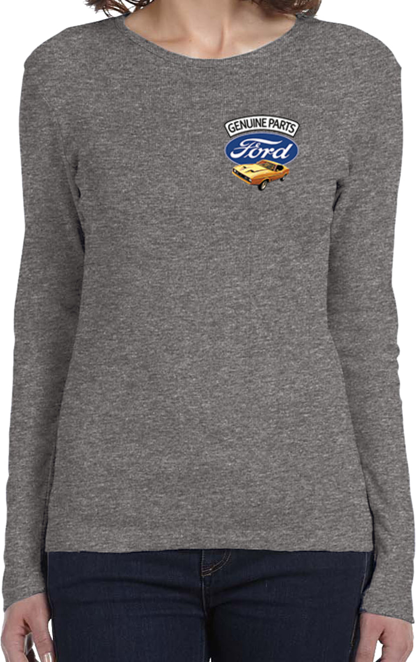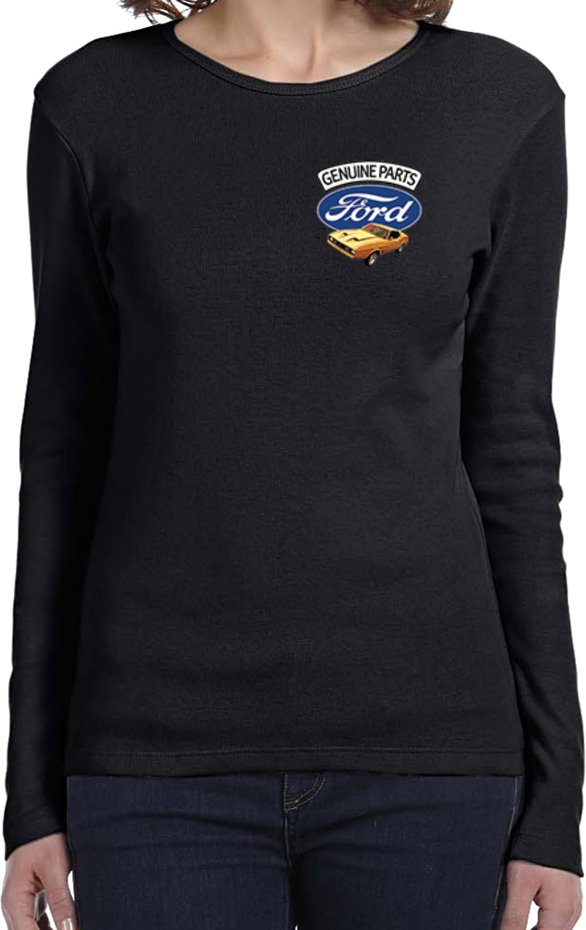 - A ladies long sleeve featuring a classic Ford Mustang Genuine Parts design