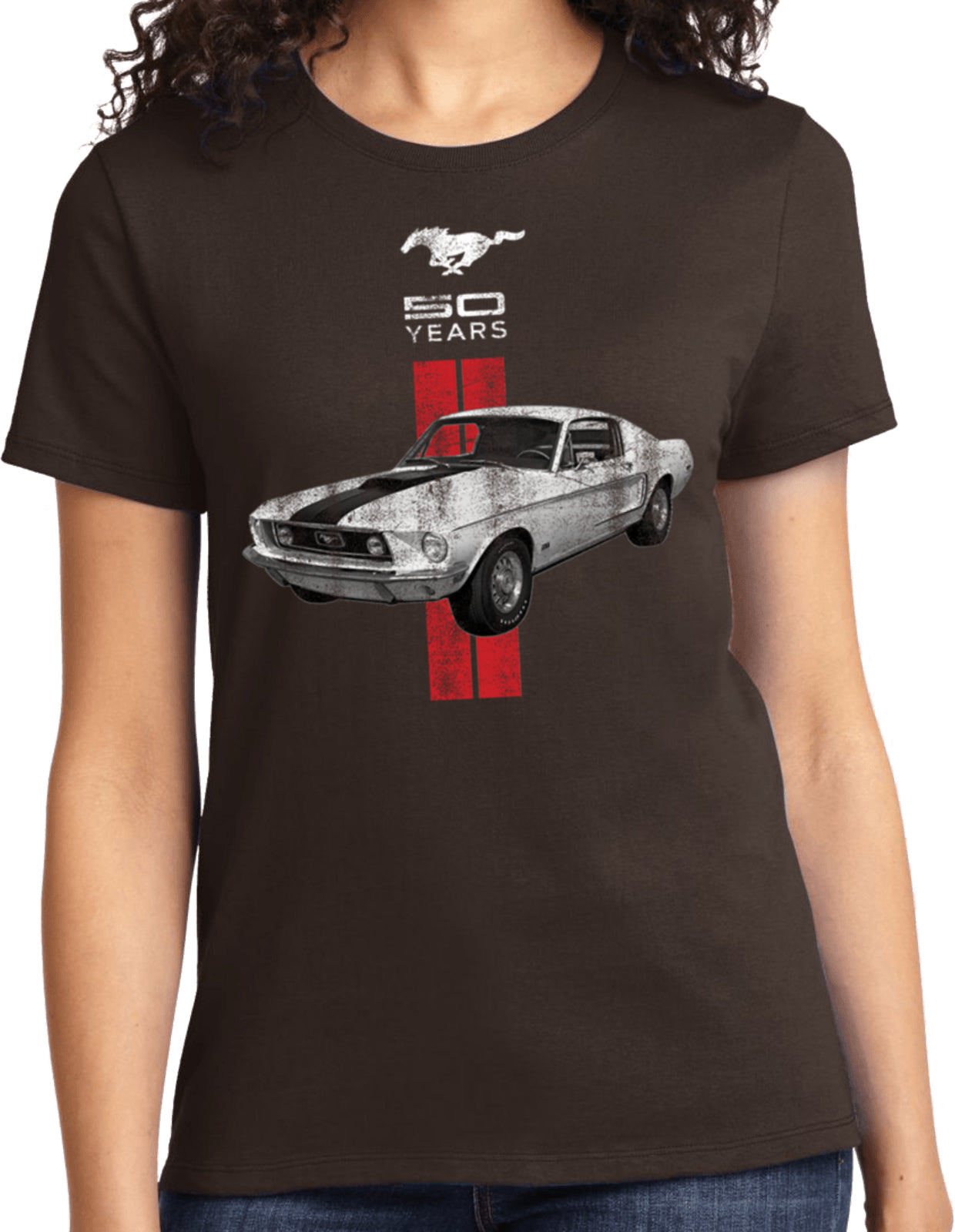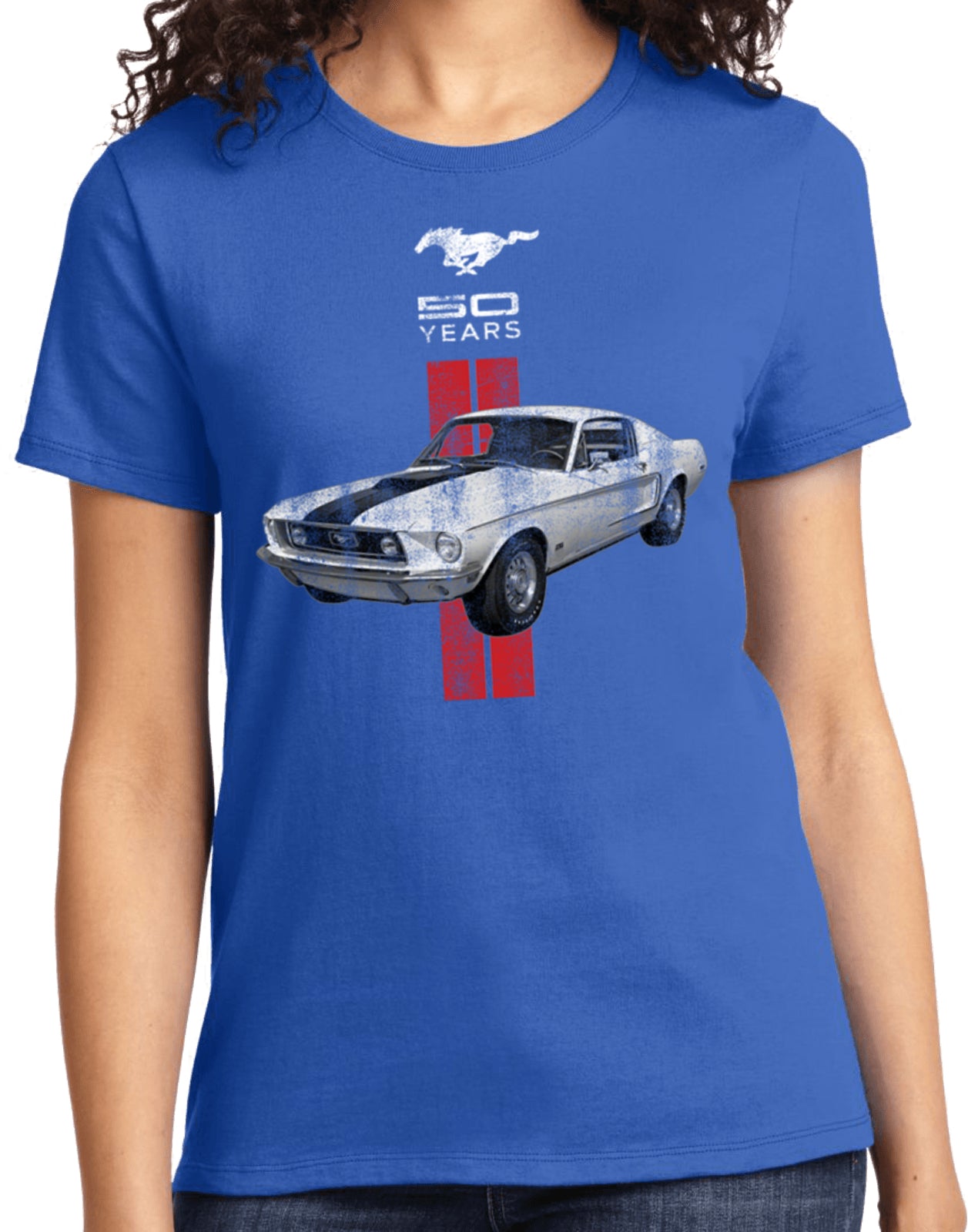 - A ladies t-shirt featuring a distressed Ford Mustang 50 Years design