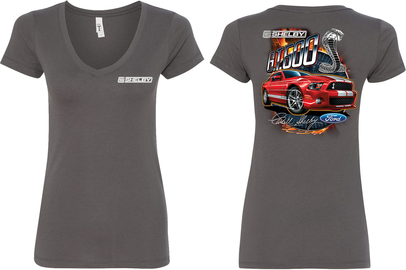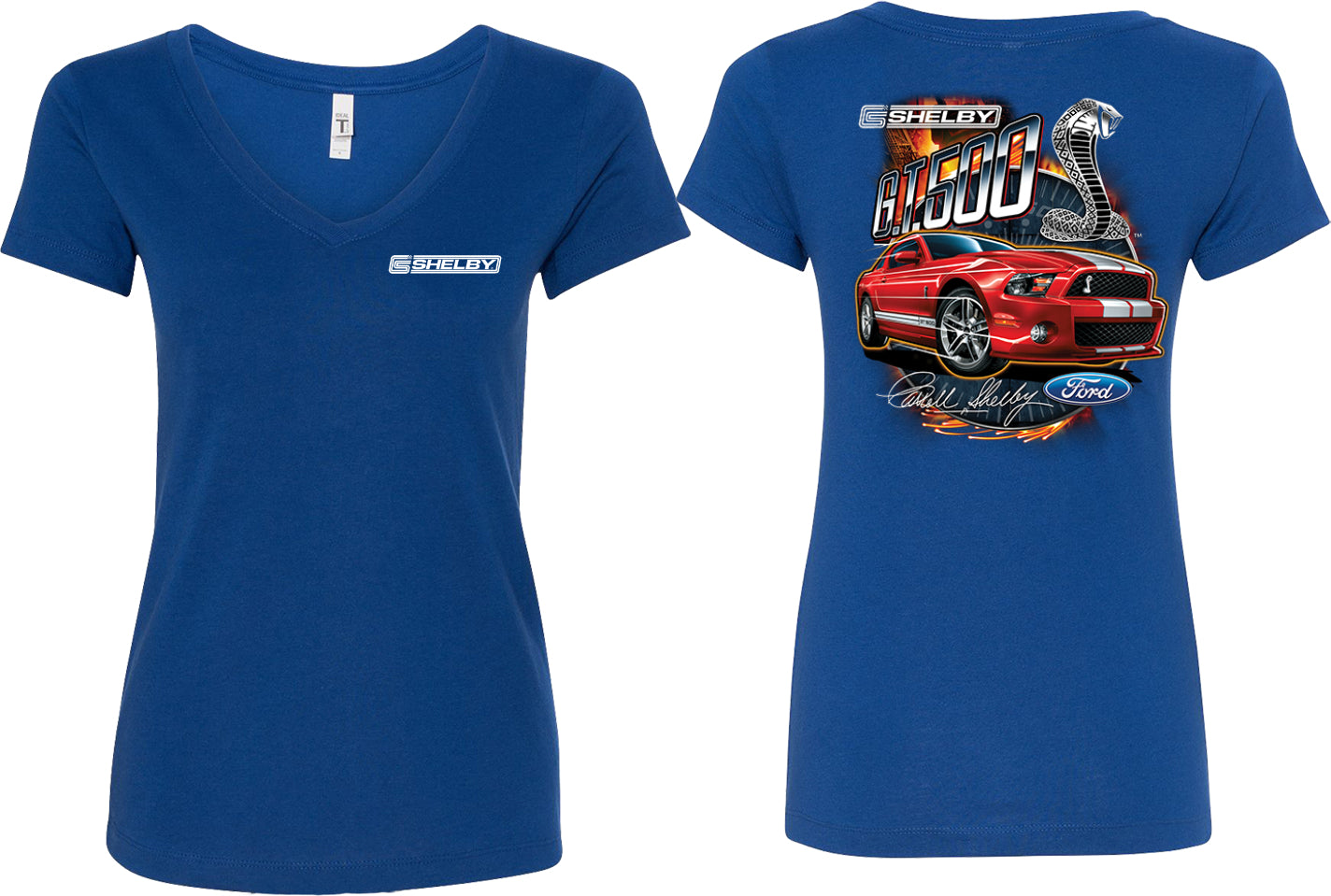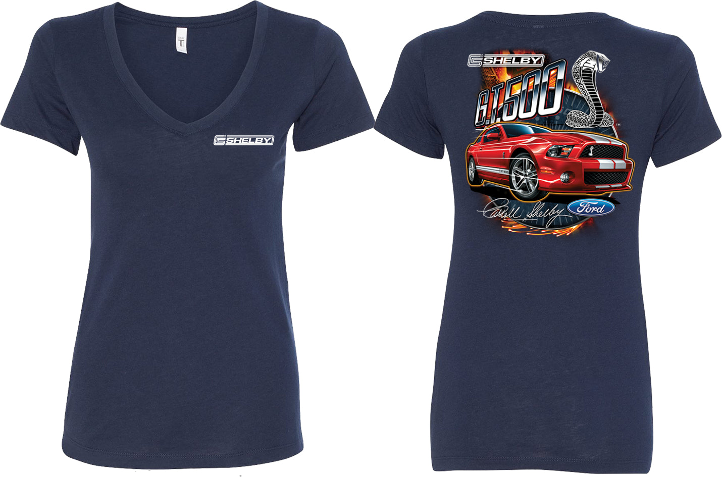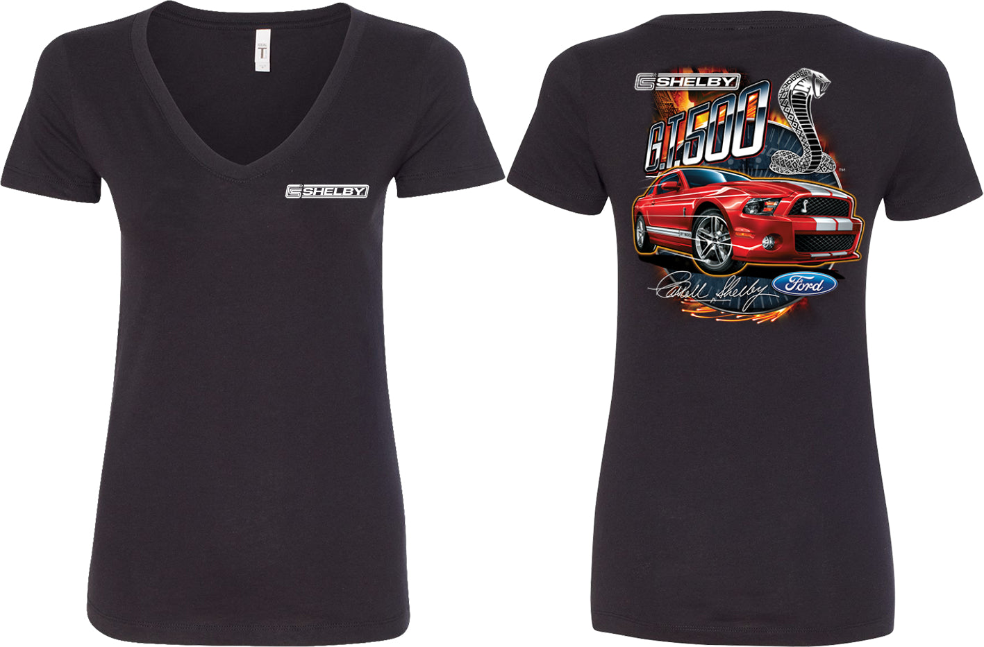 - A ladies Ford v-neck featuring the Shelby emblem on the front and a red Mustang Shelby GT500 on the back