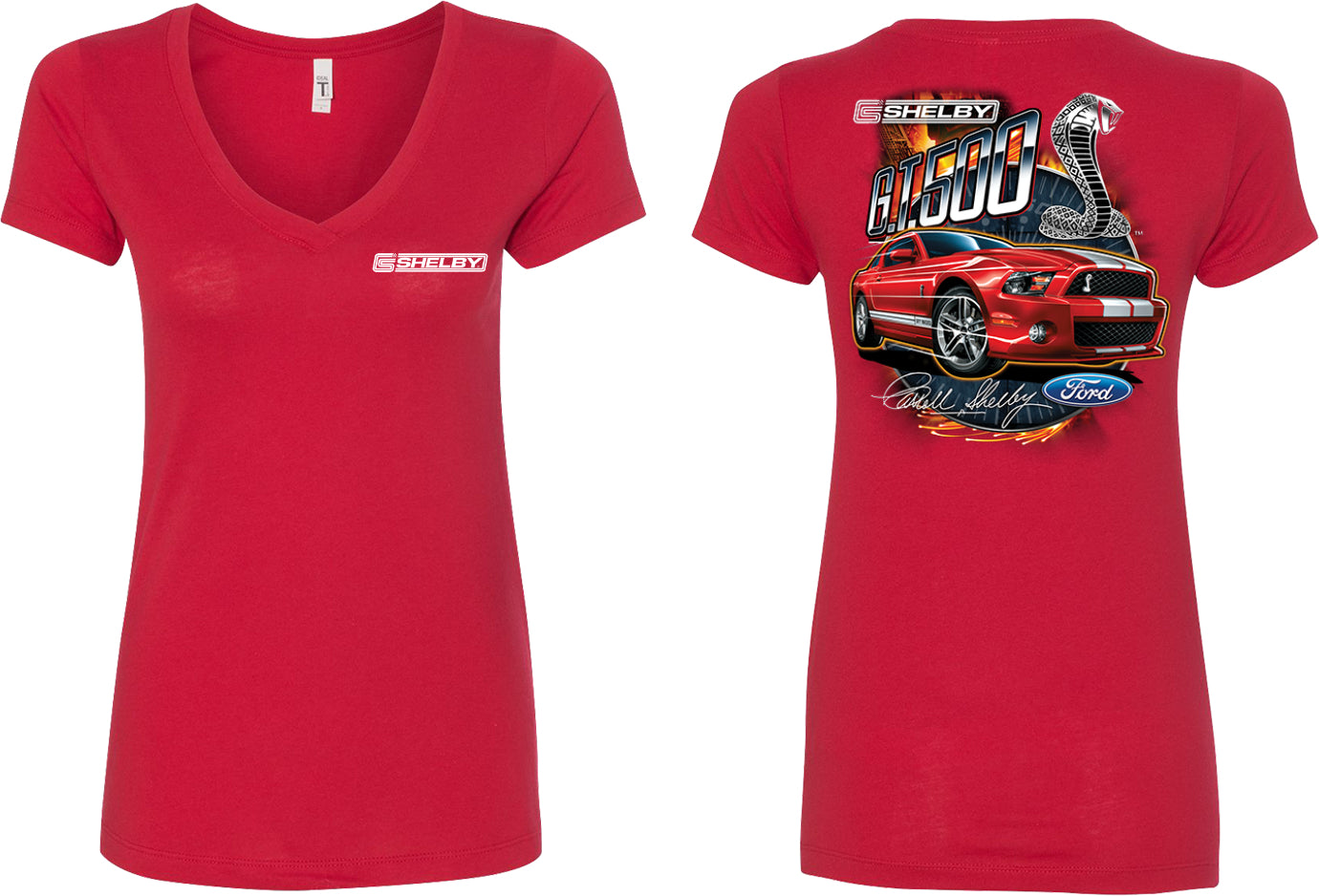 Ladies Ford Mustang V-Neck Shirt Red Shelby GT500 Front and Back