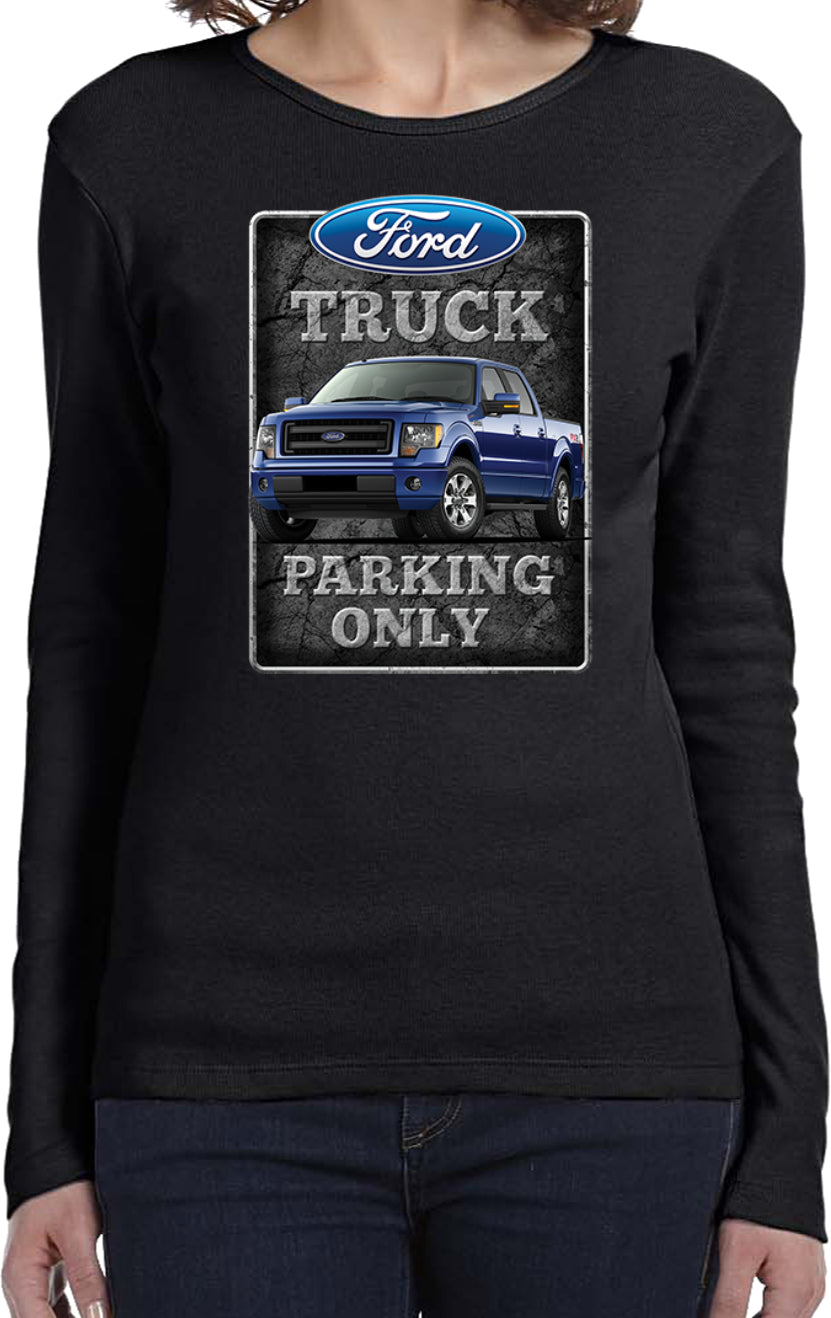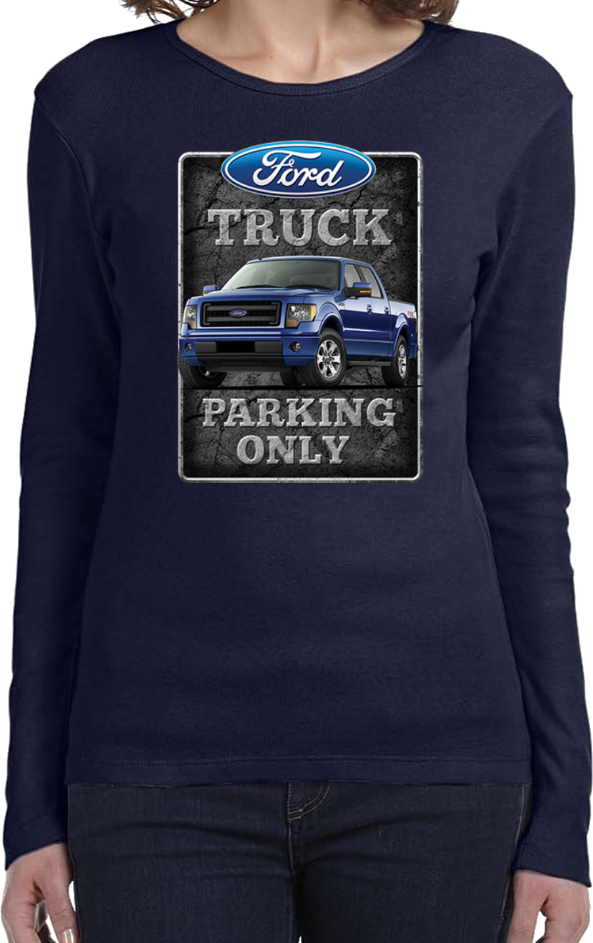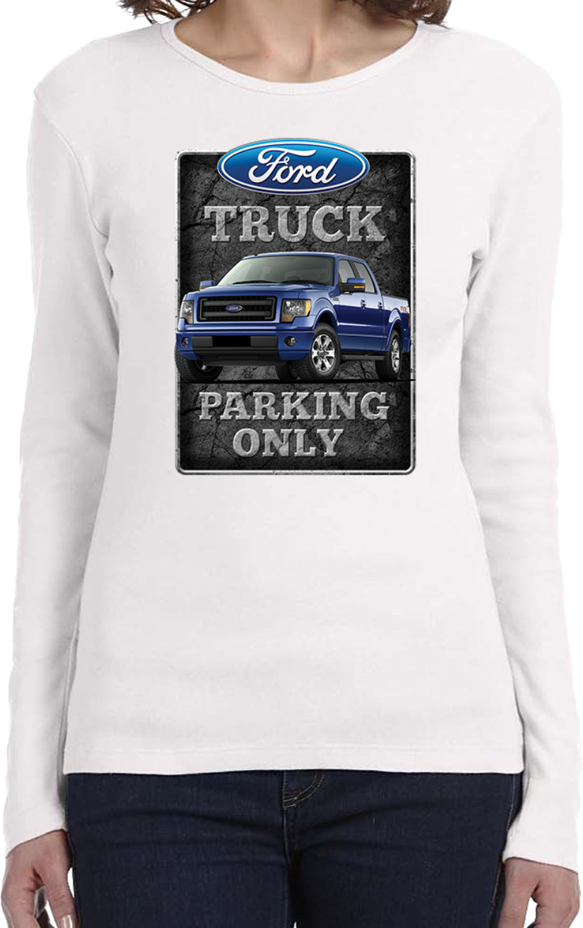 - A ladies long sleeve shirt featuring a blue Ford F-150 garage sign: Ford Truck Parking Only