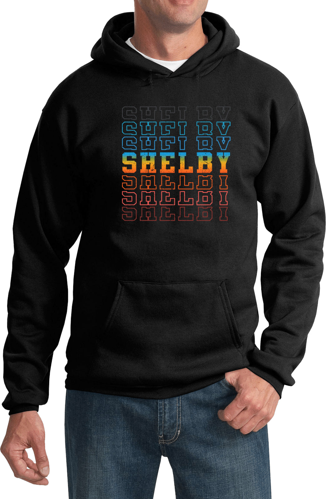 A Shelby pullover hooded sweatshirt with a kangaroo pouch pocket that fits both men and women with its traditional silhouette. Made from a comfortable blend of cotton/polyester. The hoodie features a vintage and colorful design of Shelby repeated. This hoodie makes the perfect gift for car enthusiast.