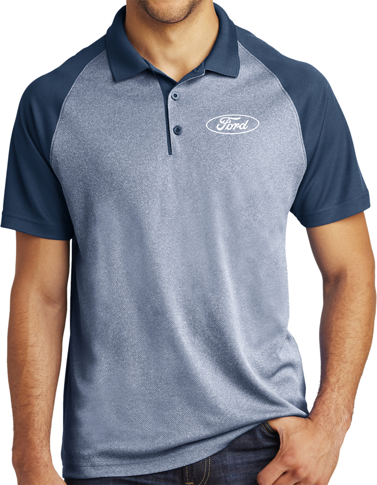 A mens raglan polo shirt featuring a white classic ford emblem. Our polo is made of 100% polyester moisture wicking material to keep you cool all day. It has color block raglan sleeves and a tag free label to add to the comfort. It makes a great gift and collectible for birthdays, holidays and even to treat yourself. Ford enthusiast will be sure to love this classic Ford logo tee.