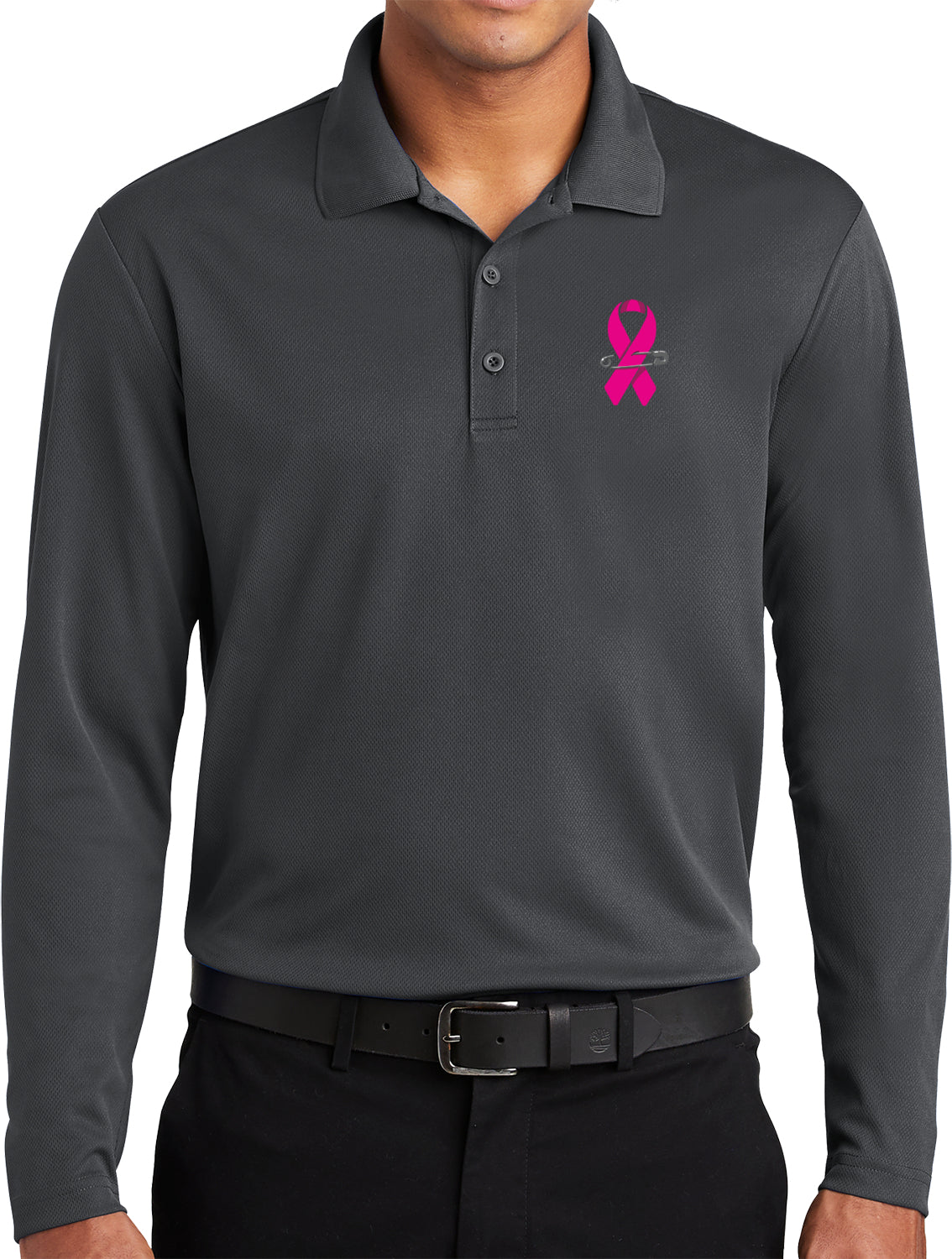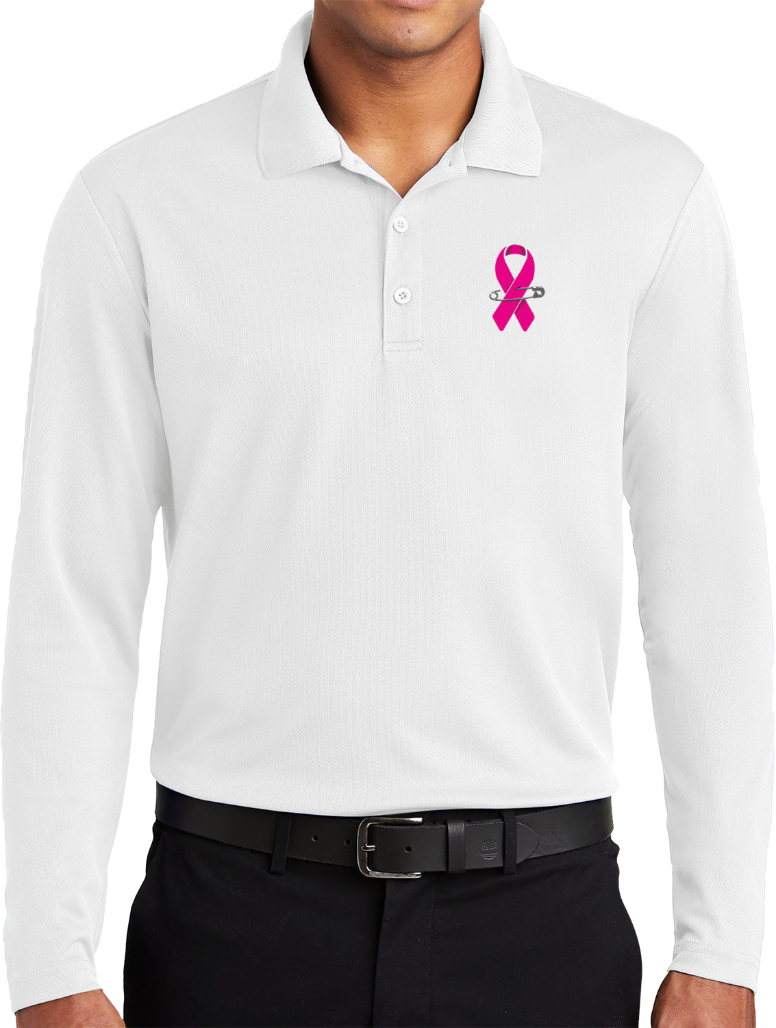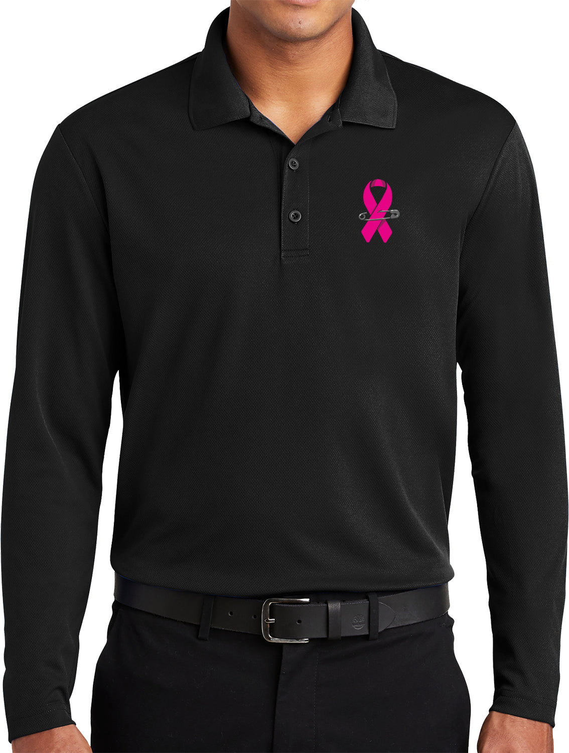 • A mens long sleeve polo shirt featuring a breast cancer awareness pink ribbon pin