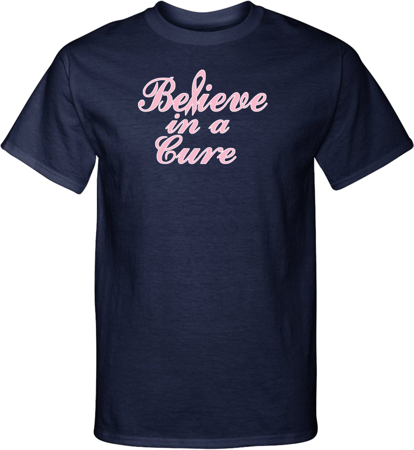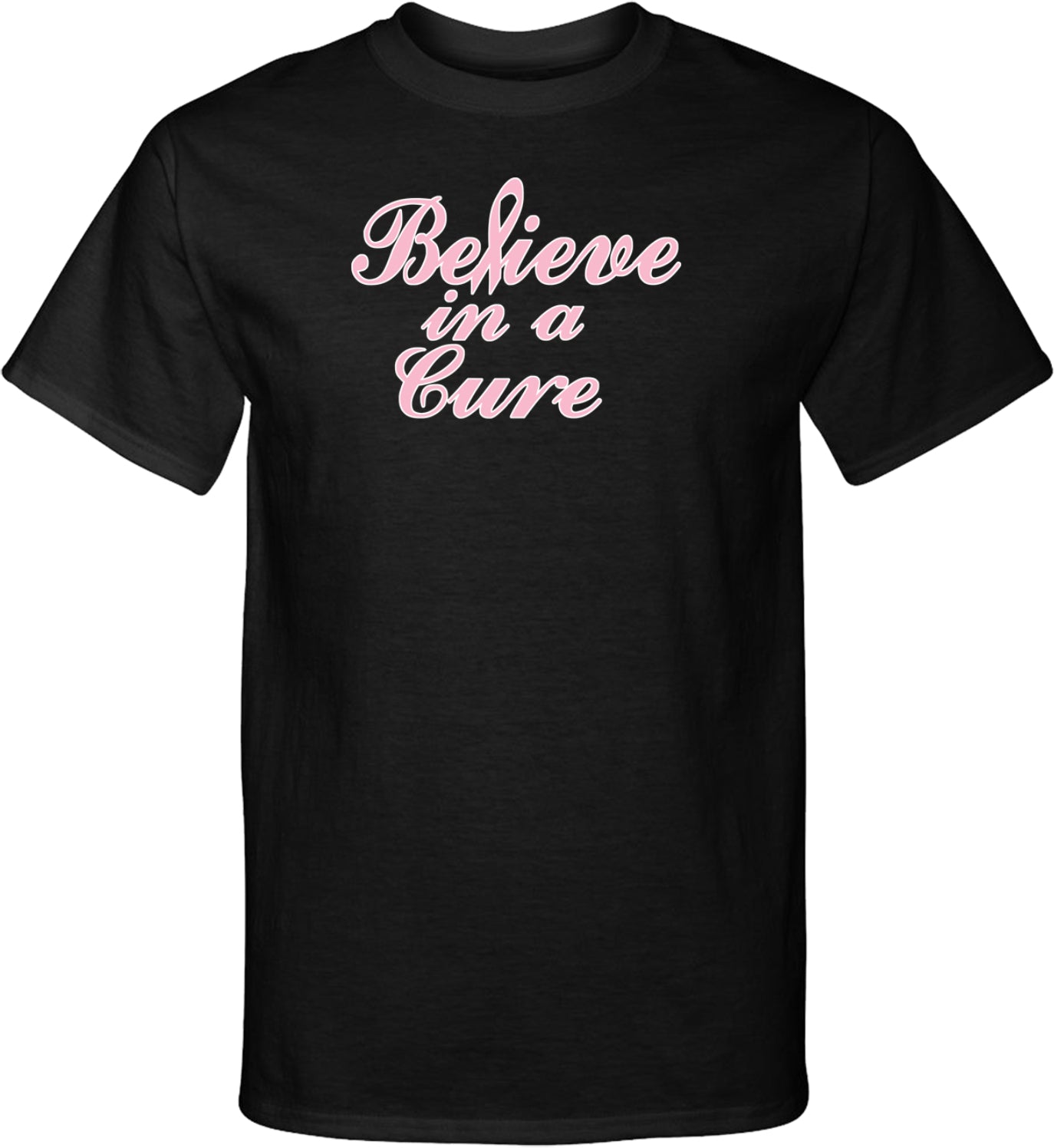 - A mens tall t-shirt featuring a breast cancer awareness design: Believe in a Cure
