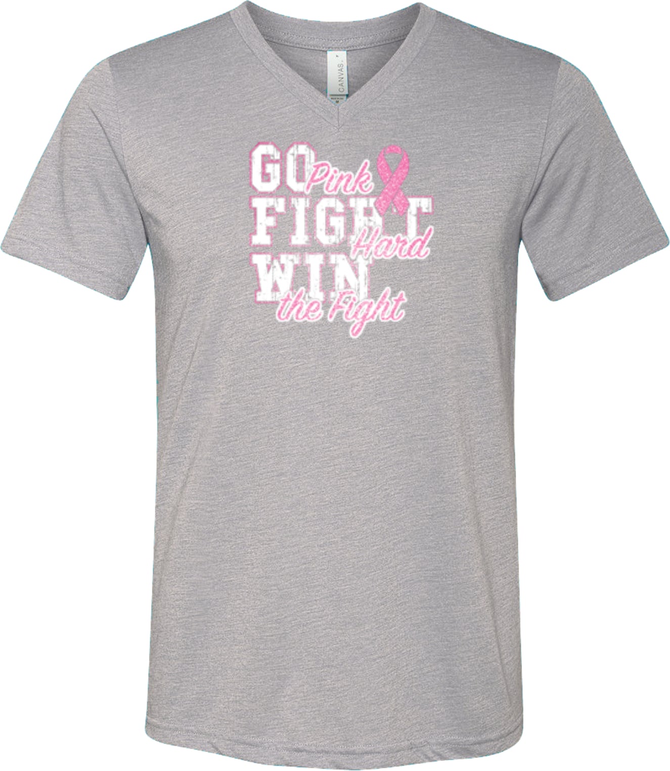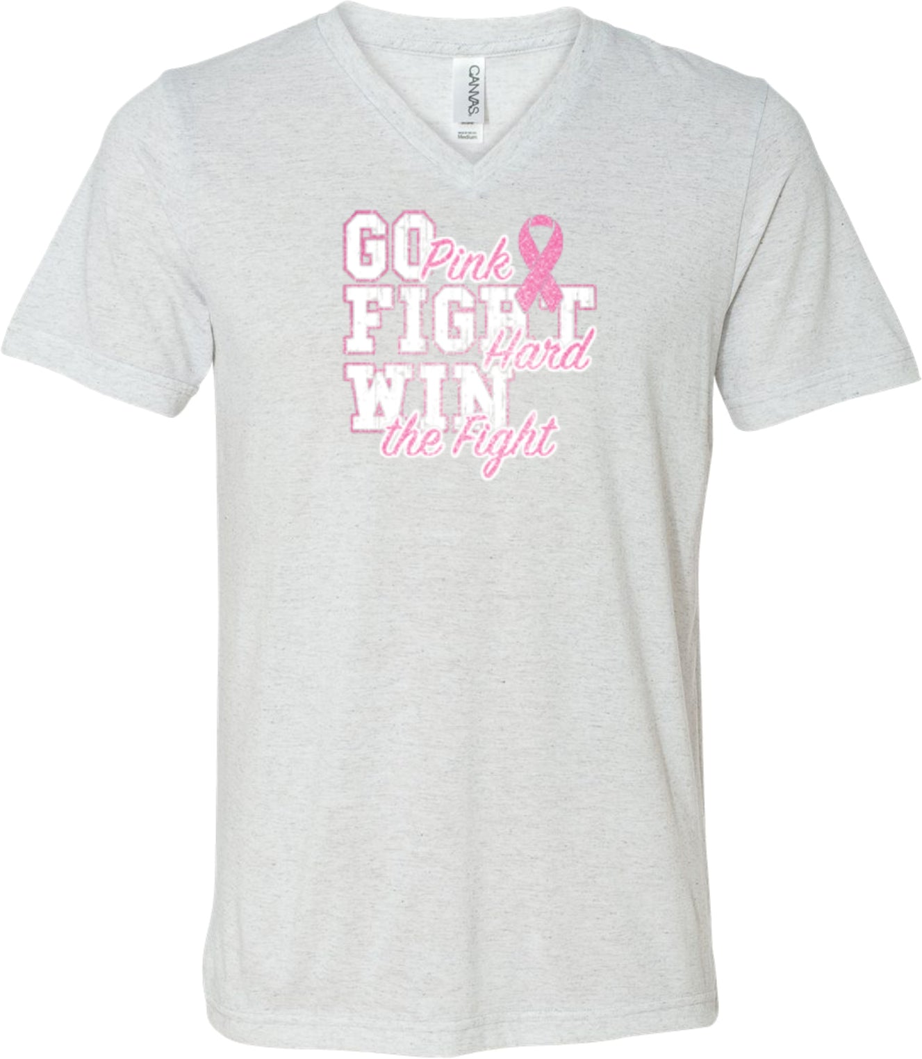 - A mens tri blend v-neck shirt featuring a breast cancer awareness design: Go Pink, Fight Hard, Win the Fight