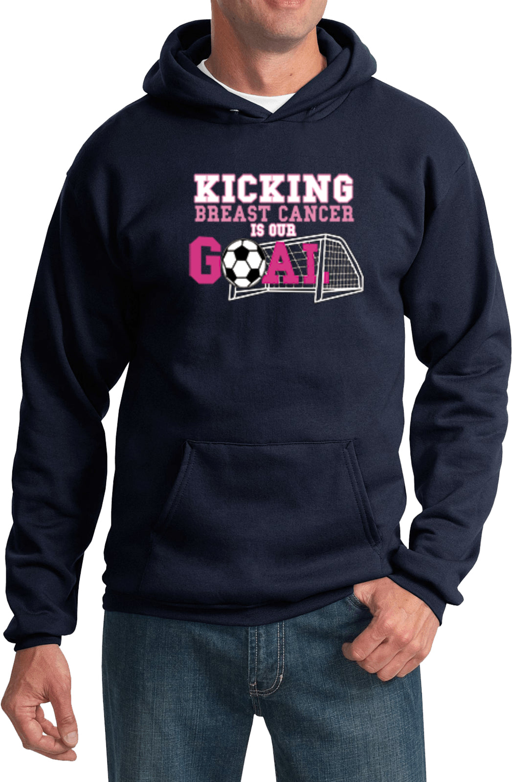 - A breast cancer hoodie featuring a soccer inspired design: Kicking Breast Cancer is Our Goal