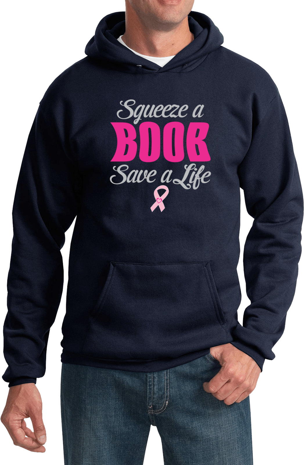 - A breast cancer awareness hoodie featuring Squeeze a Boob Save a Life