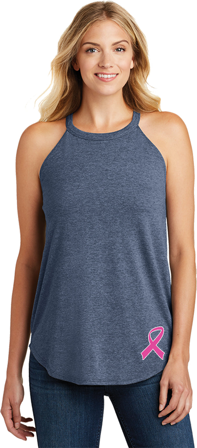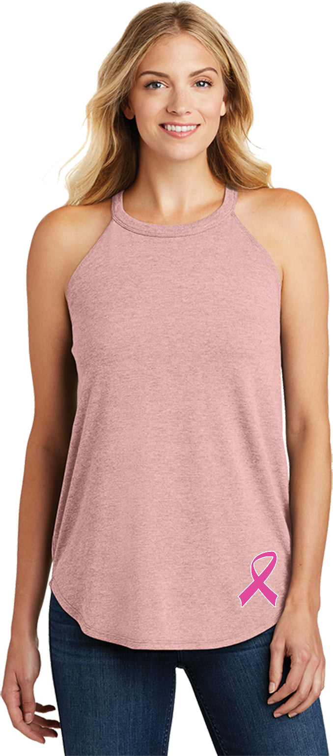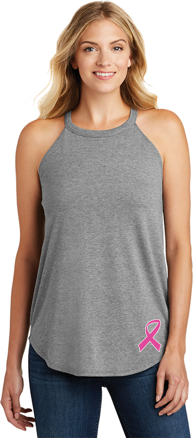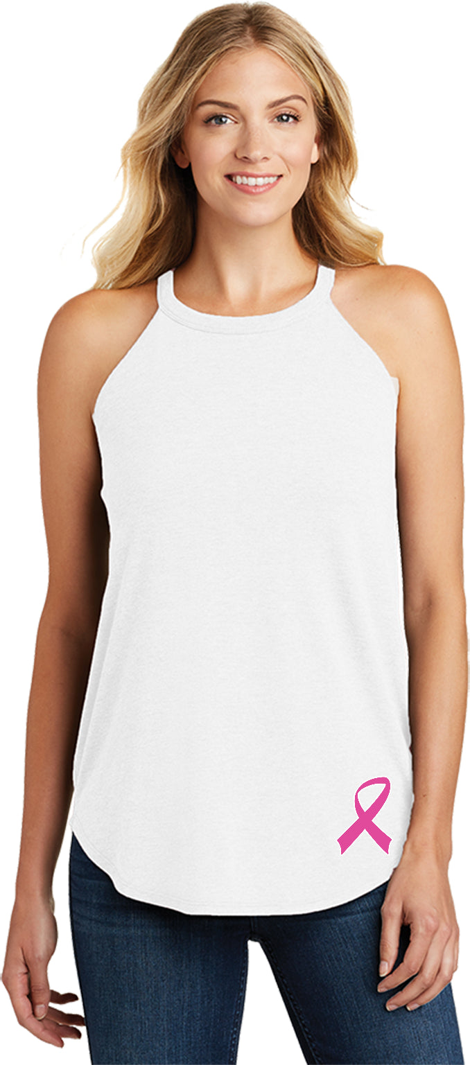 - A ladies tank top featuring a pink breast cancer awareness ribbon